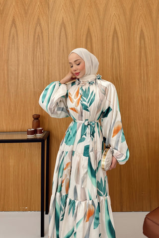 Yakası Çiçek Detaylı Desenli Saten Elbise Yeşil
