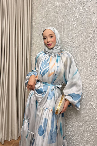 Yakası Çiçek Detaylı Desenli Saten Elbise Mavi