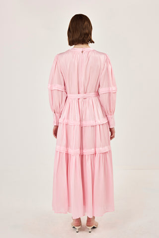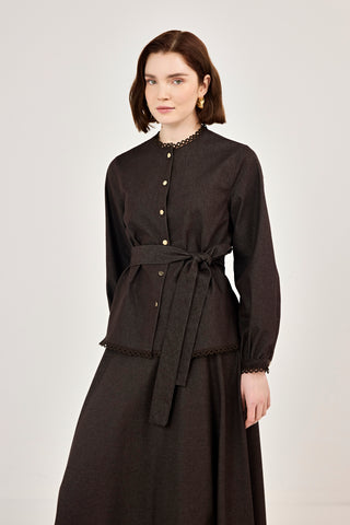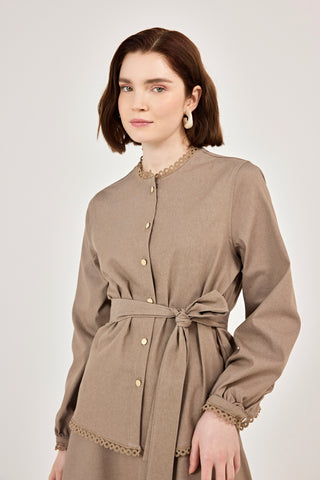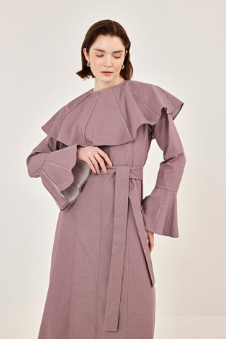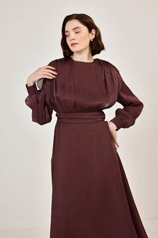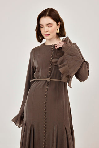 İnce Tensel Volan Detaylı Boydan Düğmeli Elbise Kahverengi