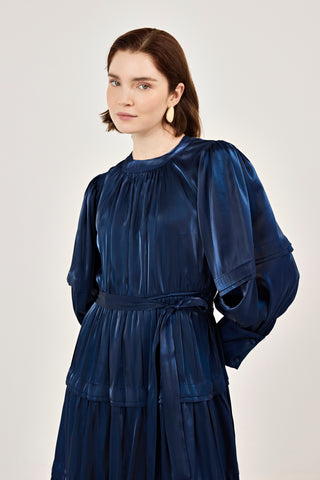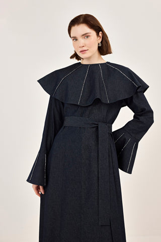 İnce Tensel Volan Detaylı Boydan Düğmeli Elbise Lacivert
