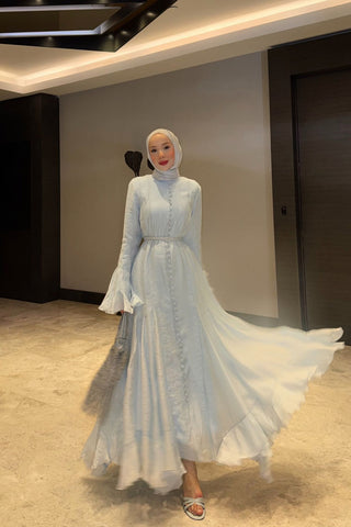 İnce Tensel Volan Detaylı Boydan Düğmeli Elbise Mavi