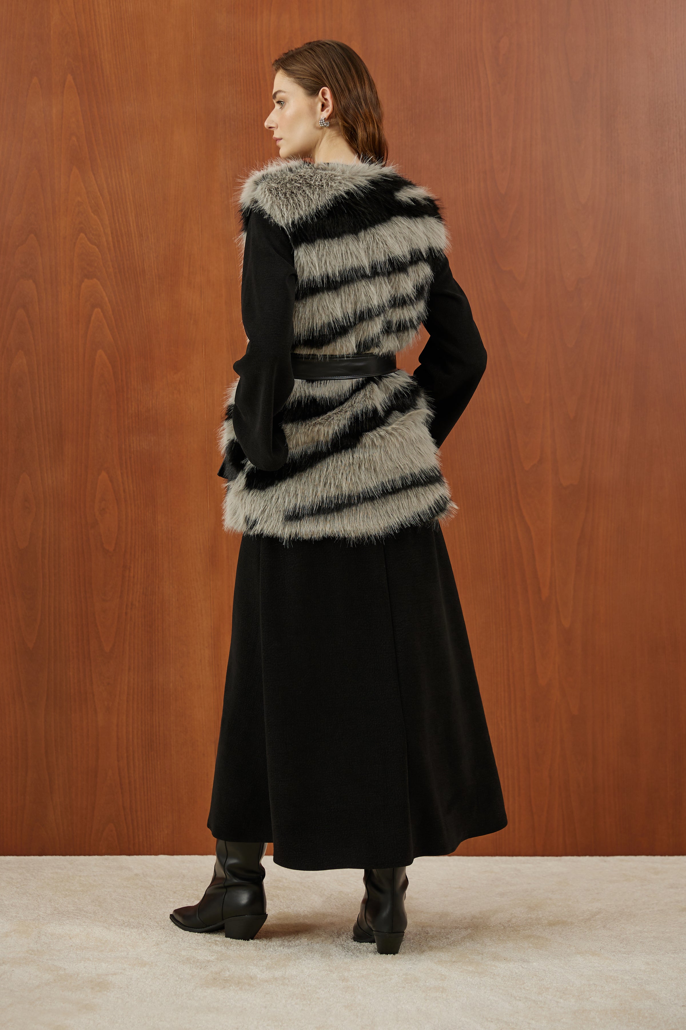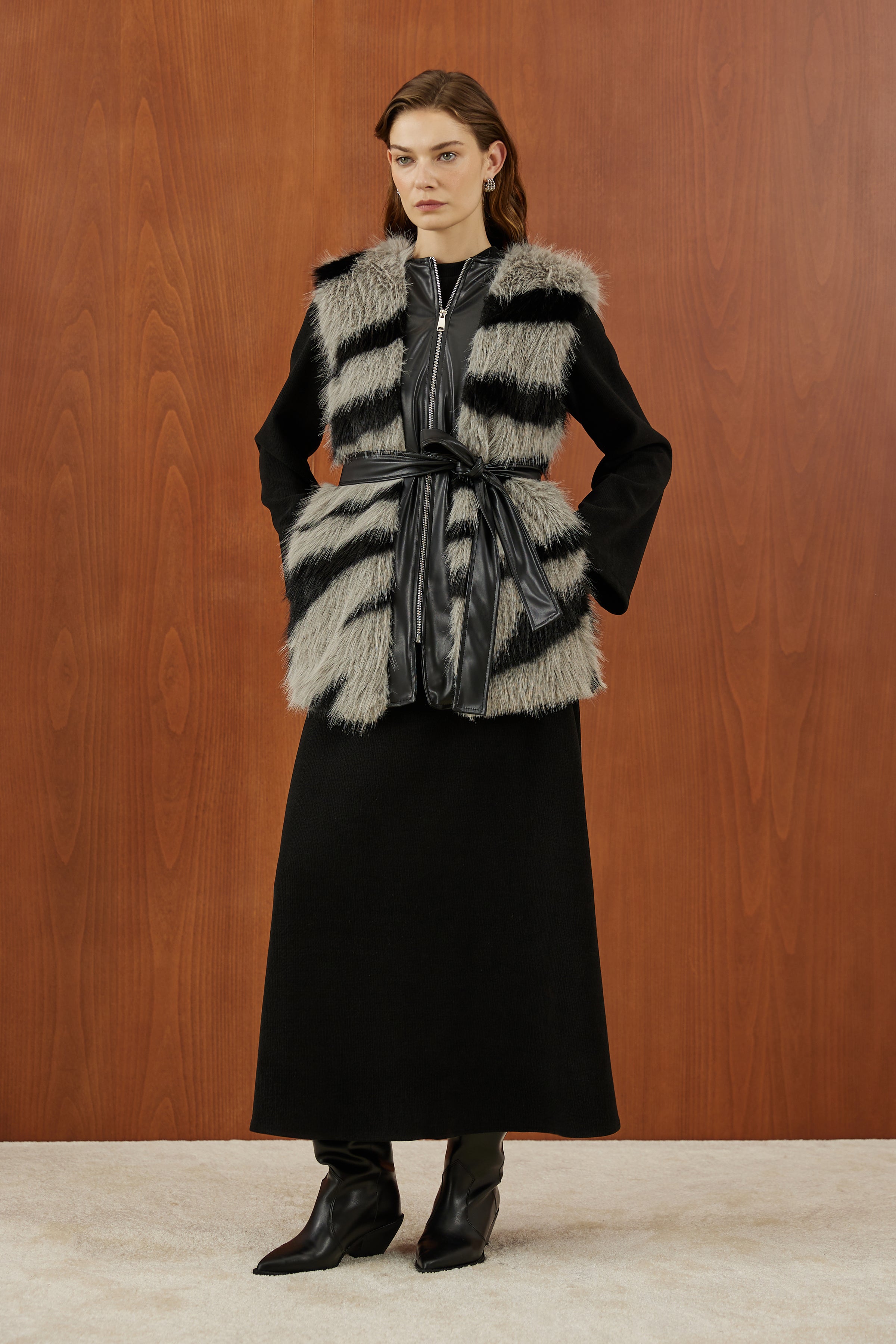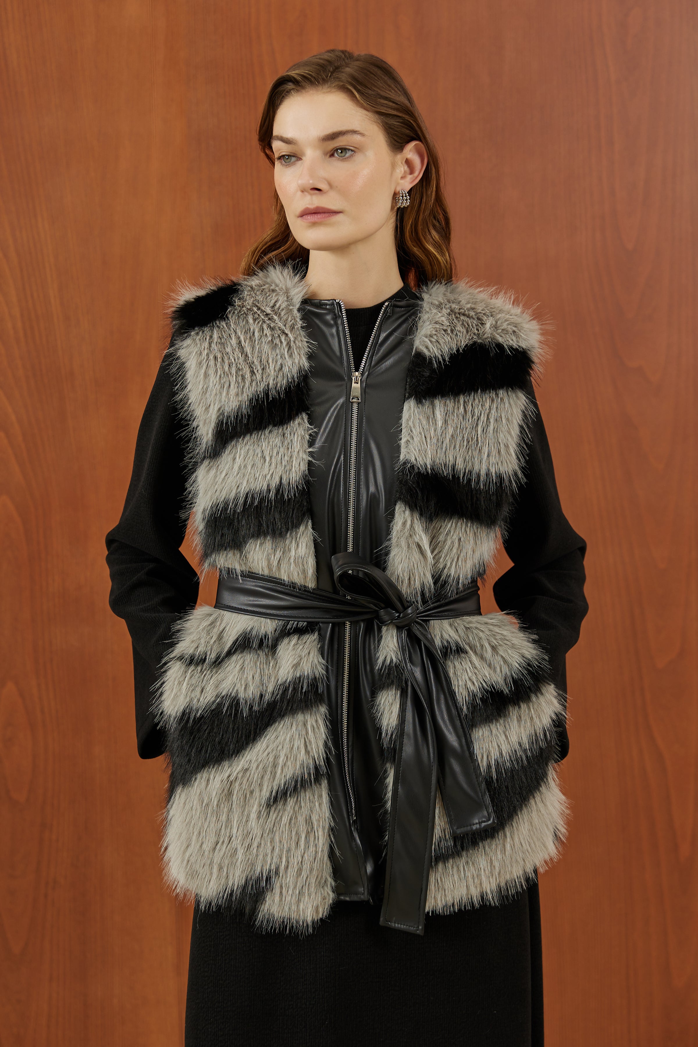 Gri Siyah Zebra Desenli Fermuarlı Kürk Yelek