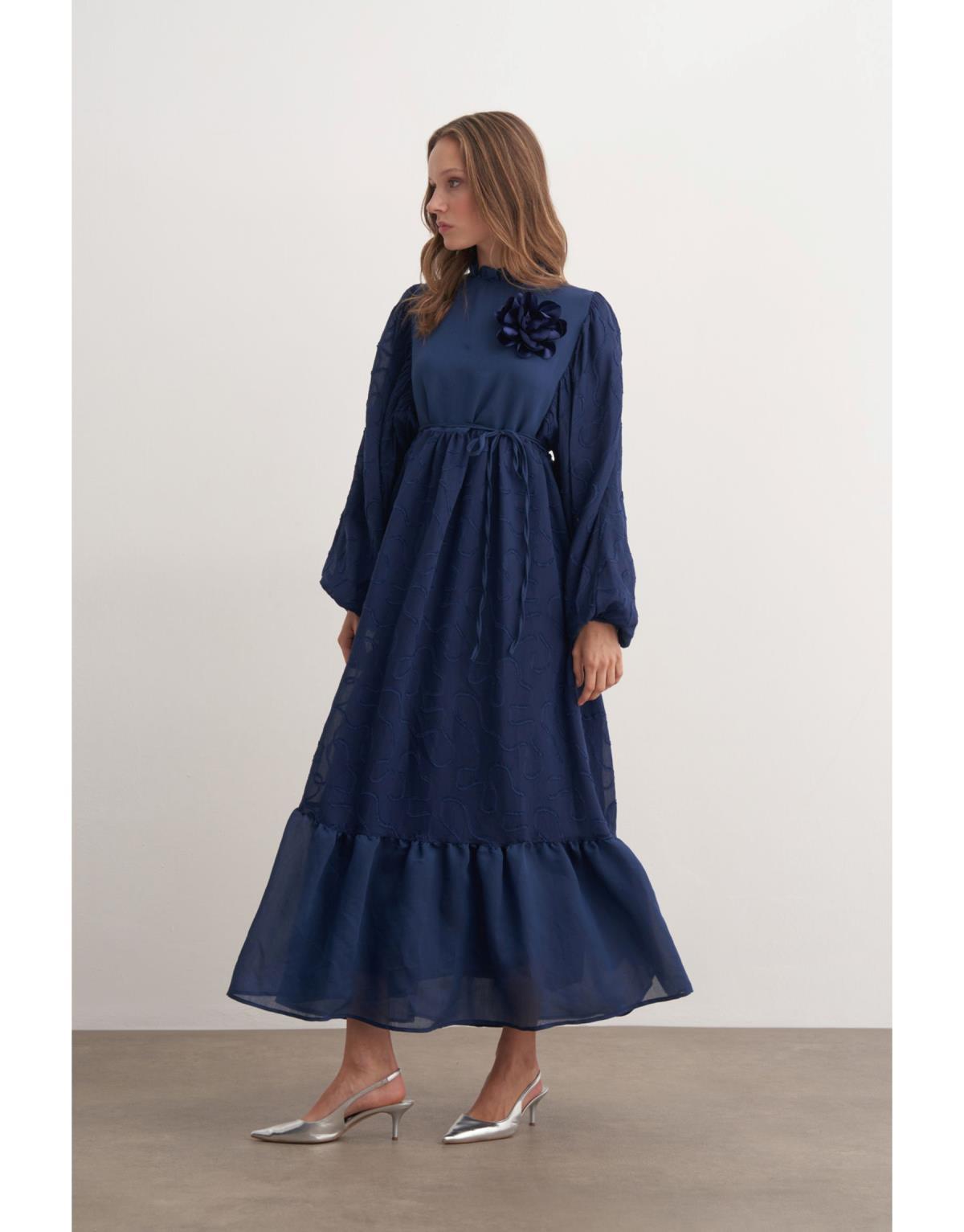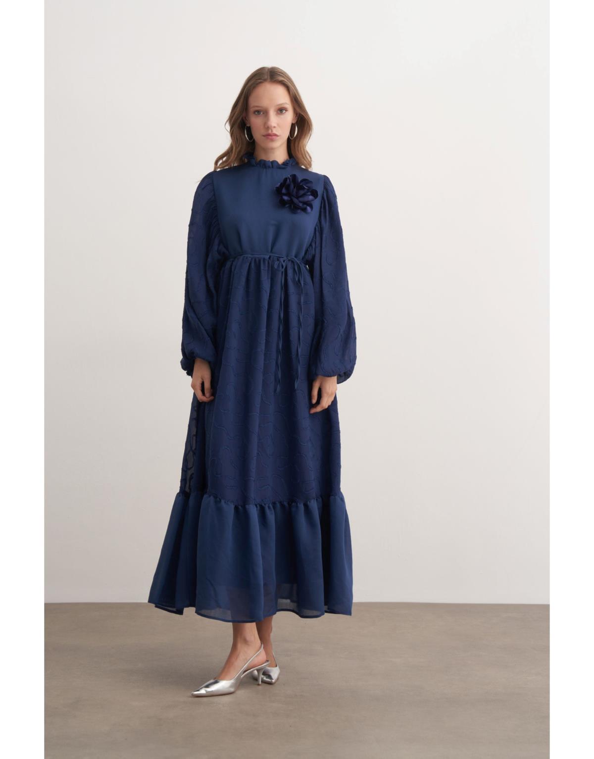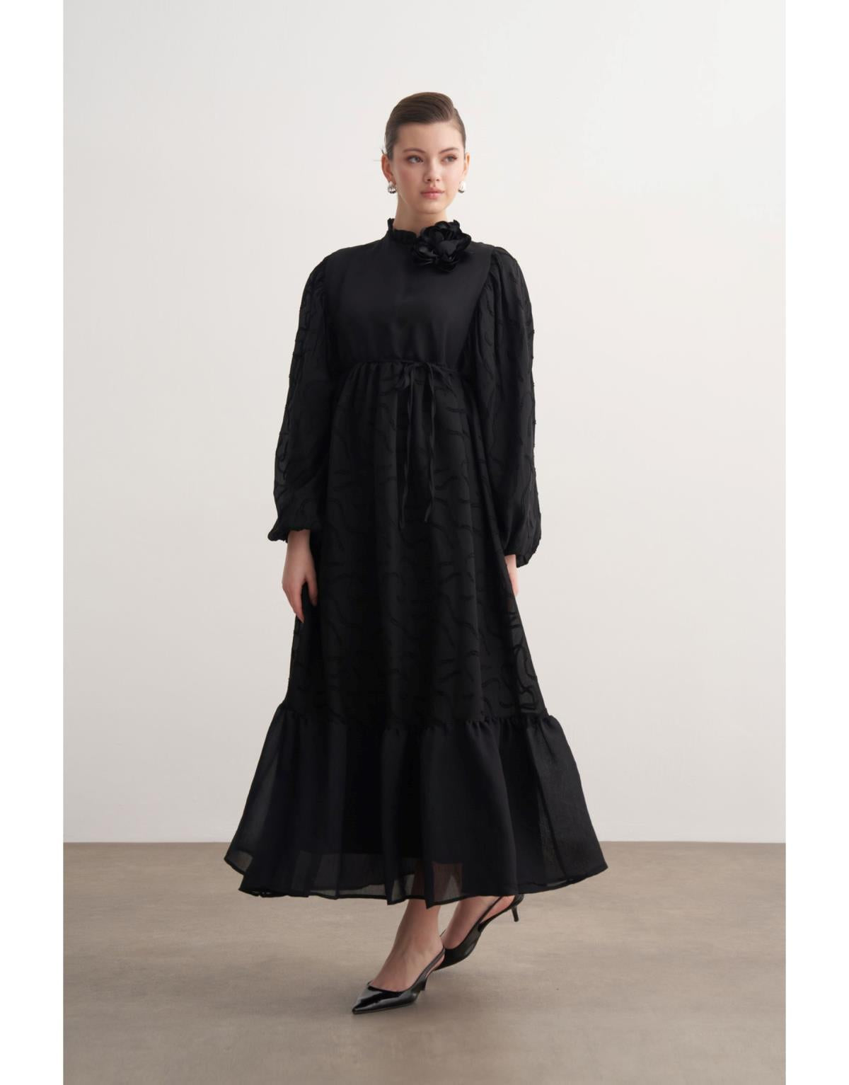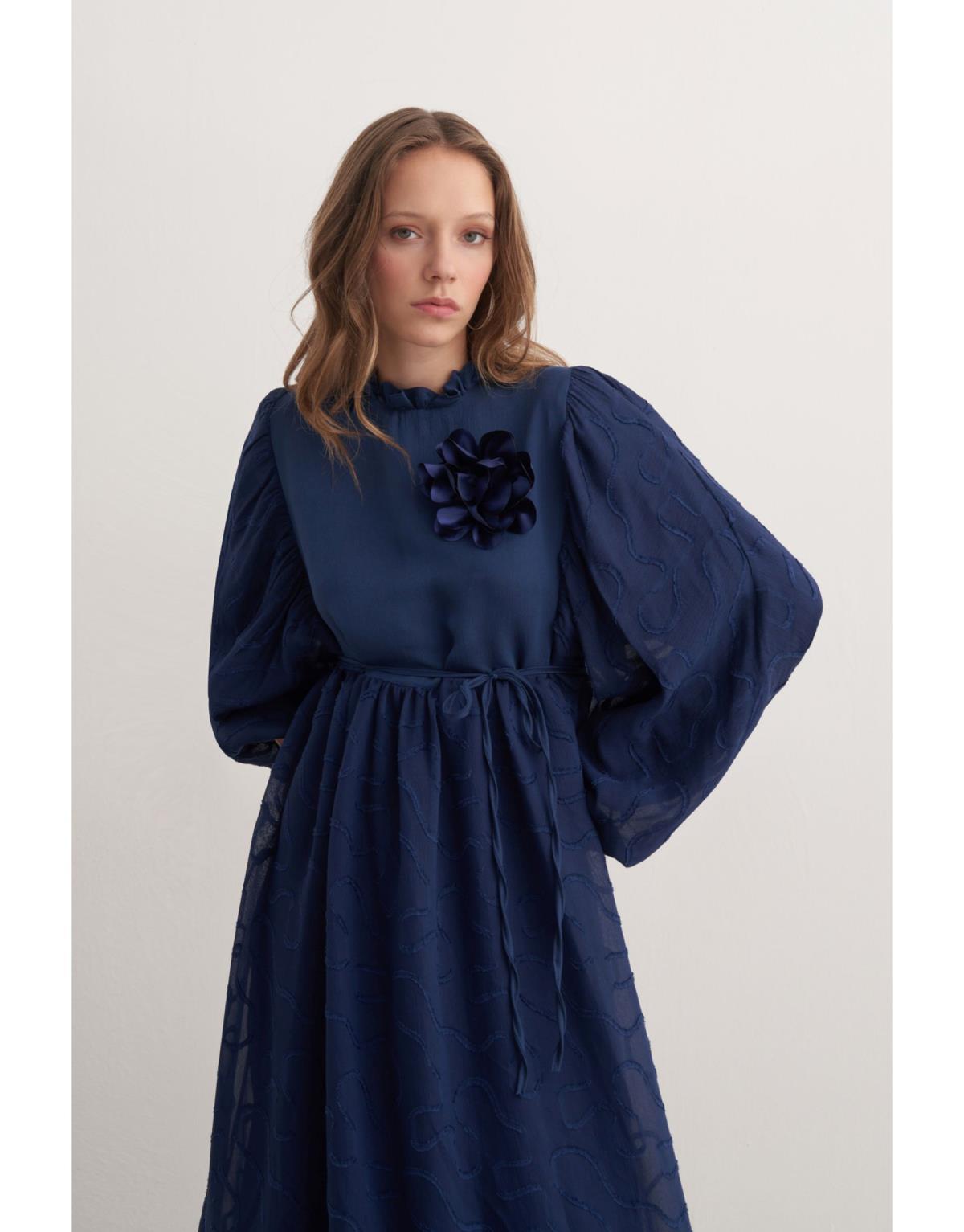 Elbise astarlı şifon kumaştan üretilmiştir. yaka detayı fırfırlıdır. kolu bolon kol ve lastik detaylıdır. Seyyar bronşu ve kemeri mevcuttur. etek ucu büzgülüdür. Astarlıdır