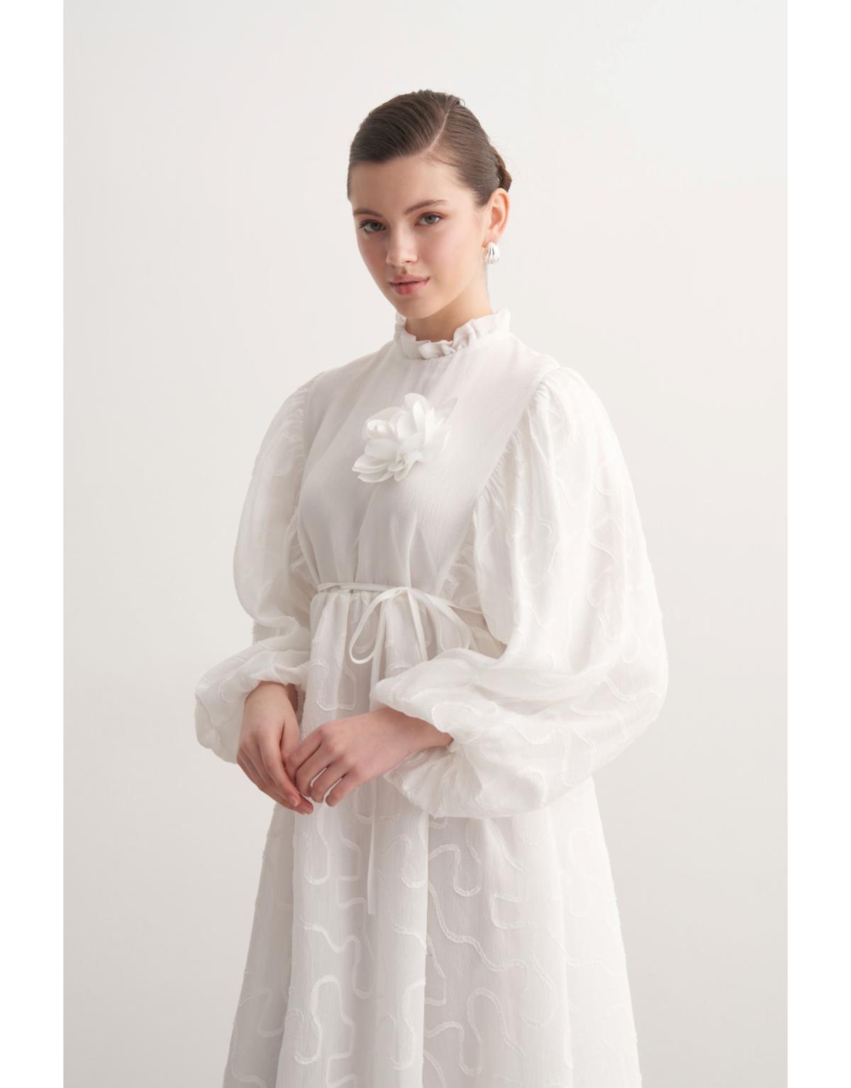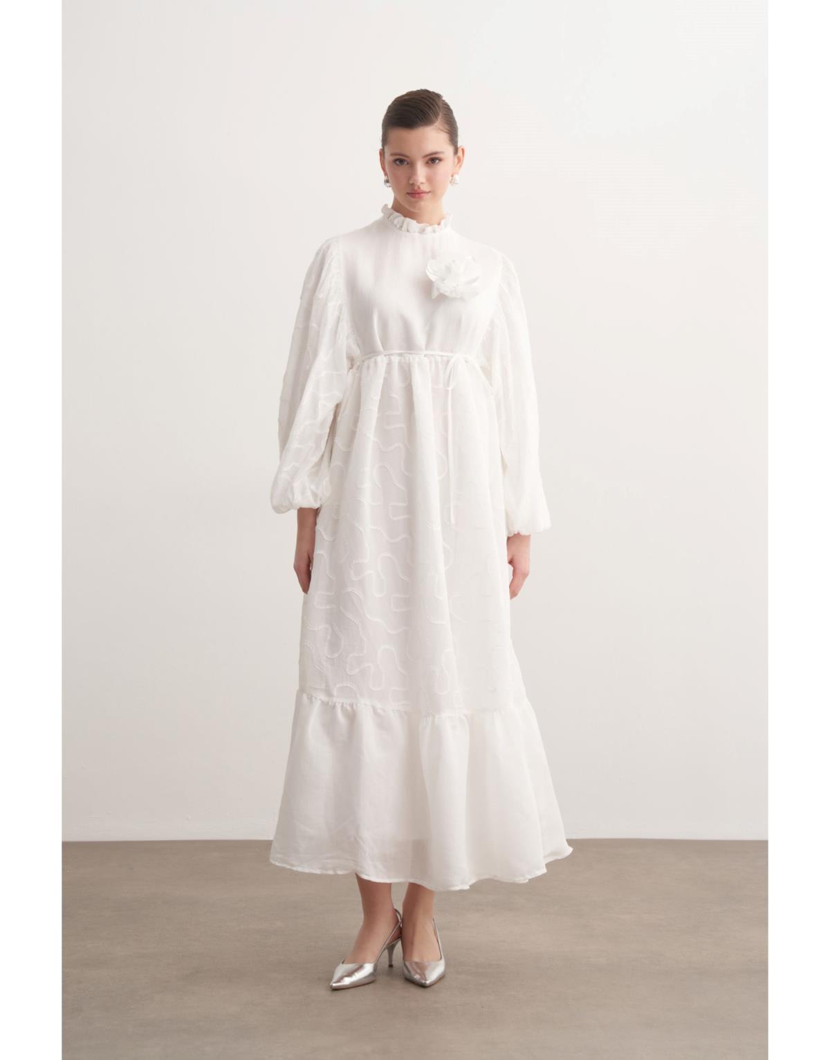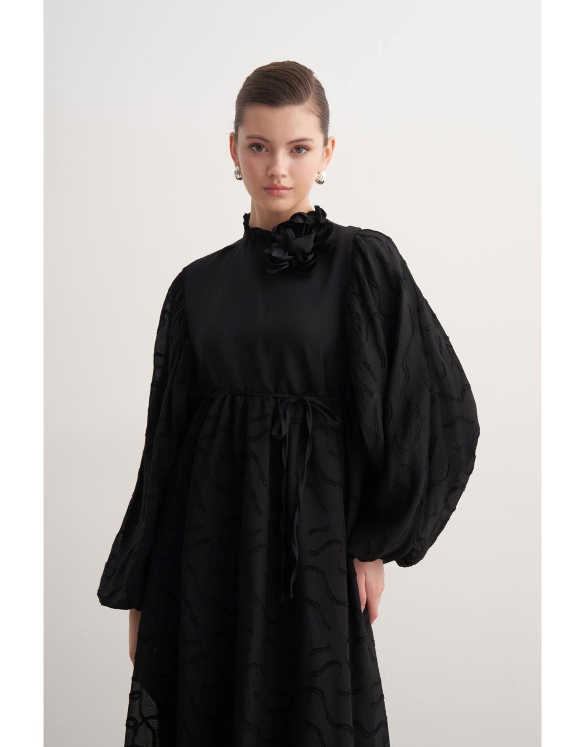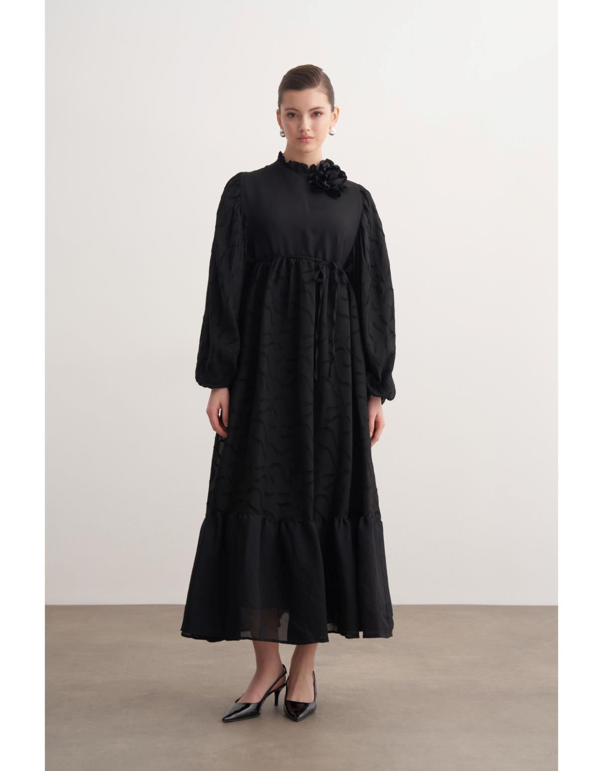 Elbise astarlı şifon kumaştan üretilmiştir. yaka detayı fırfırlıdır. kolu bolon kol ve lastik detaylıdır. Seyyar bronşu ve kemeri mevcuttur. etek ucu büzgülüdür. Astarlıdır