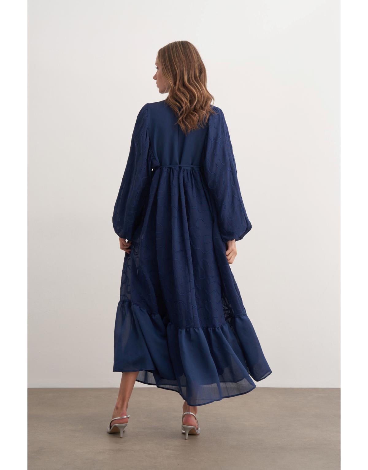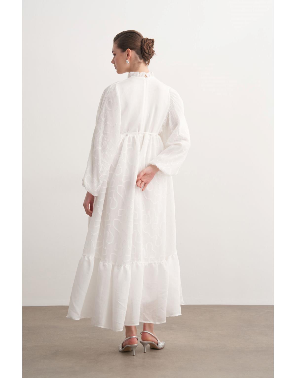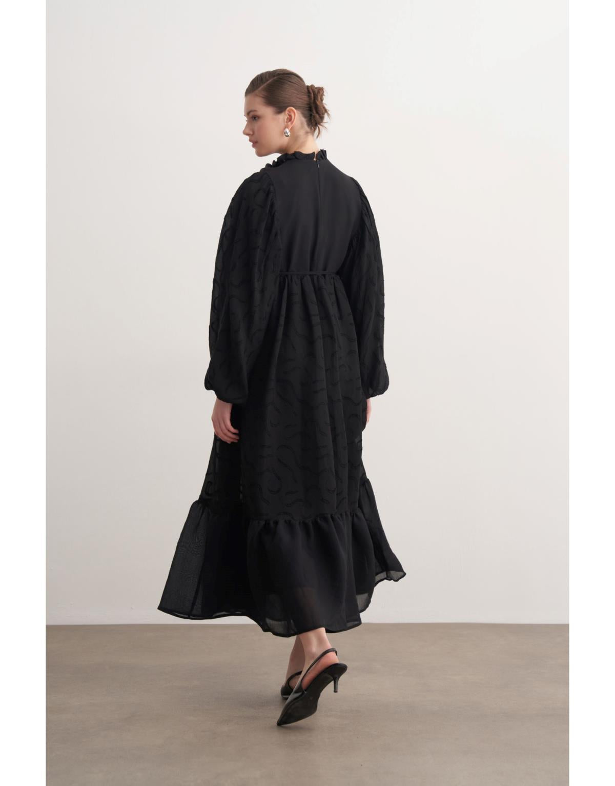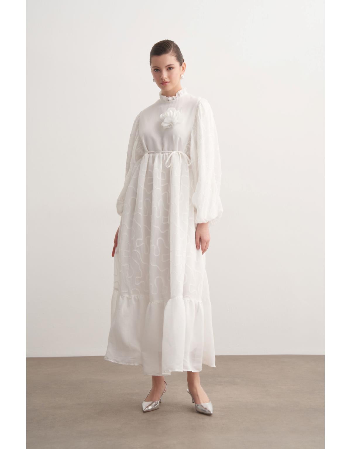 Elbise astarlı şifon kumaştan üretilmiştir. yaka detayı fırfırlıdır. kolu bolon kol ve lastik detaylıdır. Seyyar bronşu ve kemeri mevcuttur. etek ucu büzgülüdür. Astarlıdır