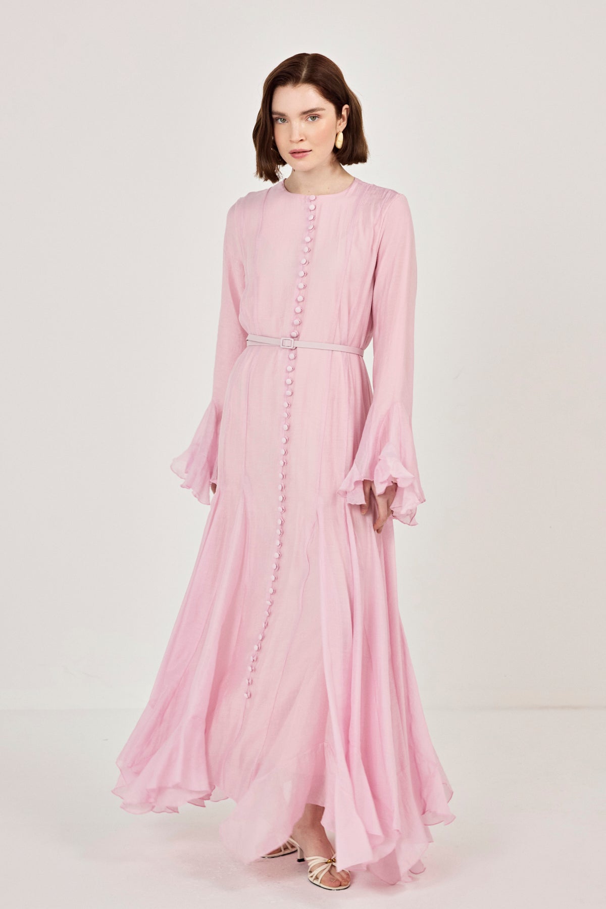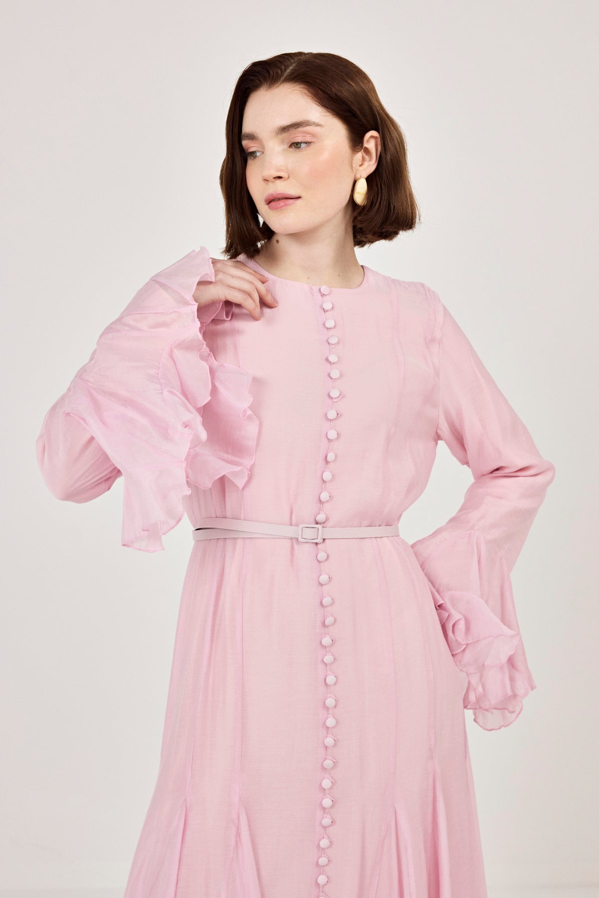 İnce Tensel Volan Detaylı Boydan Düğmeli Elbise Pembe
