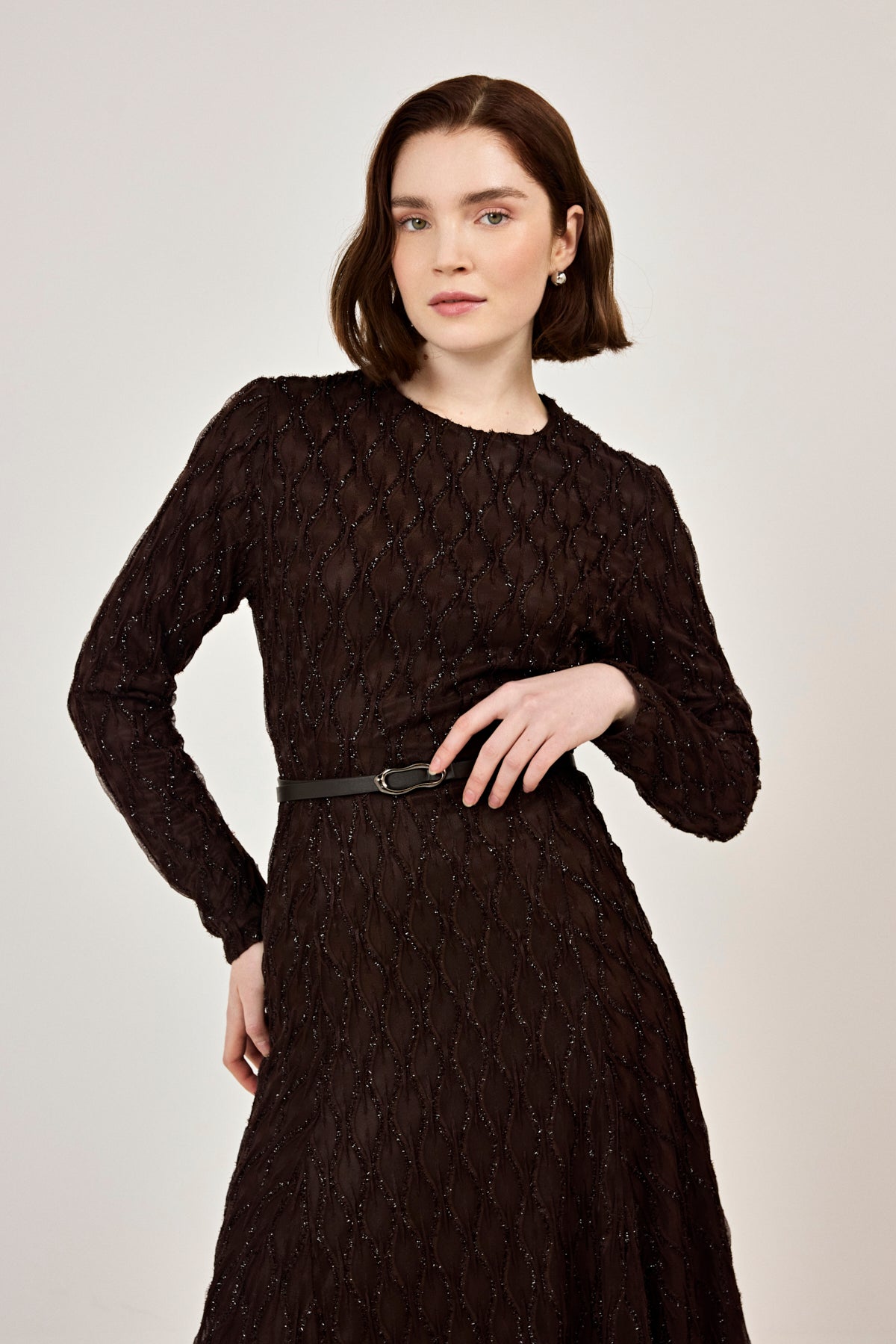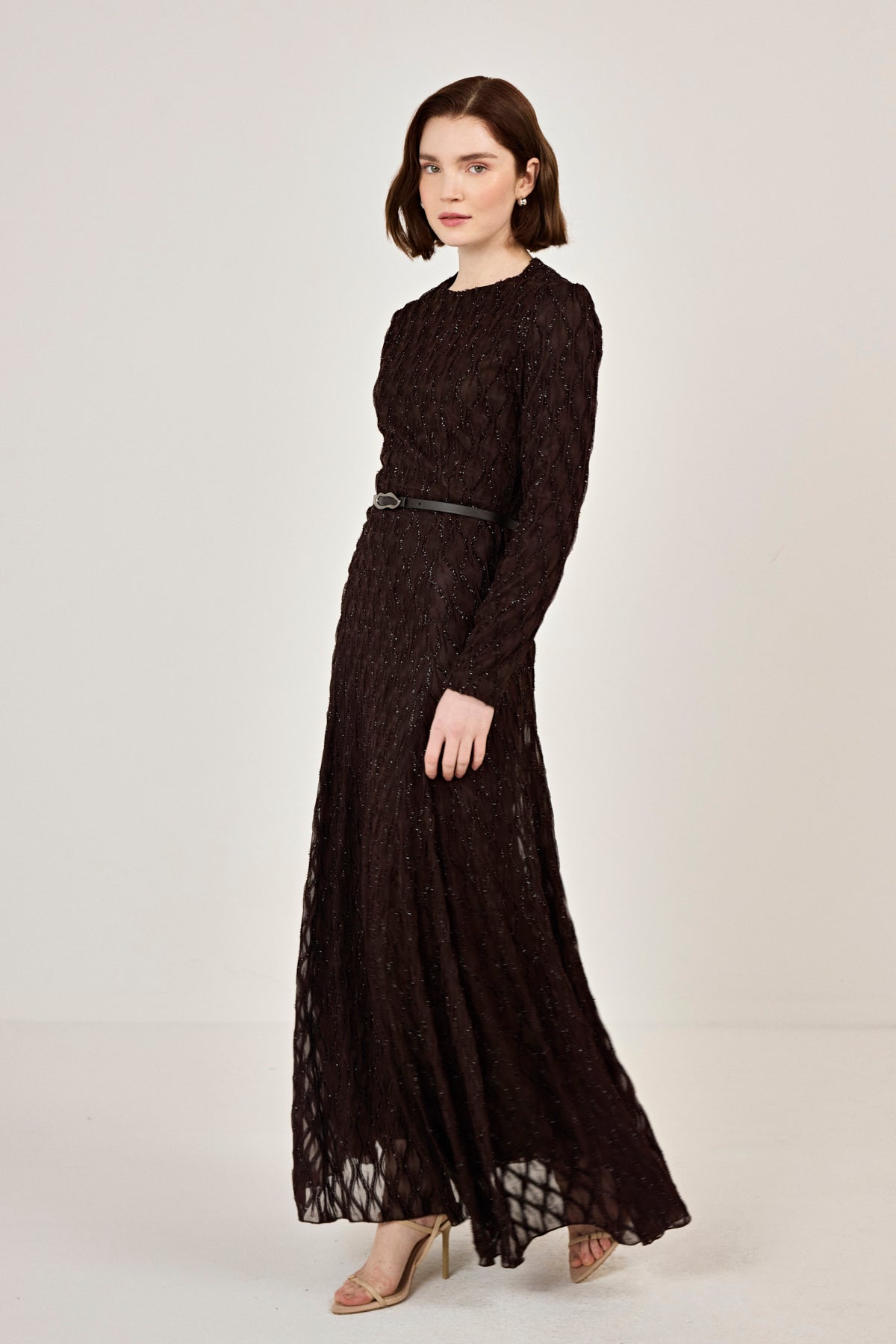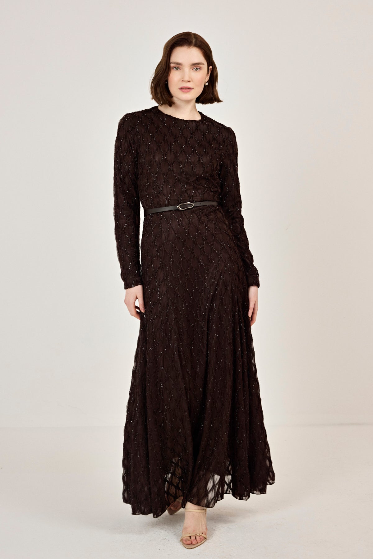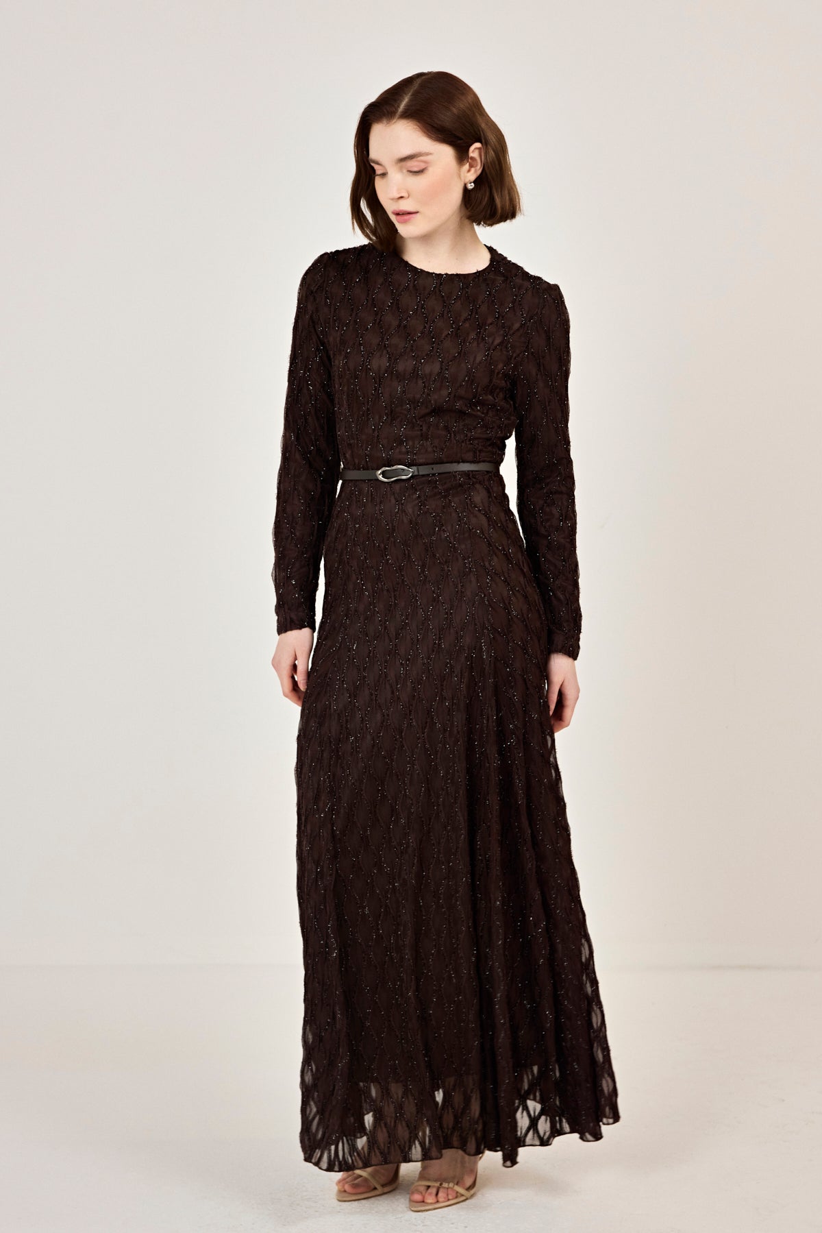 Kemer Detaylı Simli Dantel Elbise Kahverengi