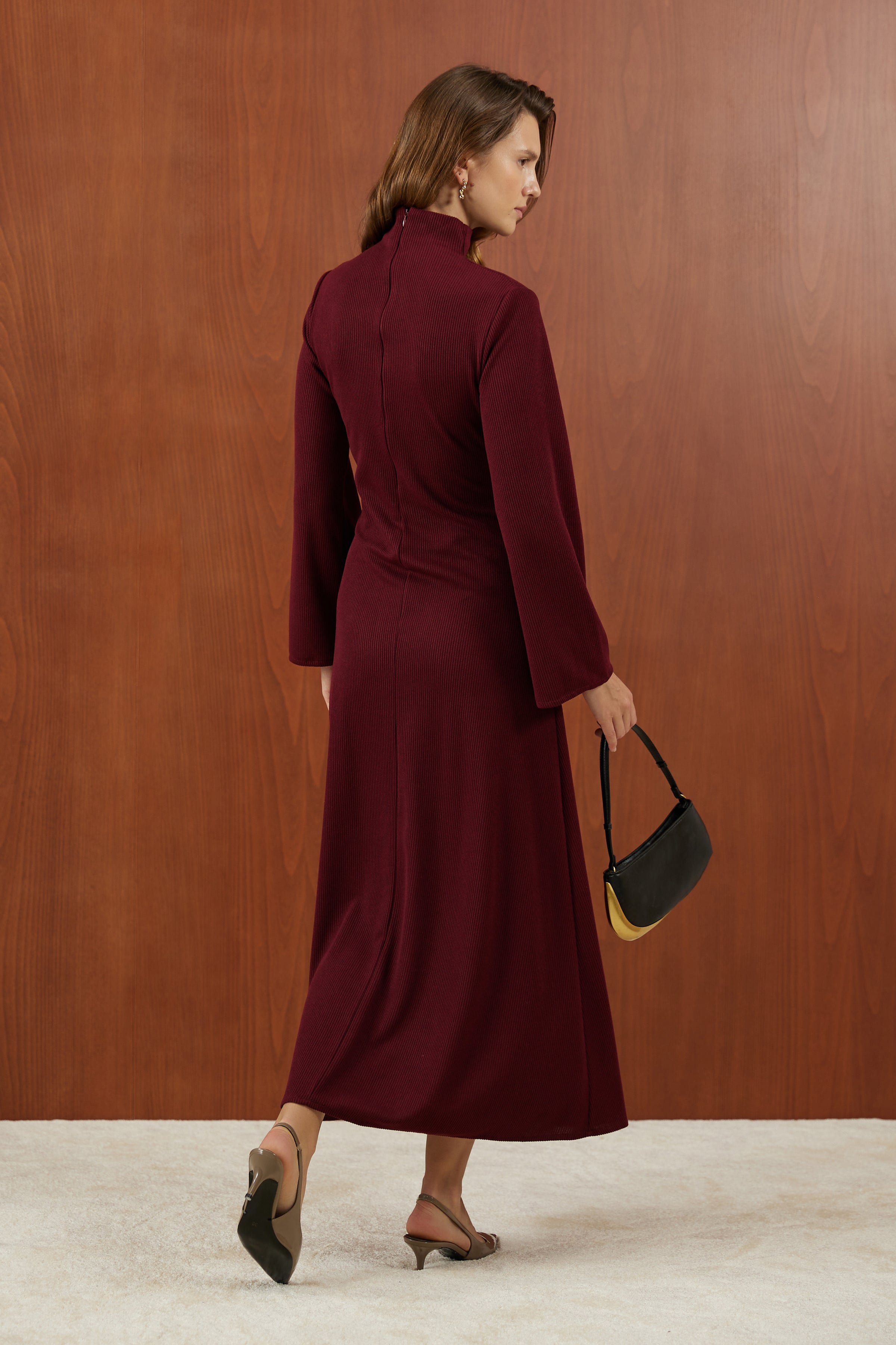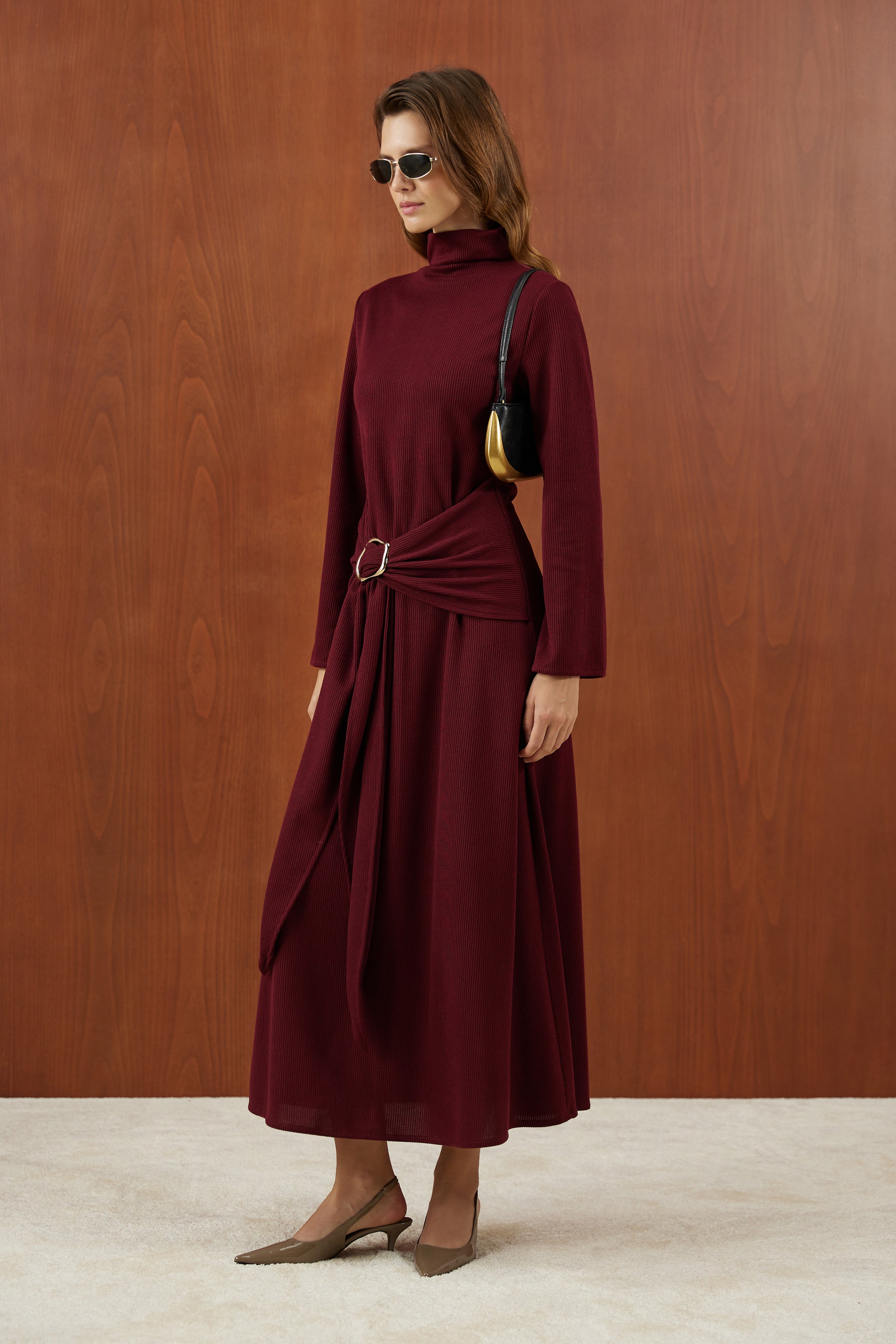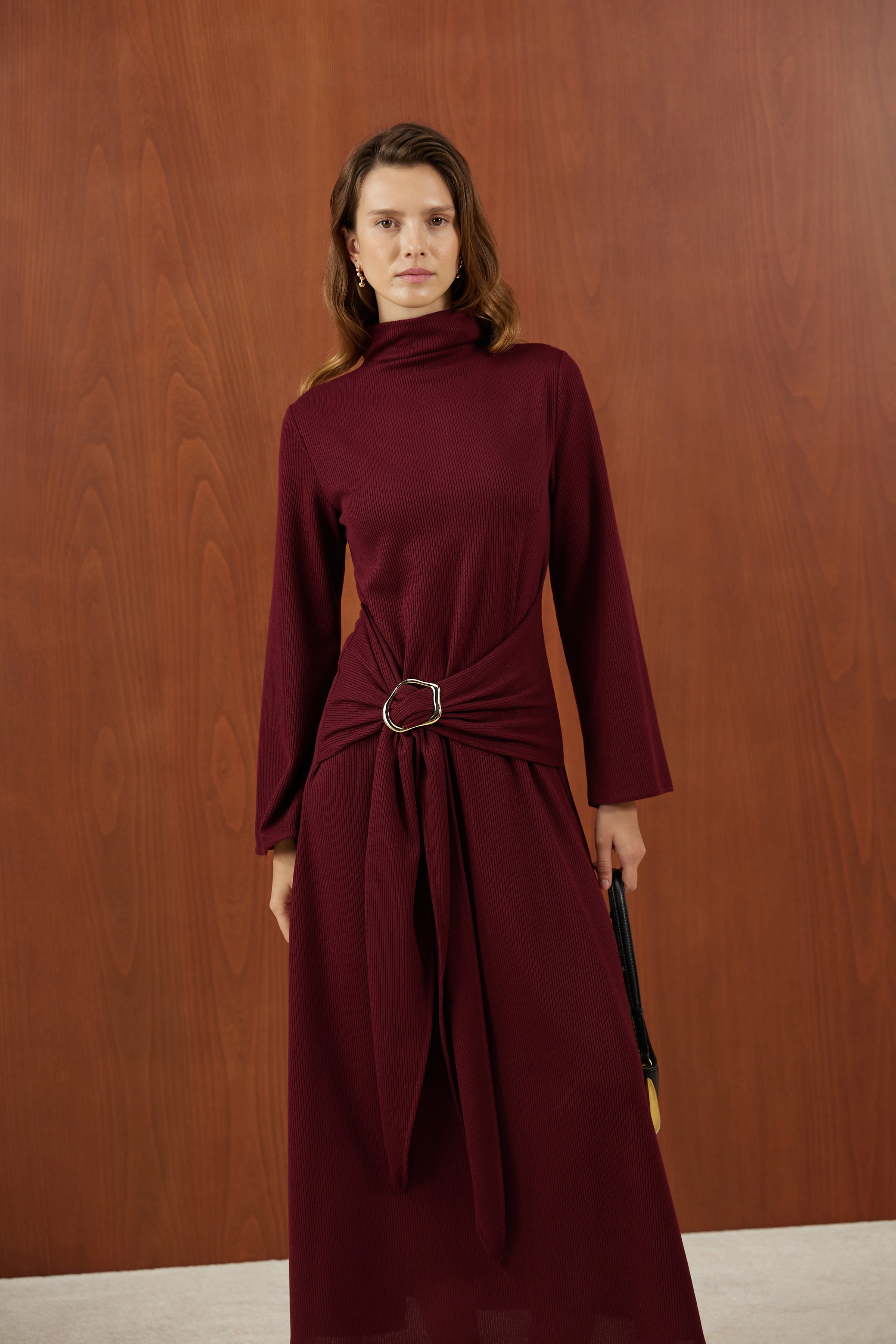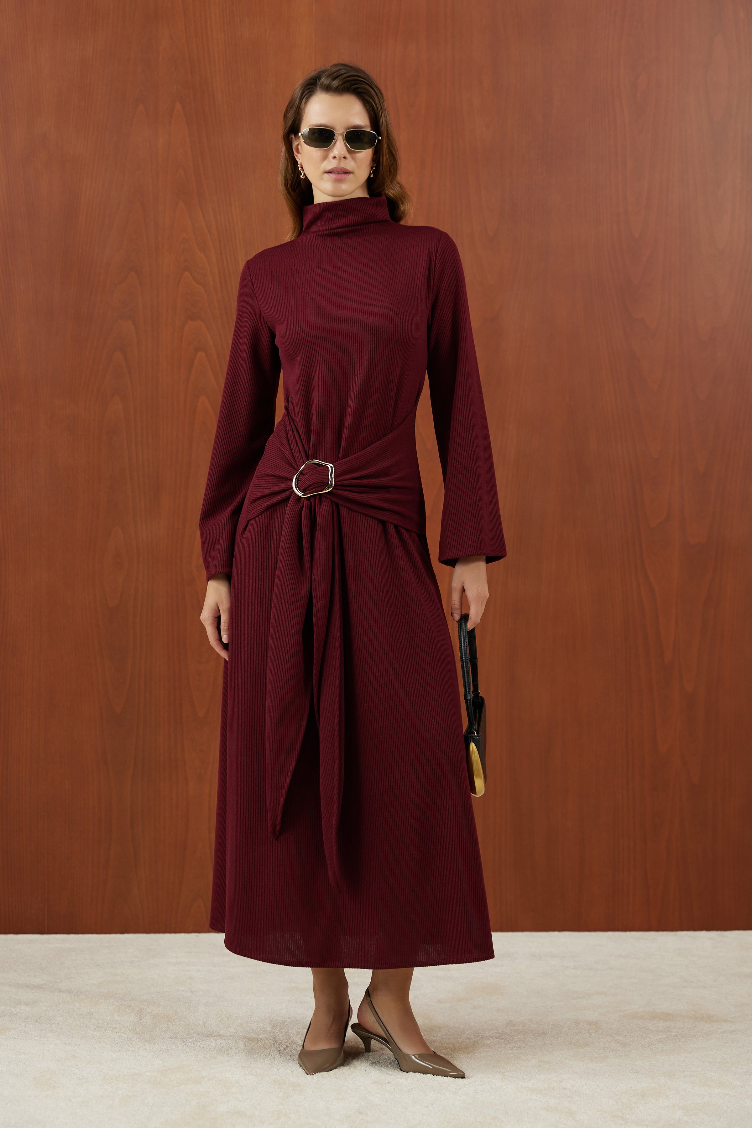 Bordo Önden Bağlamalı Fitilli Triko Elbise