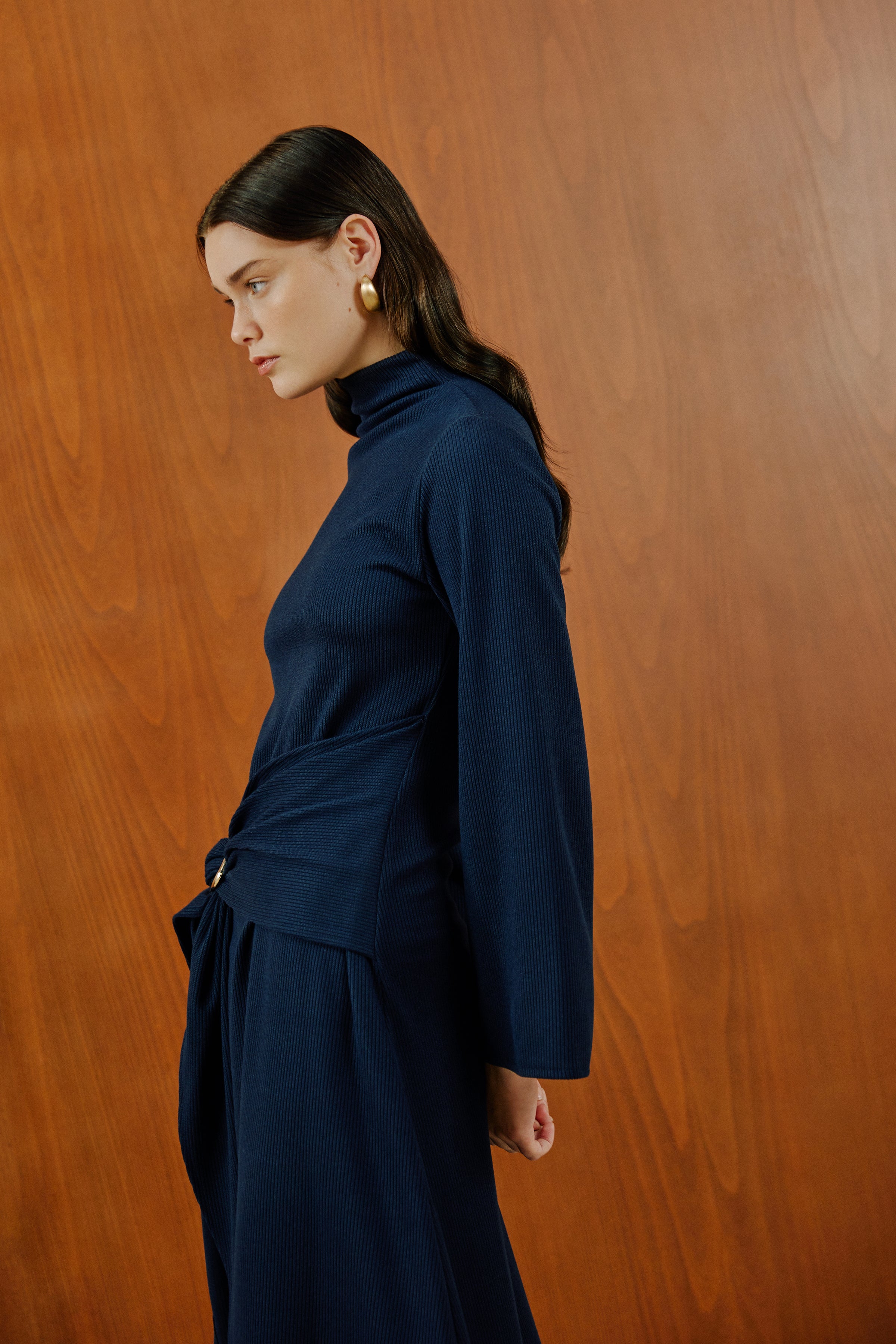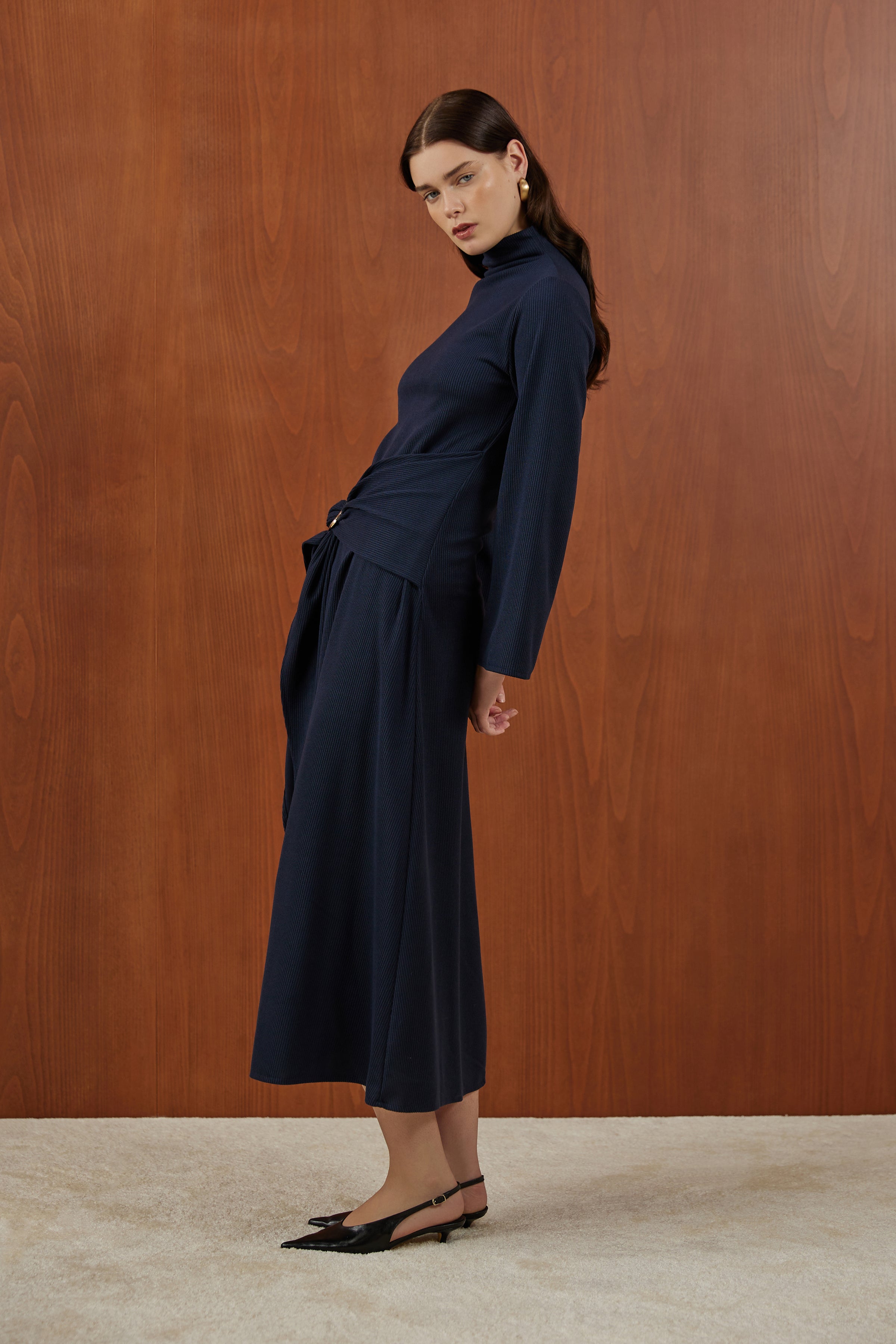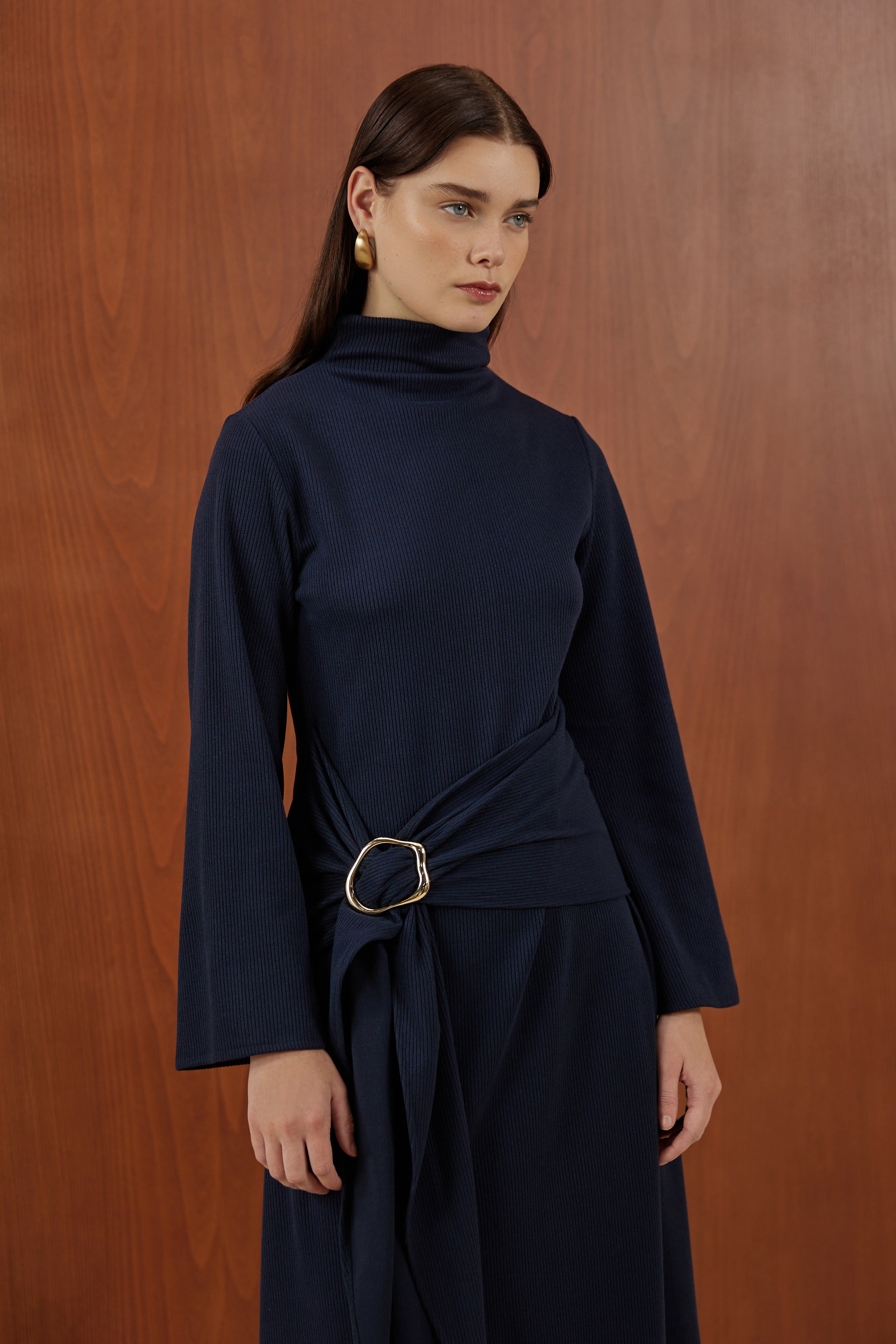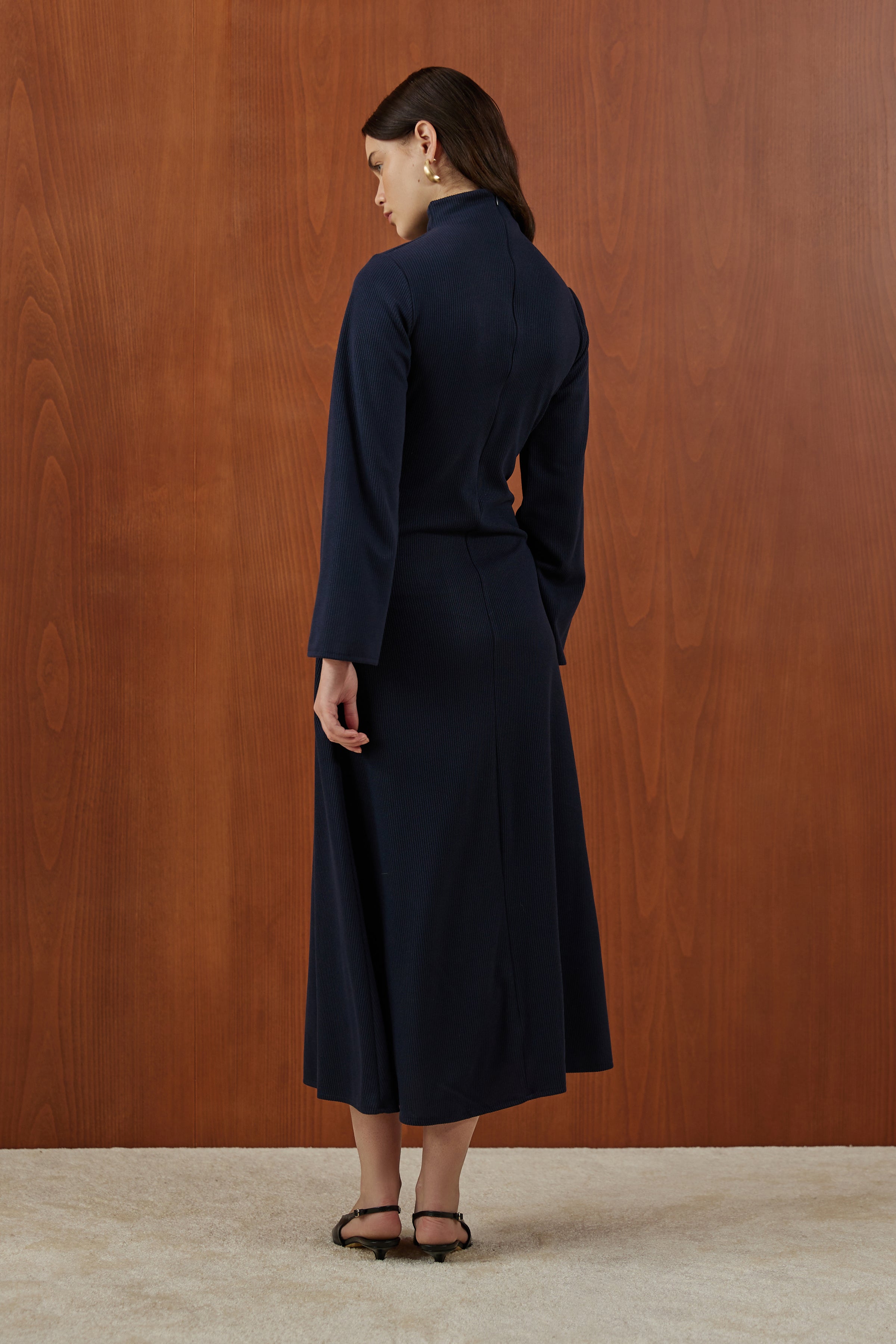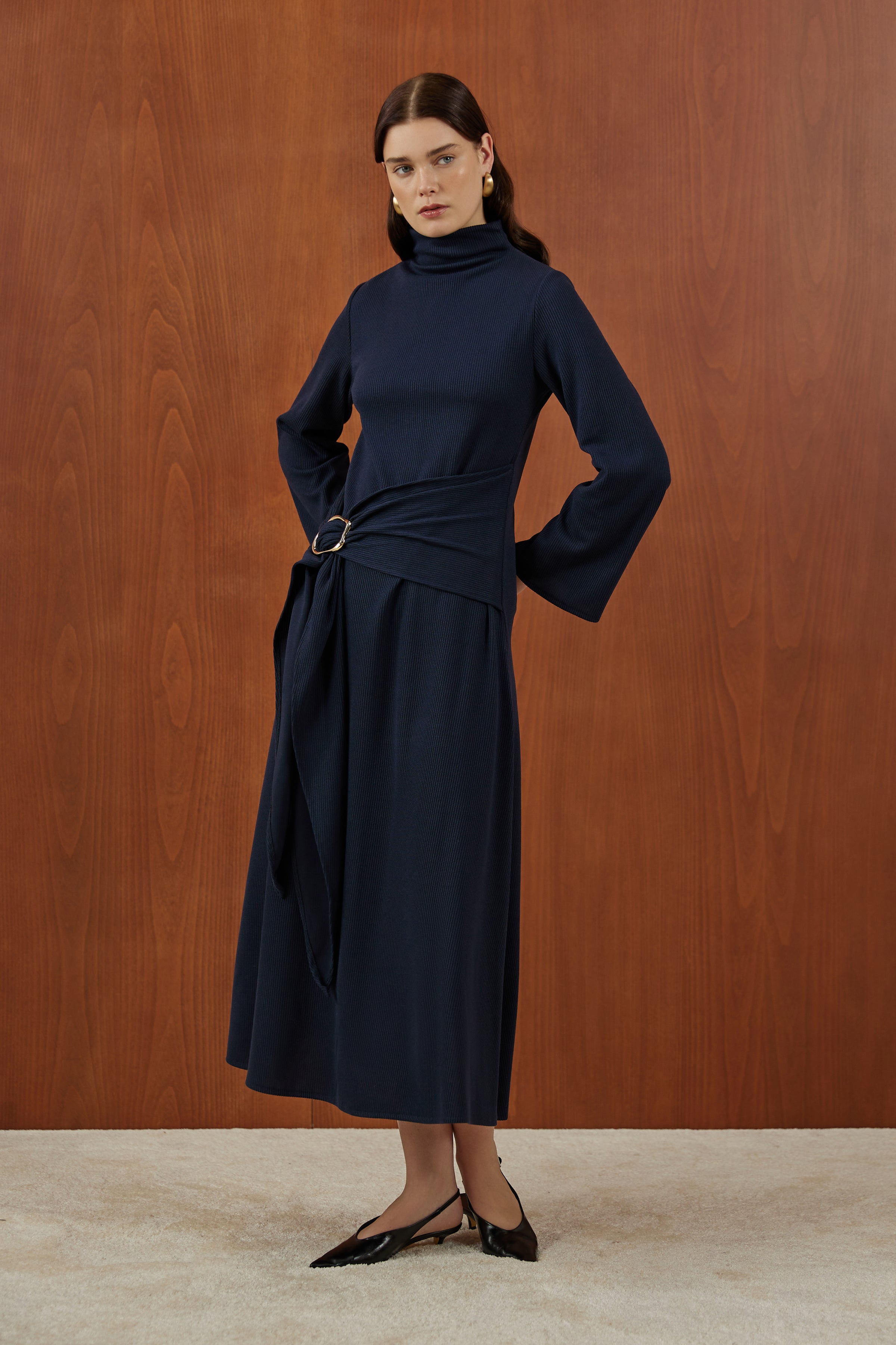 Lacivert Önden Bağlamalı Fitilli Triko Elbise