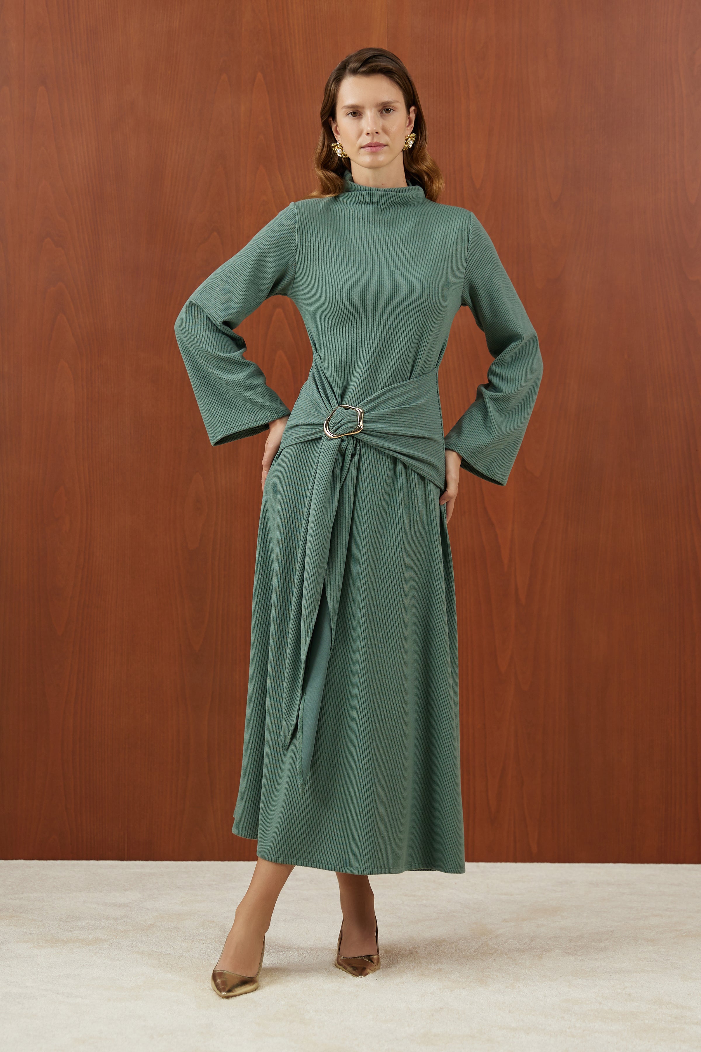 Yaka Detaylı Kuşaklı Elbise