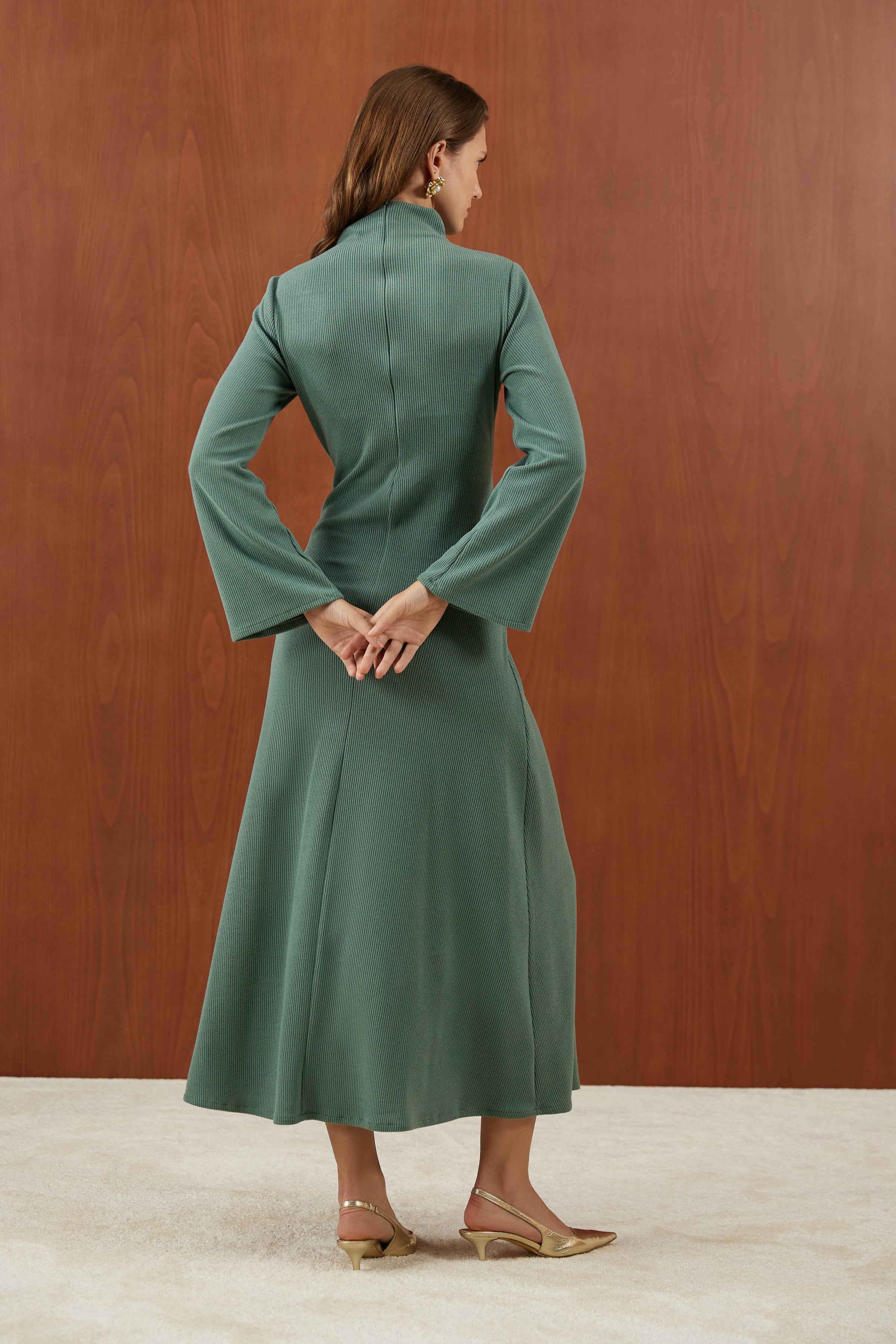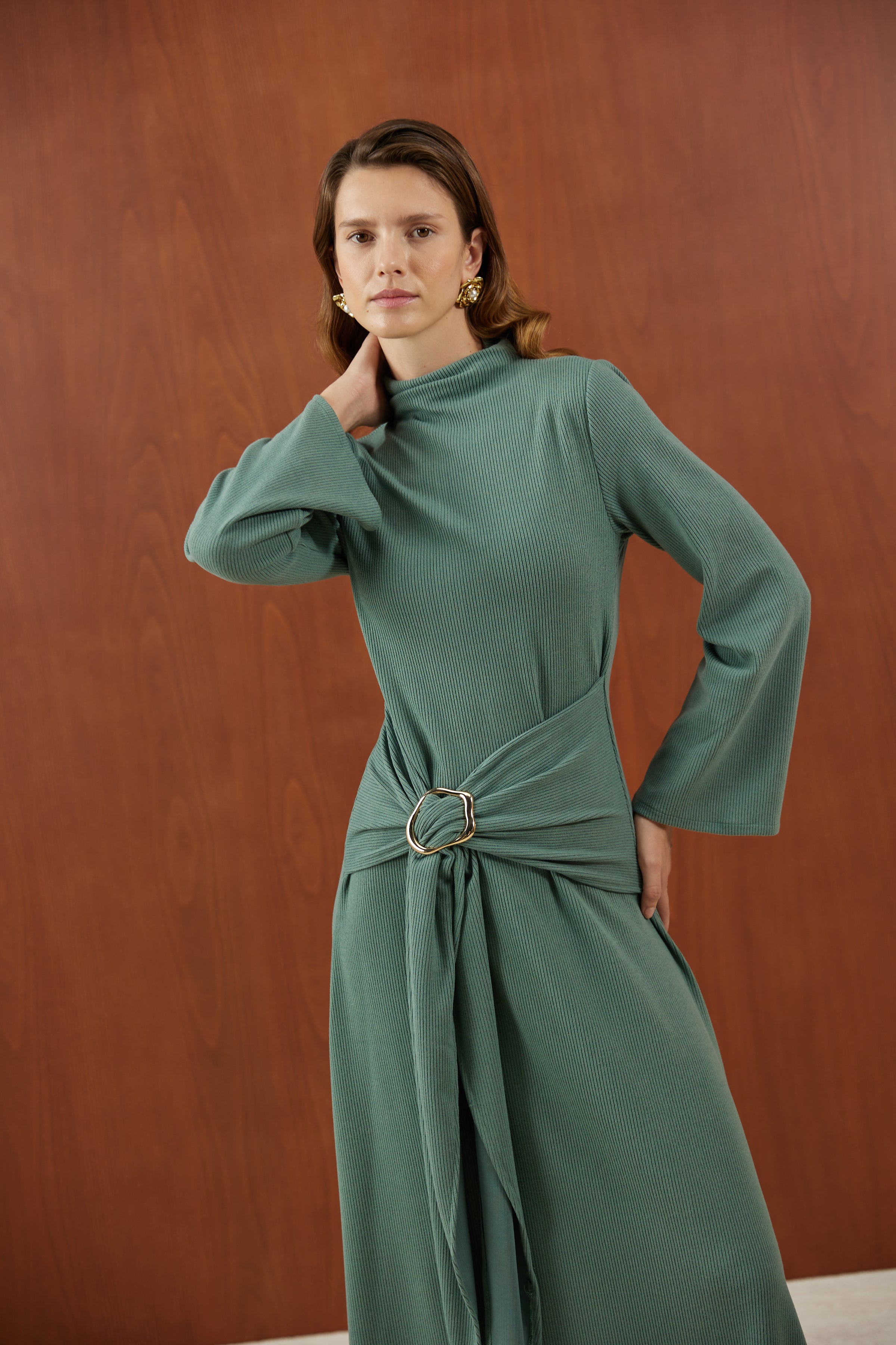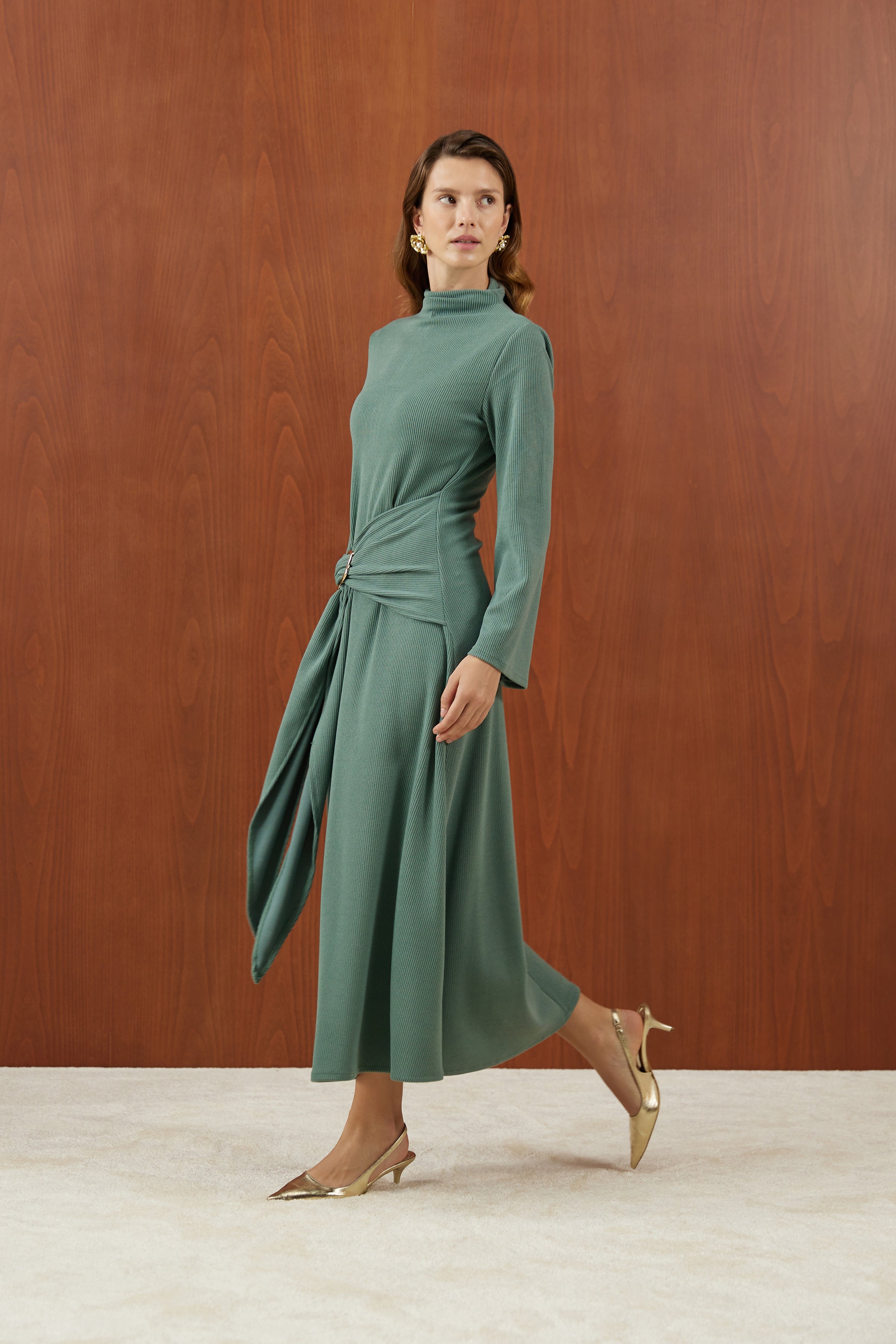 Mint Önden Bağlamalı Fitilli Triko Elbise
