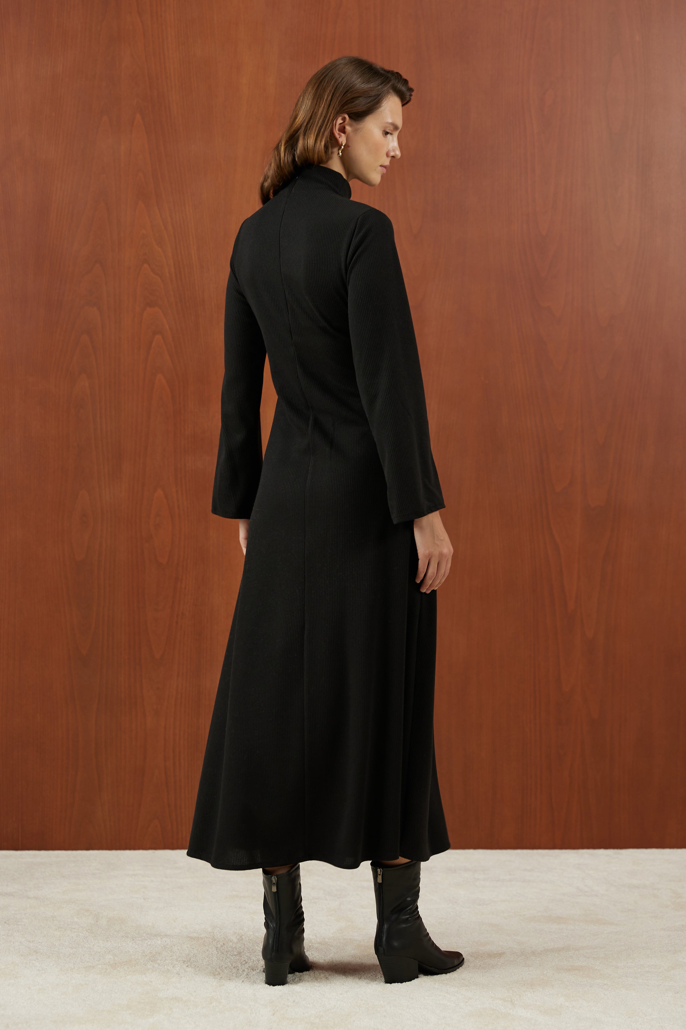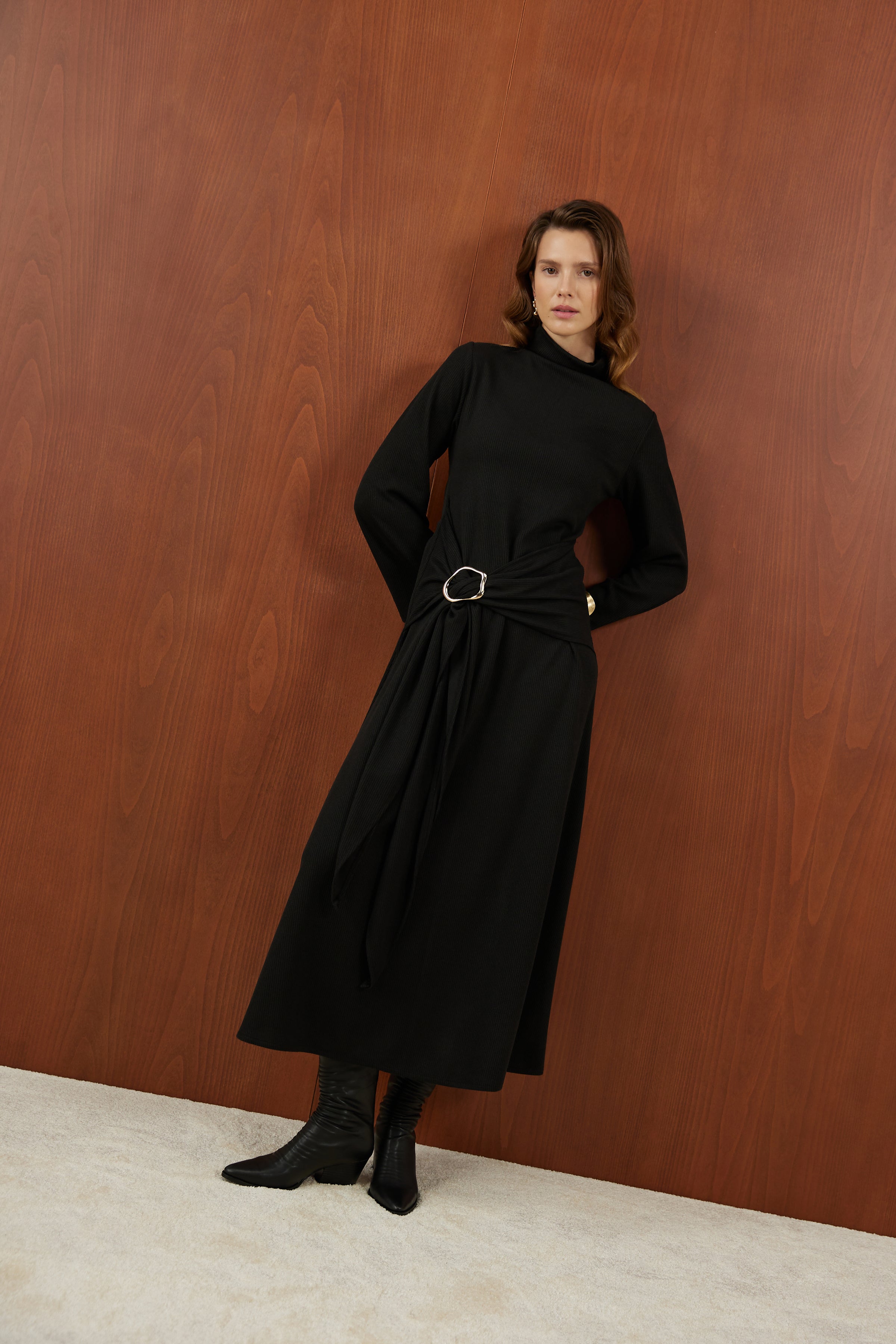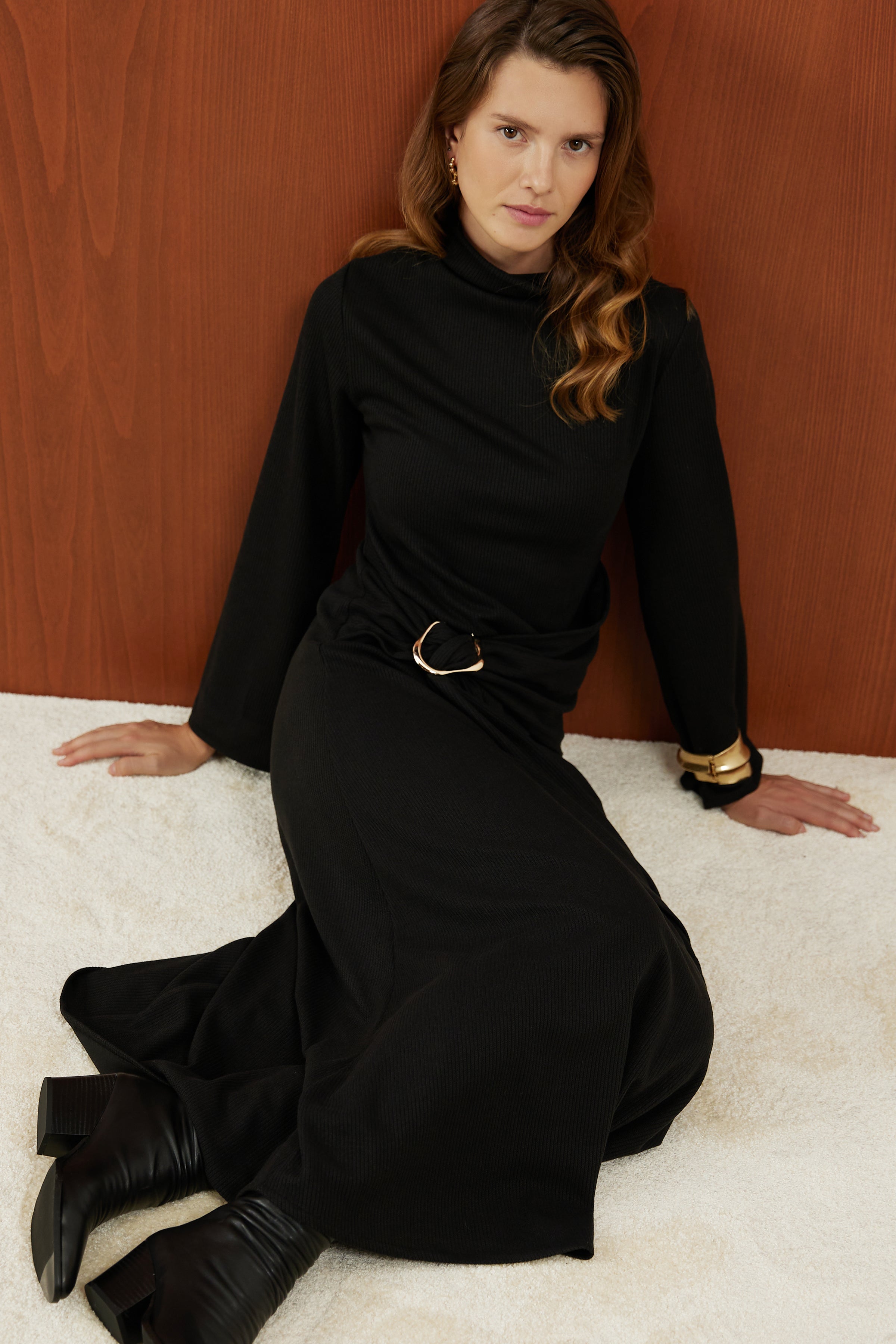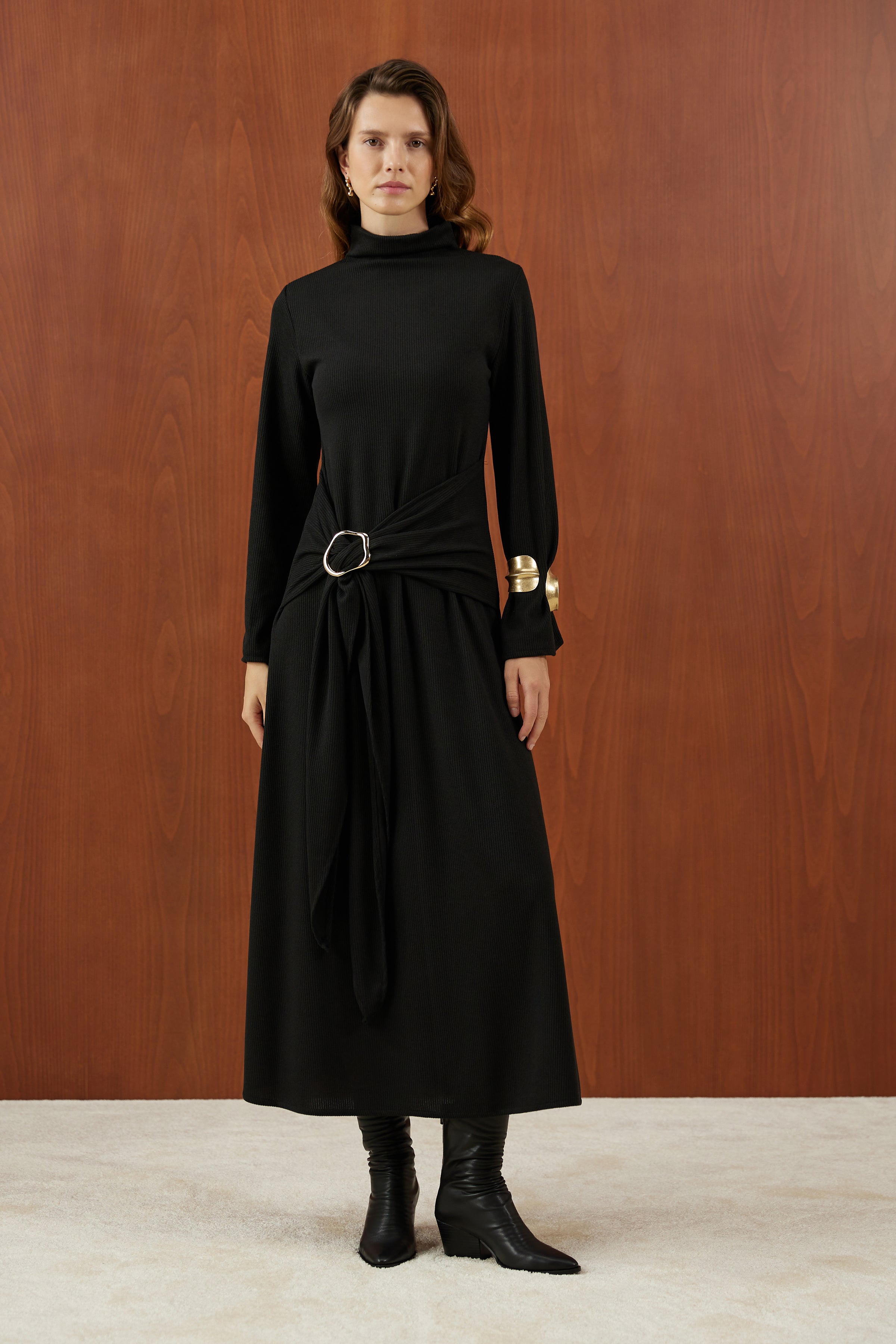 Siyah Önden Bağlamalı Fitilli Triko Elbise