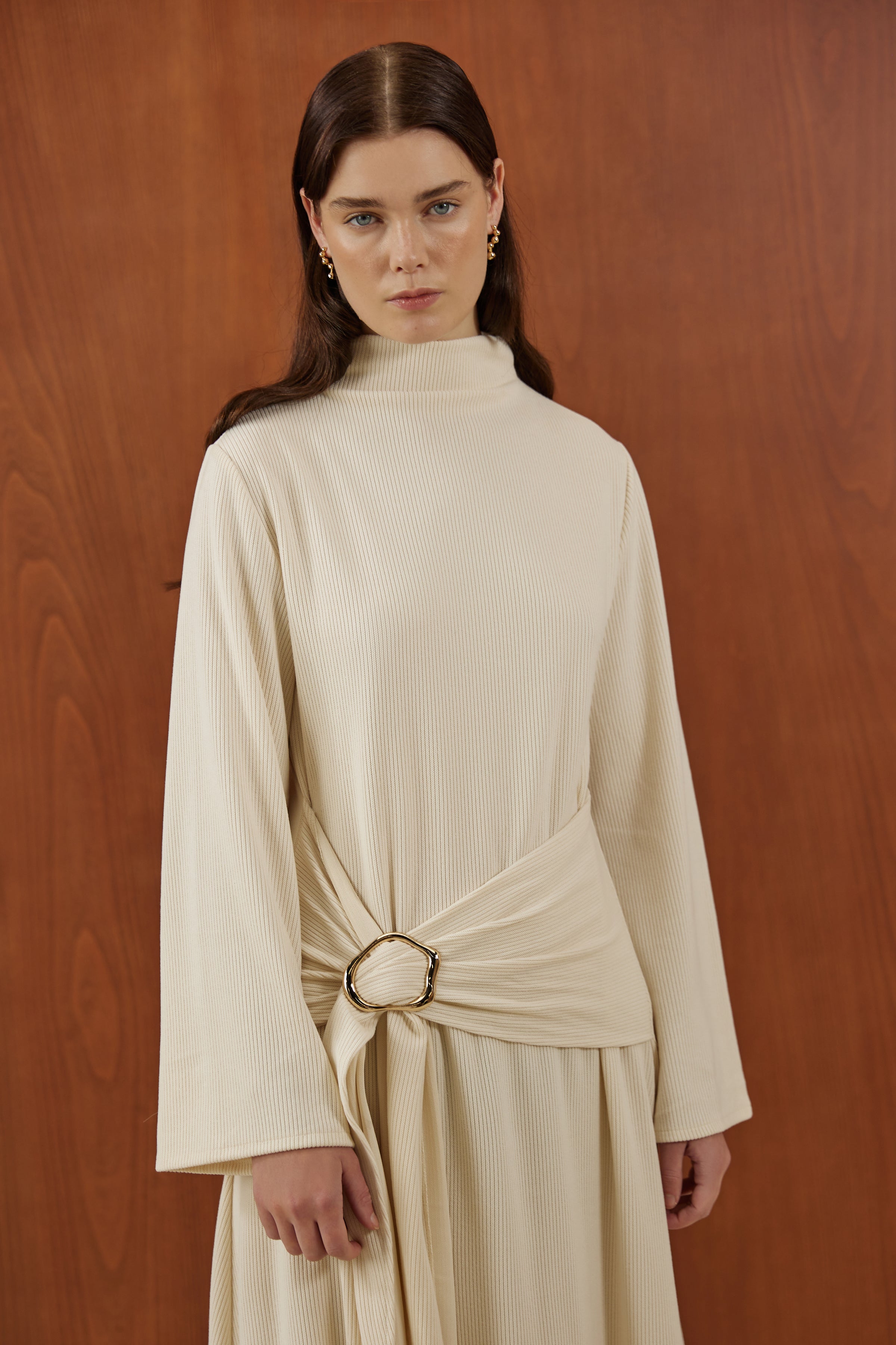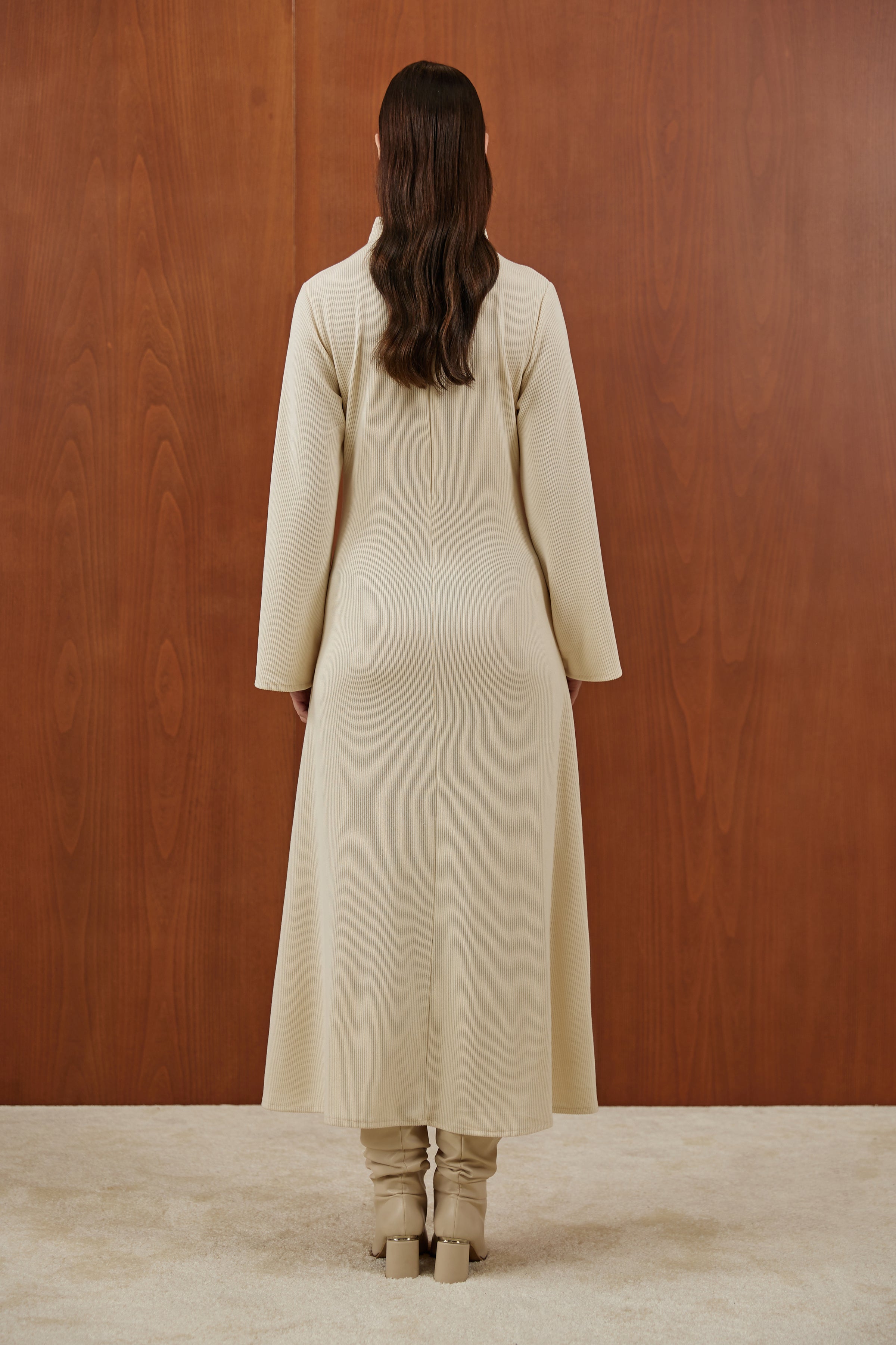 Yaka Detaylı Kuşaklı Elbise - Bej