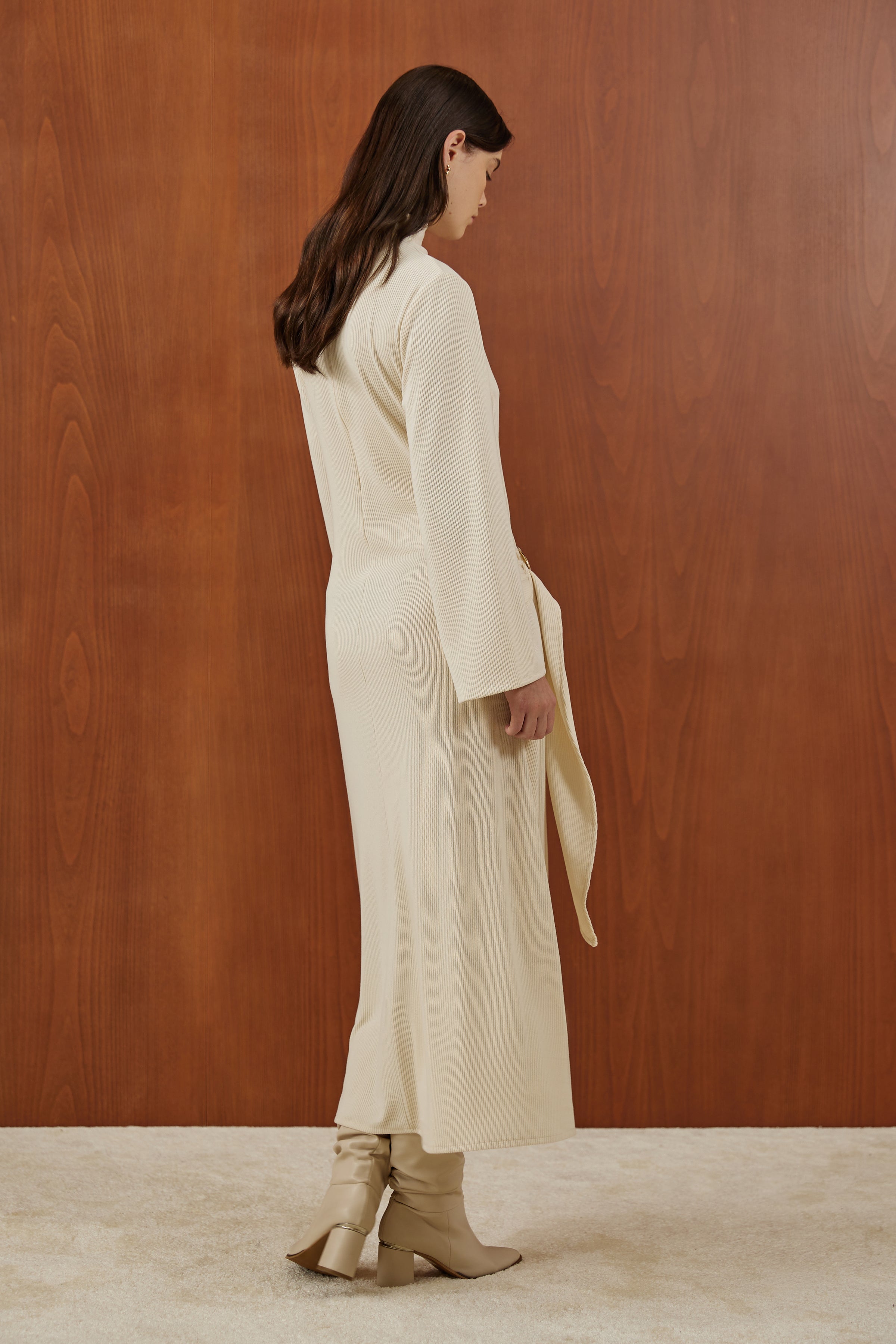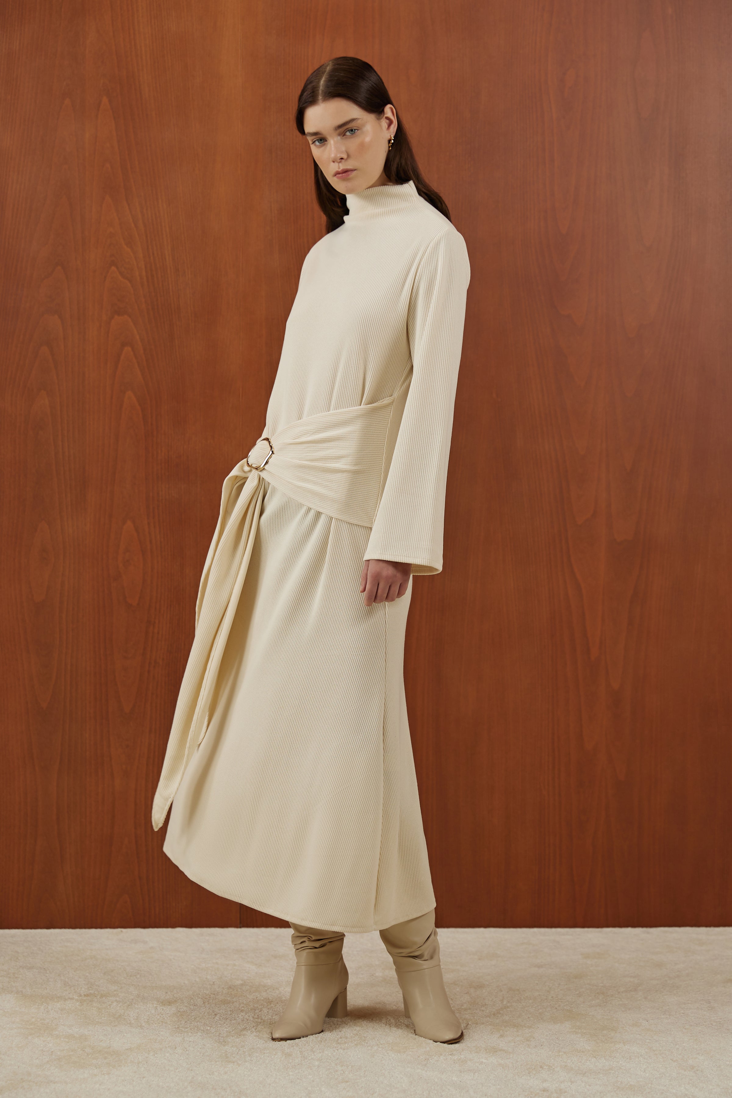Taş Rengi Önden Bağlamalı Fitilli Triko Elbise