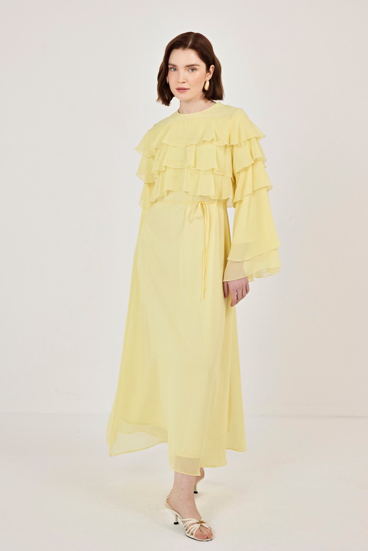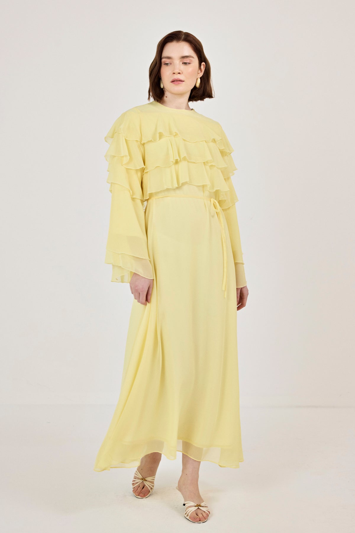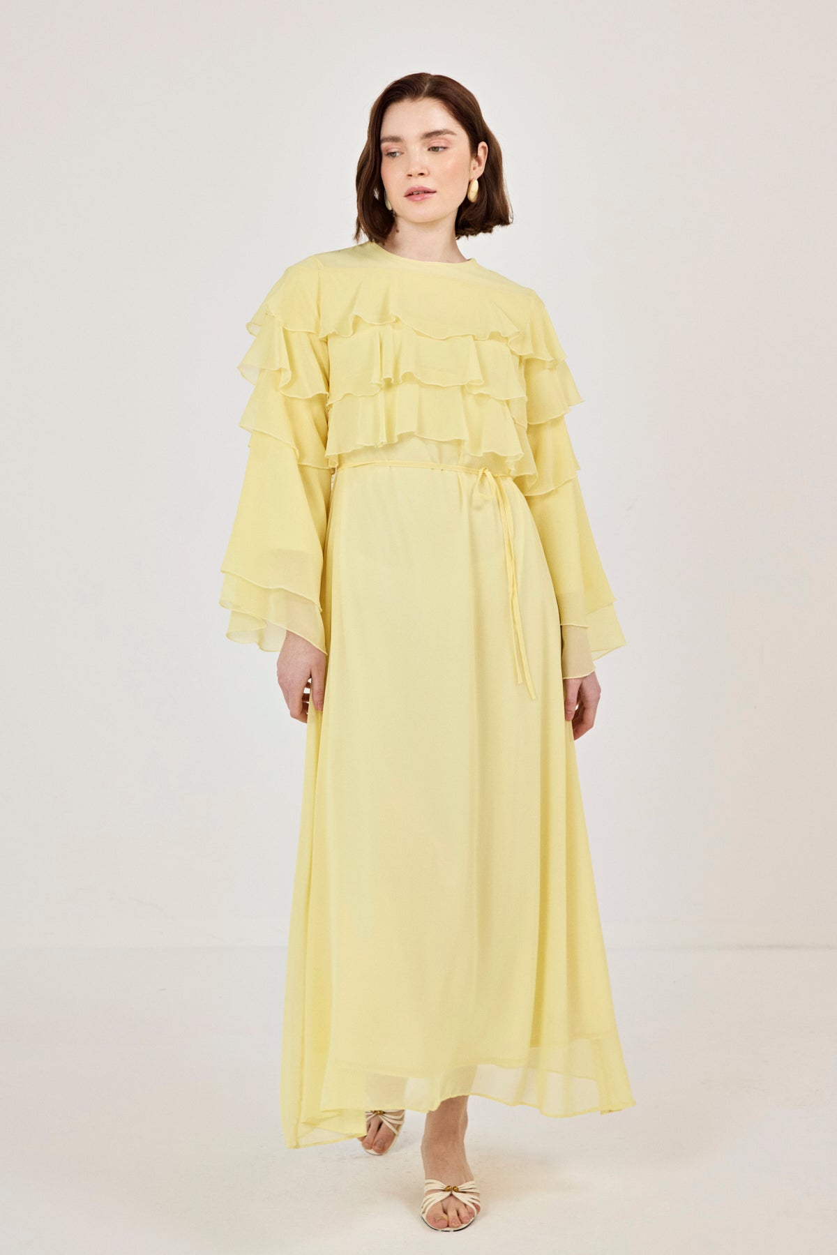 Robadan Fırfır Detaylı Biye Kemerli Şifon Elbise, zarif ve feminen tasarımıyla özel günlerden günlük şıklığa kadar geniş bir kullanım alanı sunar. Hafif ve akışkan şifon kumaşı sayesinde gün boyu konfor sağlarken, robadan başlayan fırfır detayları elbiseye romantik bir hava katar.