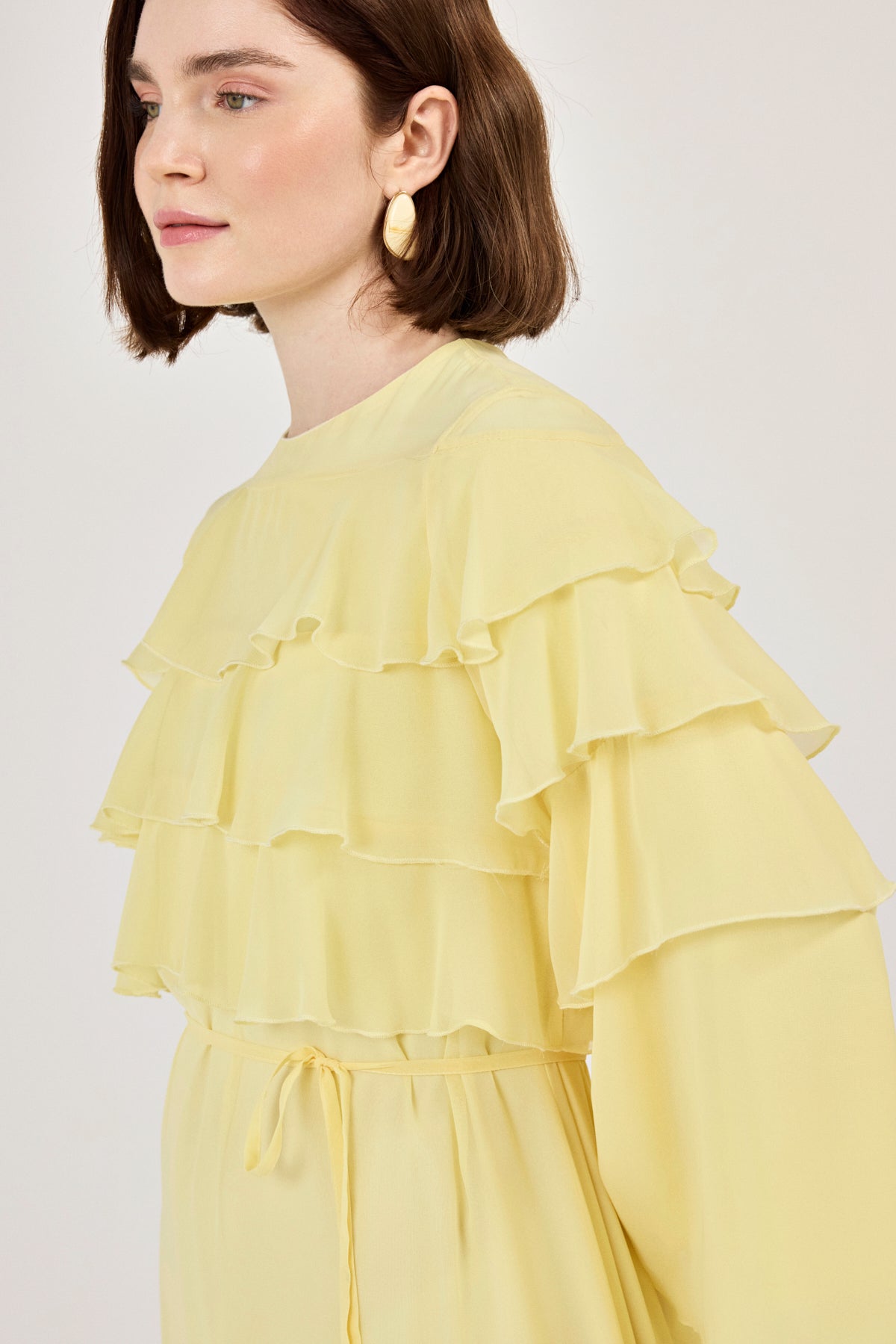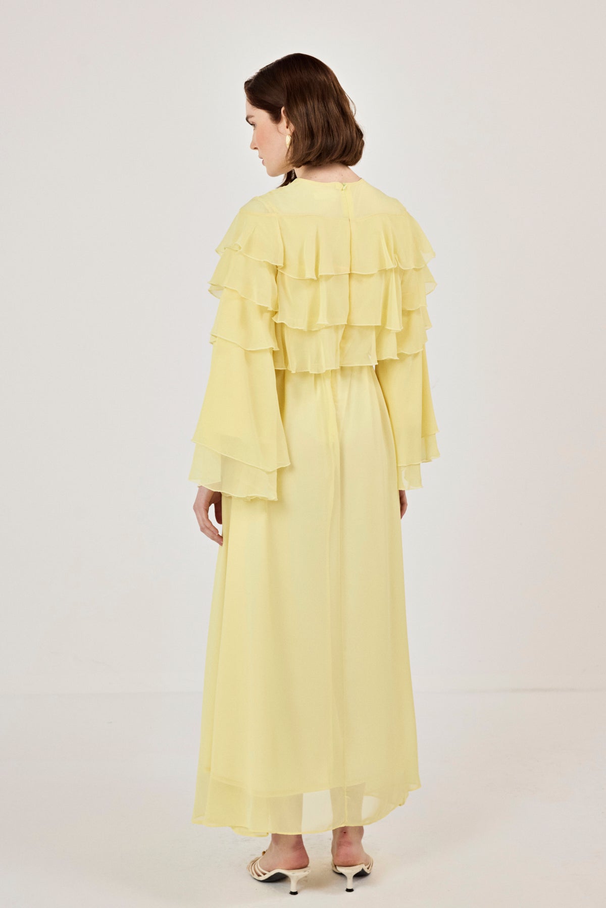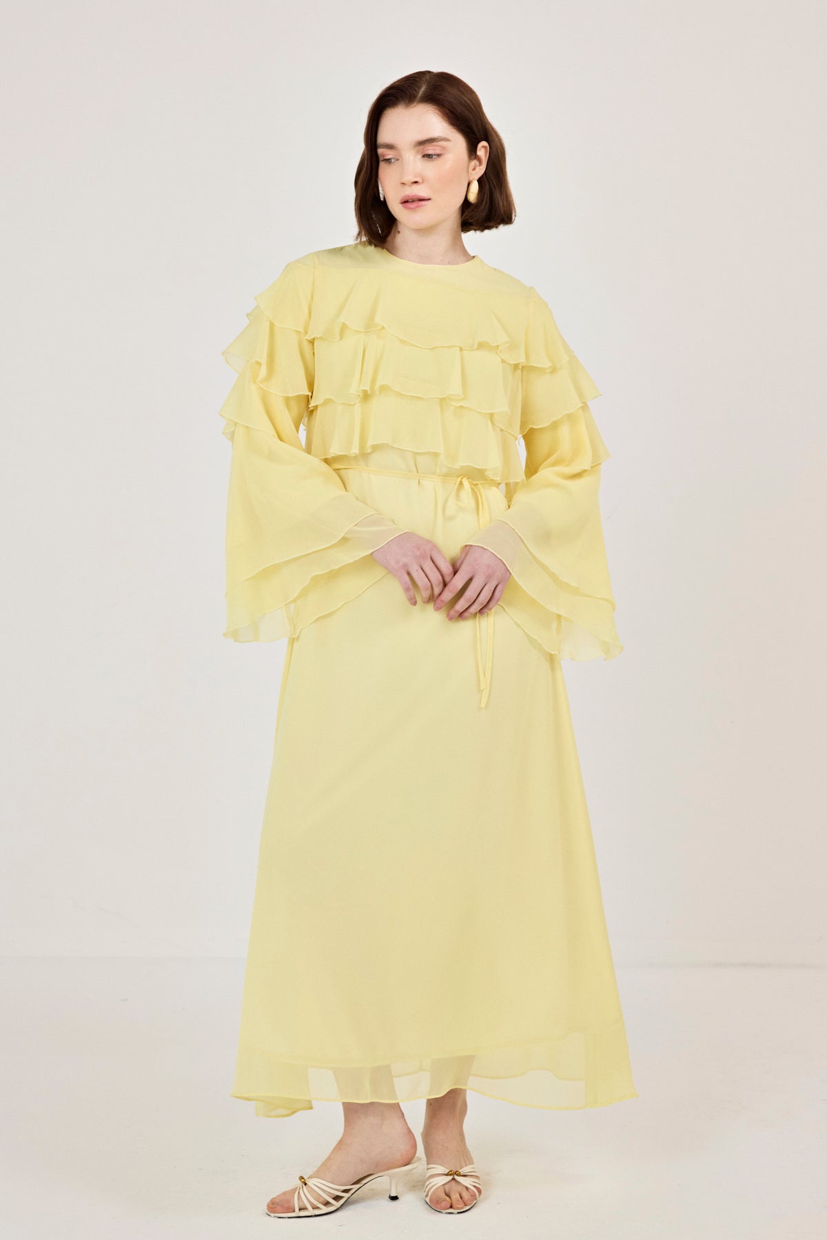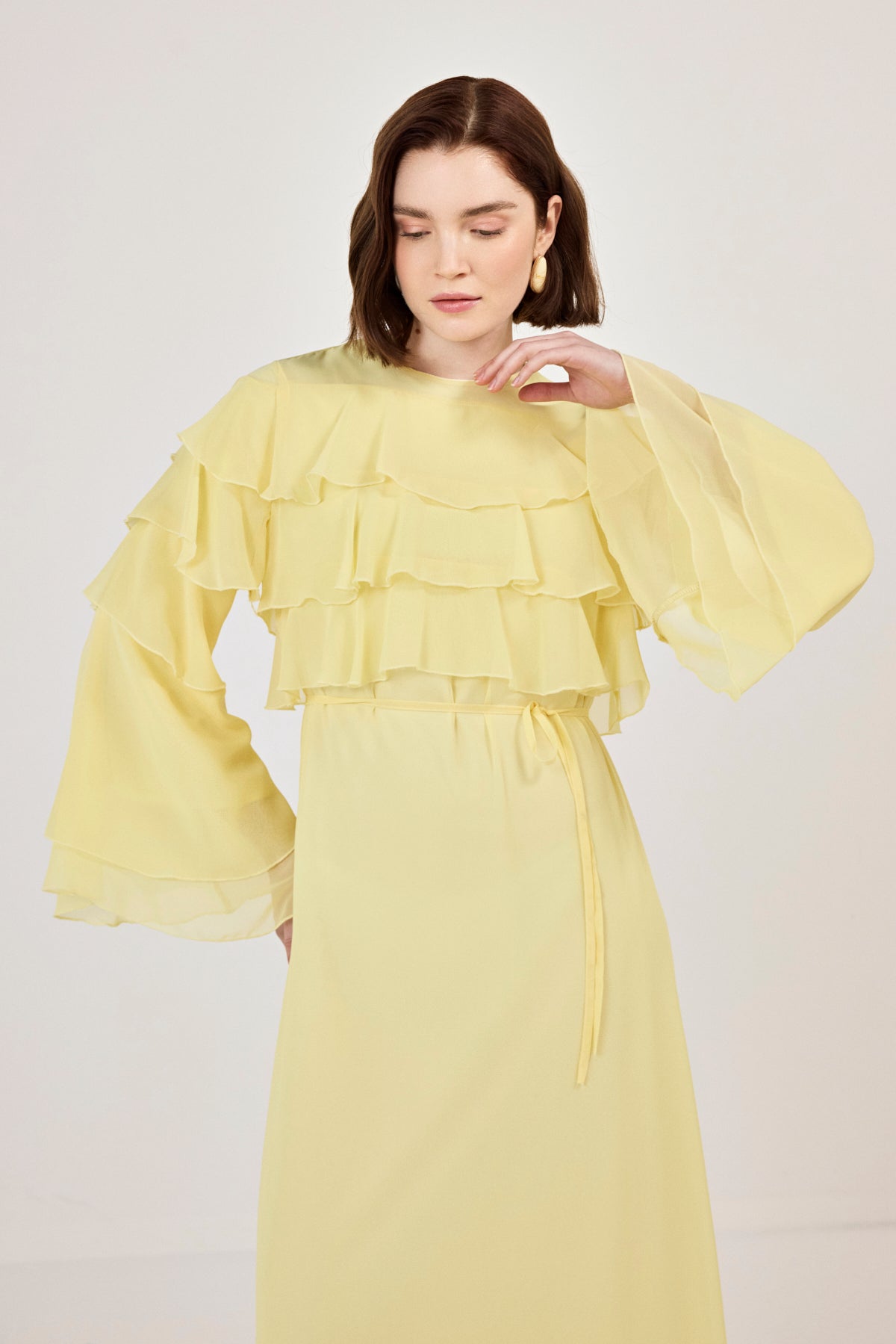 Robadan Fırfır Detaylı Biye Kemerli Şifon Elbise, zarif ve feminen tasarımıyla özel günlerden günlük şıklığa kadar geniş bir kullanım alanı sunar. Hafif ve akışkan şifon kumaşı sayesinde gün boyu konfor sağlarken, robadan başlayan fırfır detayları elbiseye romantik bir hava katar.