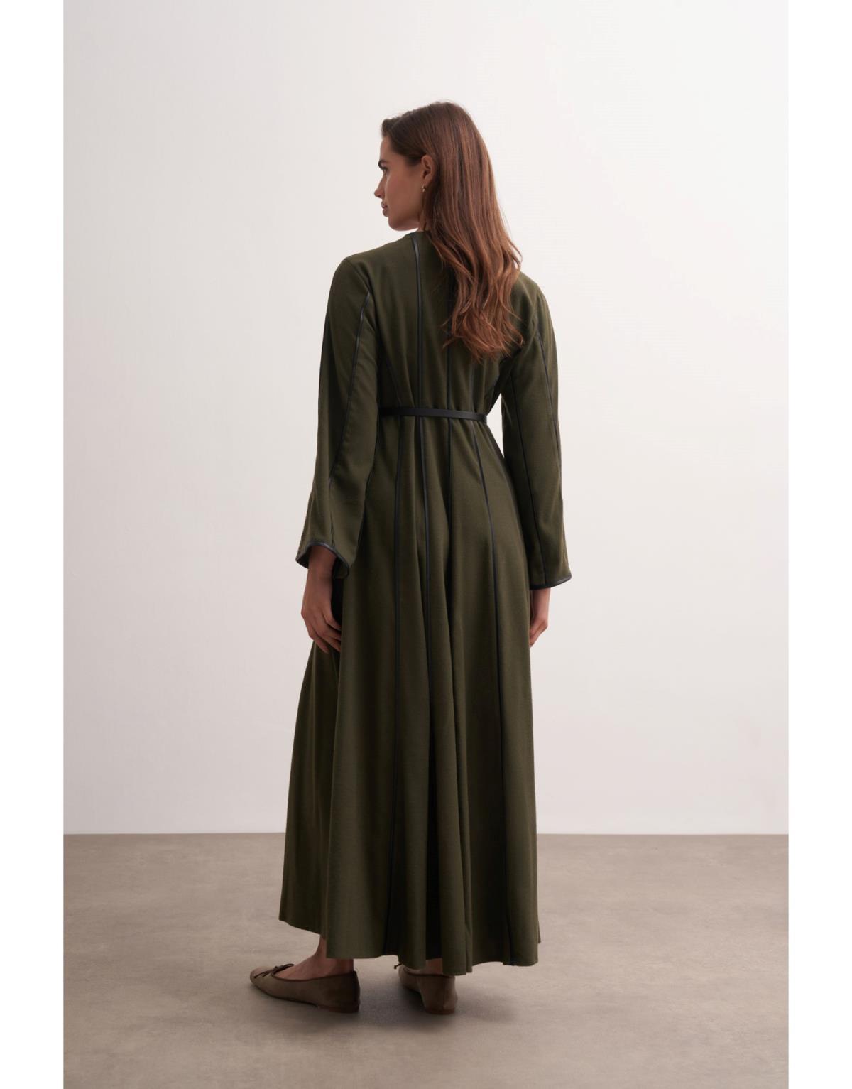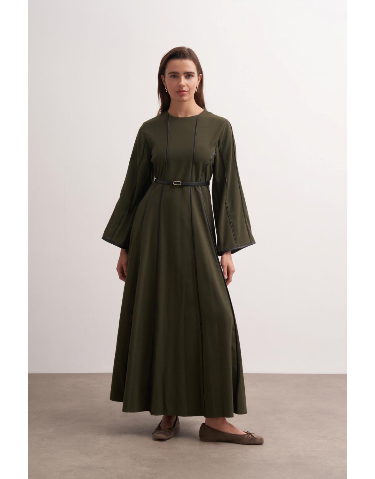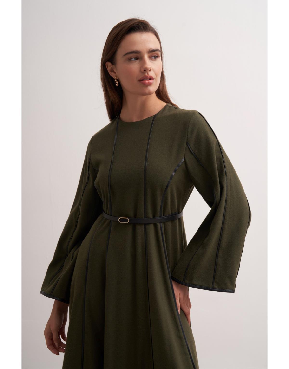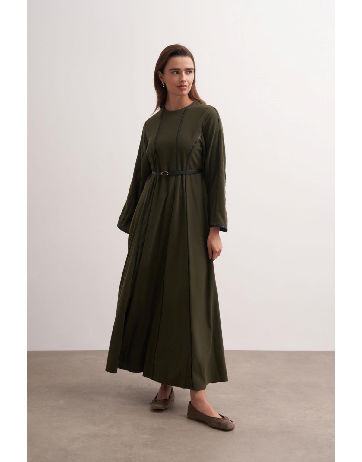Haki Şerit Detaylı Örme Kaşe Elbise