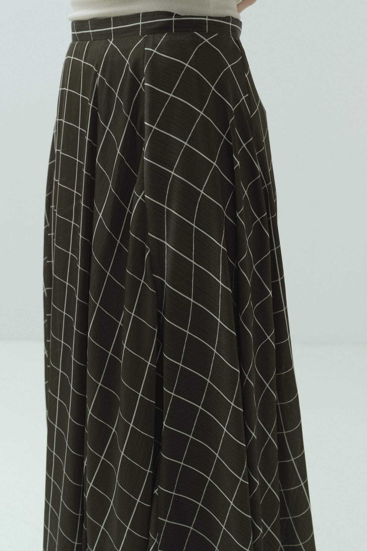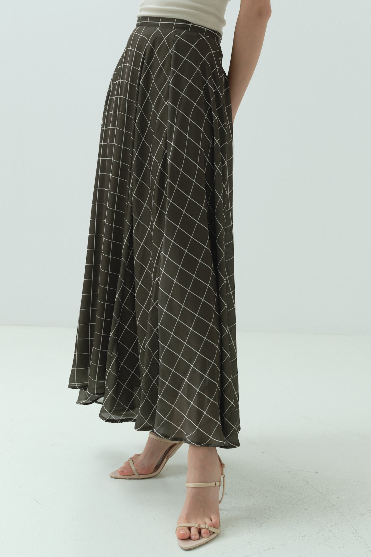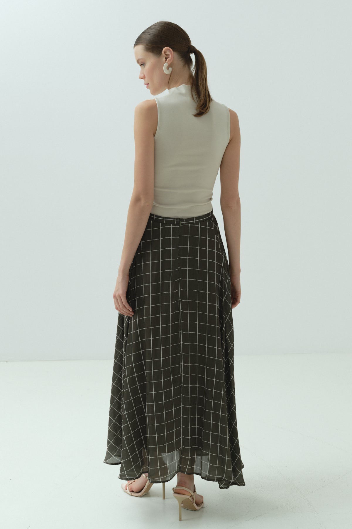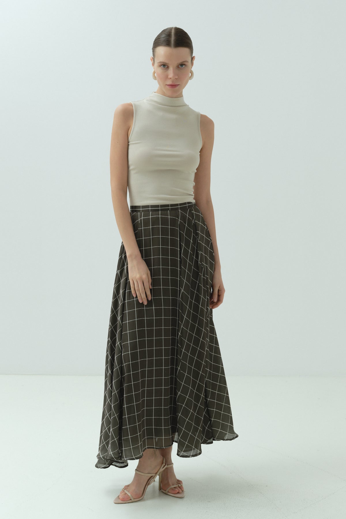 Kareli Şifon Saten Etek, zarif dokusu ve hareketli yapısıyla şık kombinlerin tamamlayıcı parçasıdır. Şifon saten kumaşın hafif ve akıcı yapısı eteğe feminen bir duruş kazandırırken, kareli deseni zamansız ve modern bir görünüm sunar.