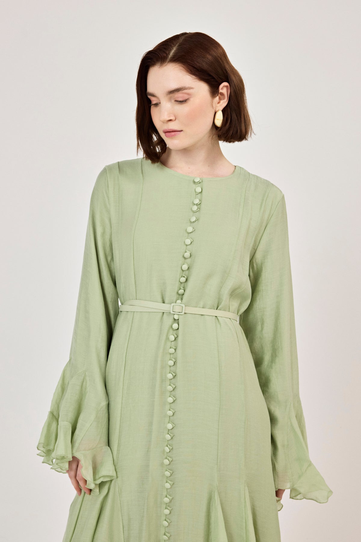 İnce Tensel Volan Detaylı Boydan Düğmeli Elbise Çağla Yeşili