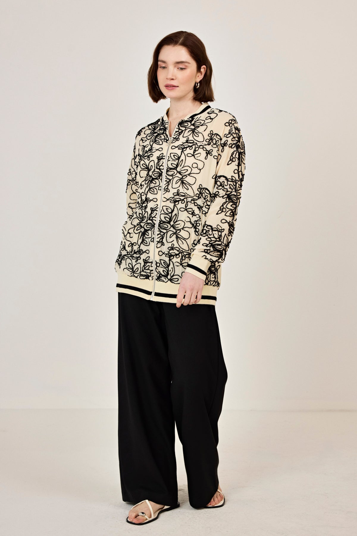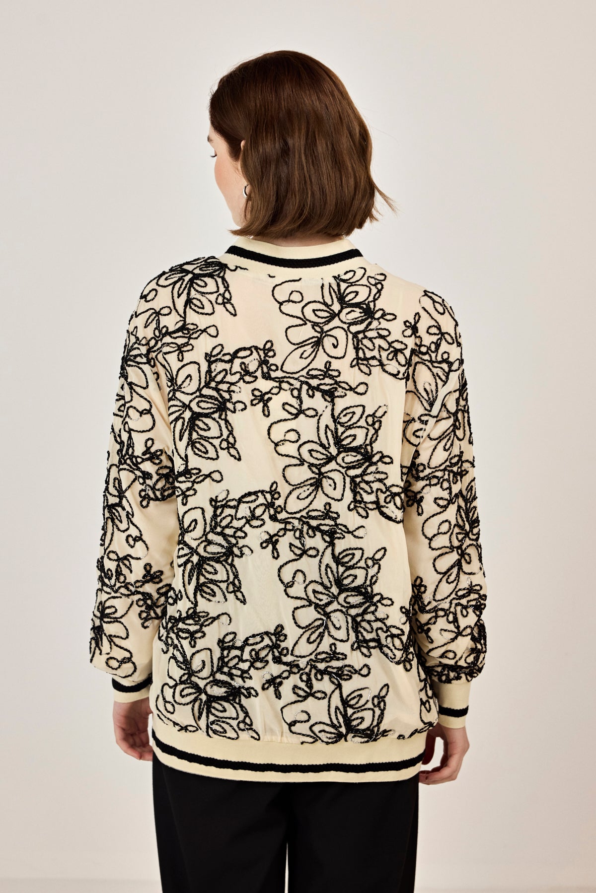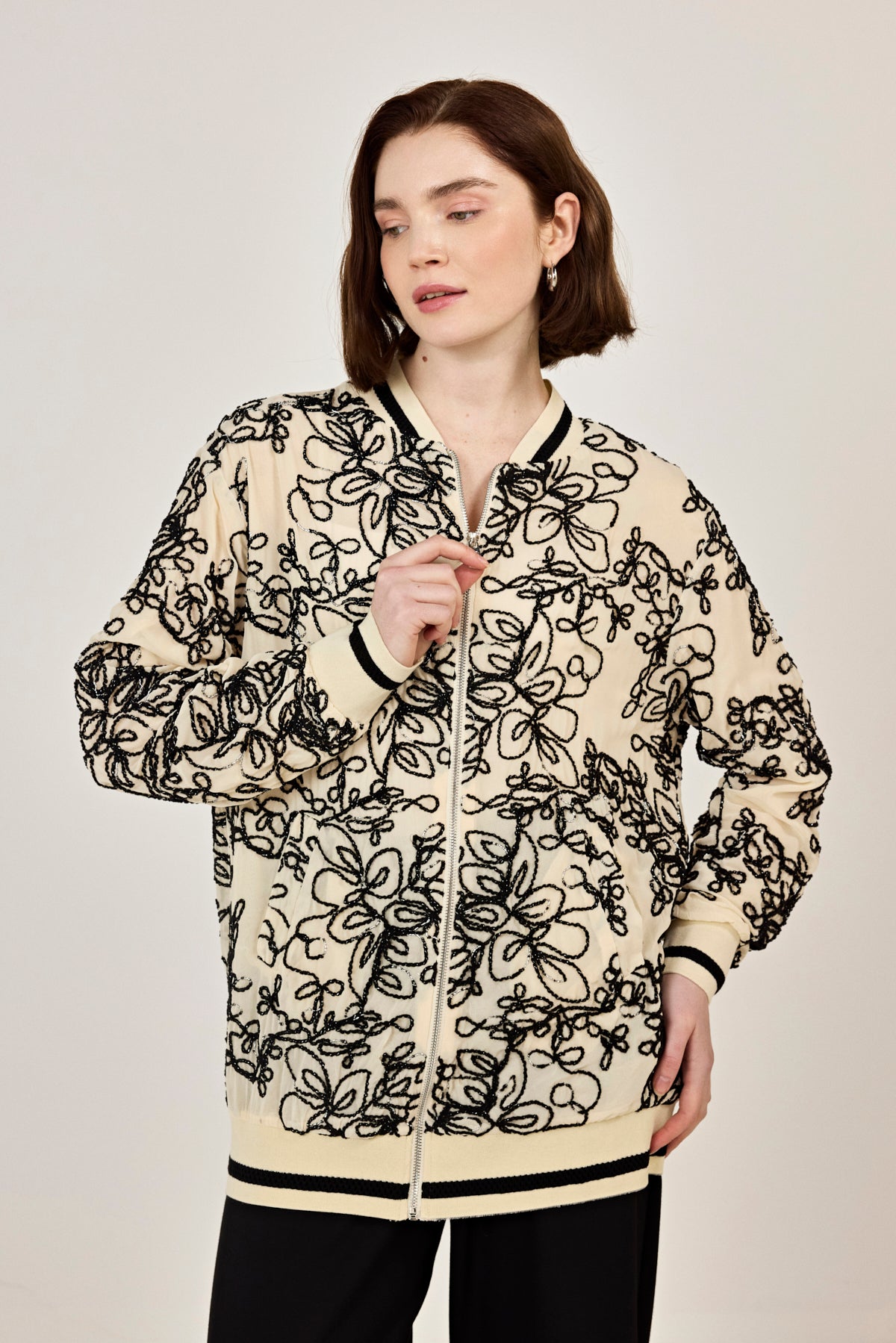 Nakışlı şifon Fermuar Detaylı Ceket Bej-Siyah