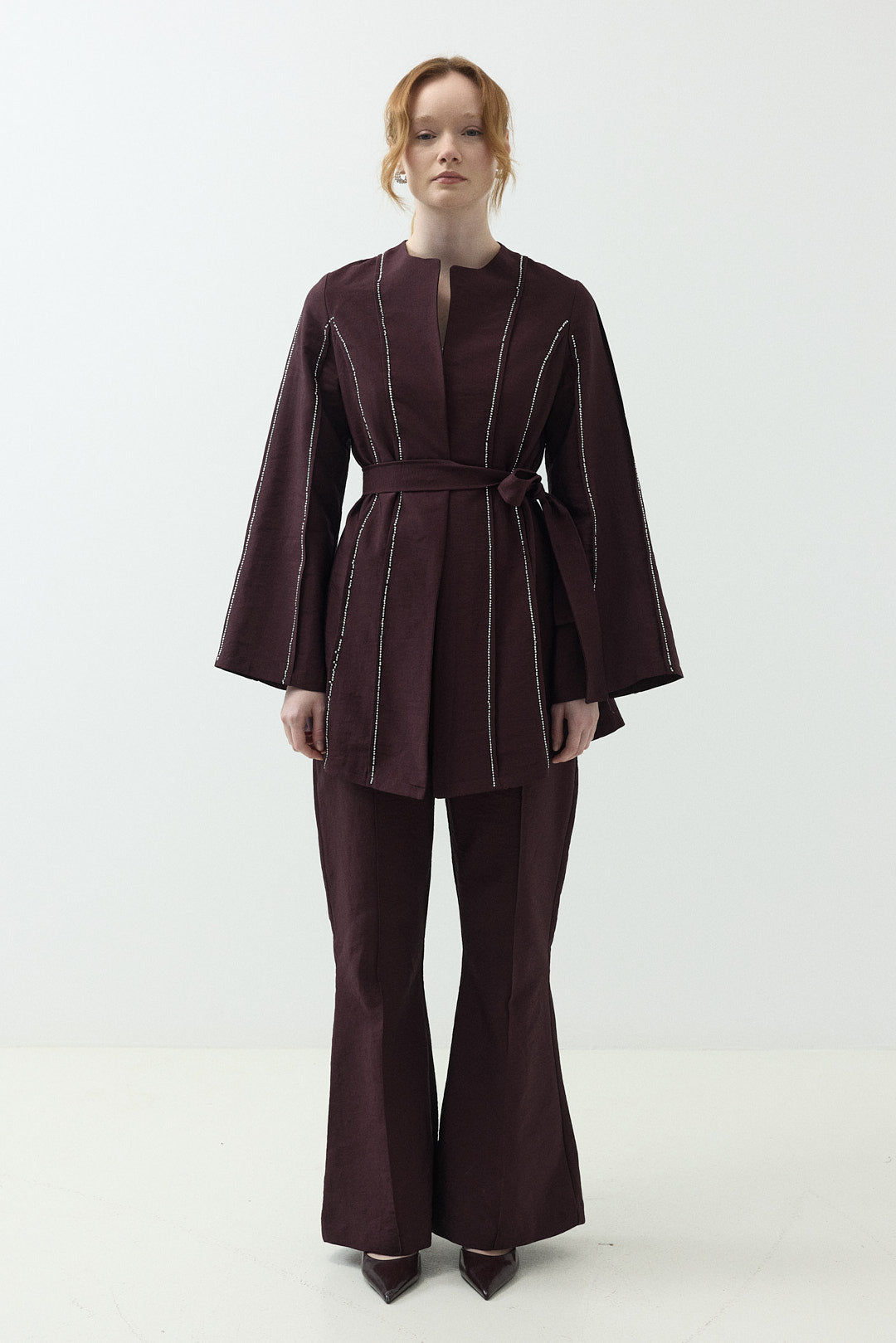 Garnili Yelekli Keten İkili Takım - Bordo