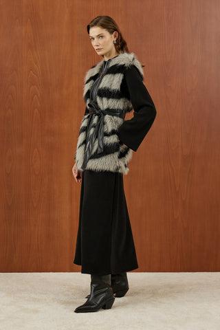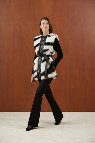 Beyaz Siyah Zebra Desenli Fermuarlı Kürk Yelek