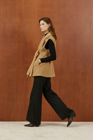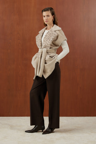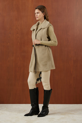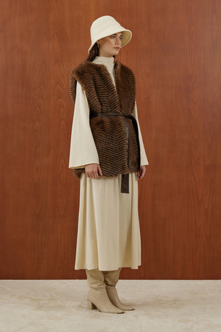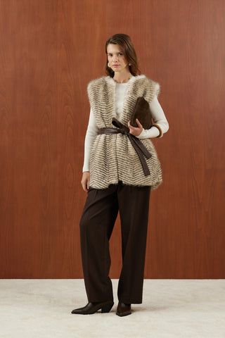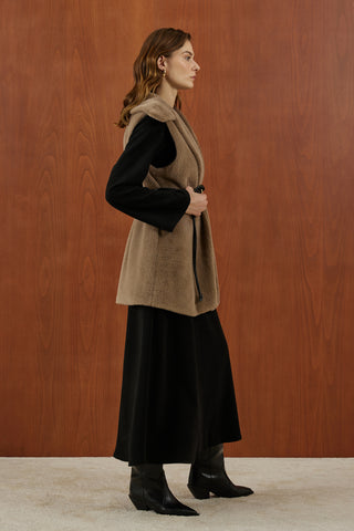 Taş Rengi Kemer Detaylı Kürk Yelek