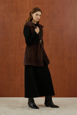 Kahverengi Kemer Detaylı Yakalı Kürk Yelek