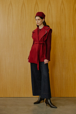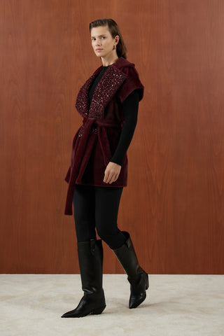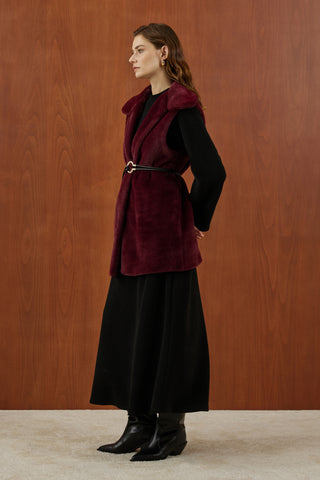 Bordo Kemer Detaylı Yakalı Kürk Yelek
