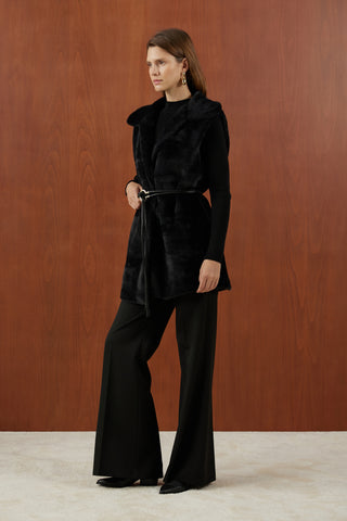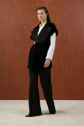 Siyah Kemer Detaylı Yakalı Kürk Yelek