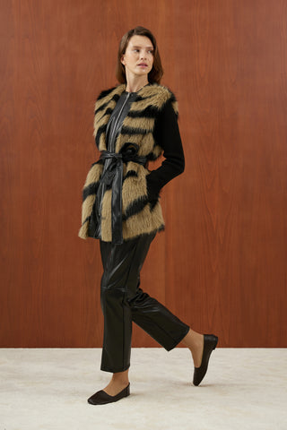 Kahve Siyah Zebra Desenli Fermuarlı Kürk Yelek