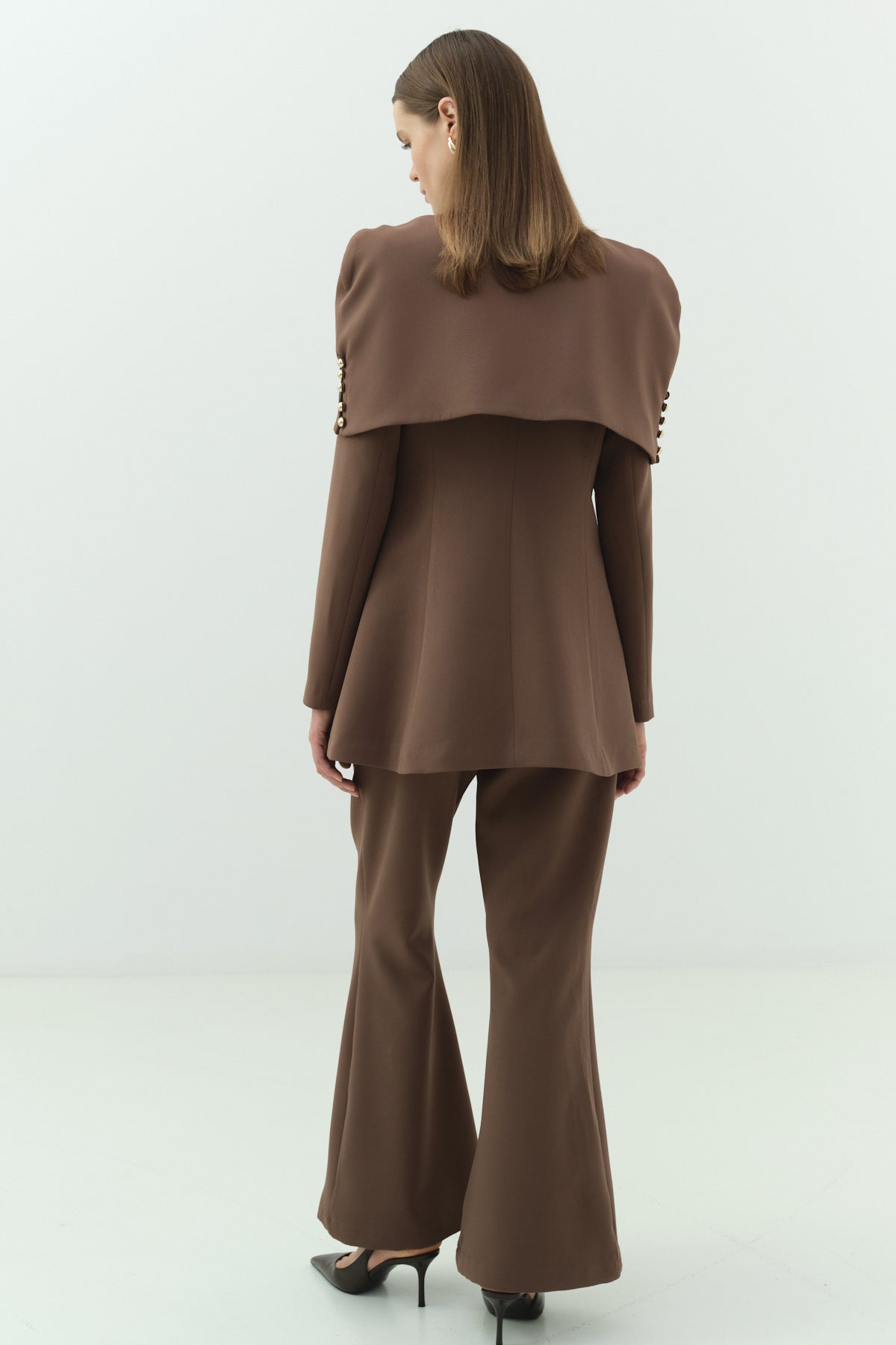 Yüksek bel, düz paça pantolonu ile hem uzun hem de dengeli bir siluet sunar. Takım olarak kullanıma uygun olduğu gibi, parçalar ayrı ayrı kombinlenerek de farklı stiller yaratılabilir.