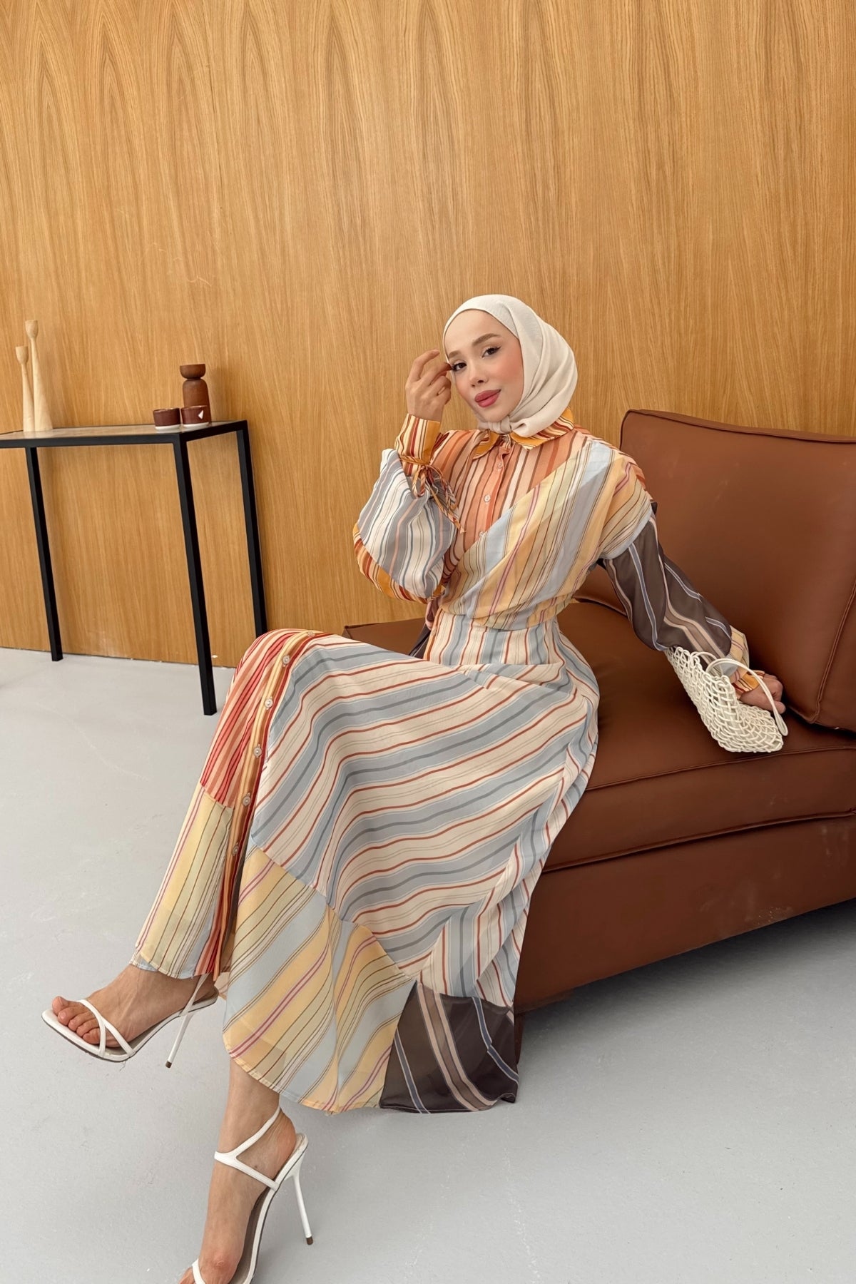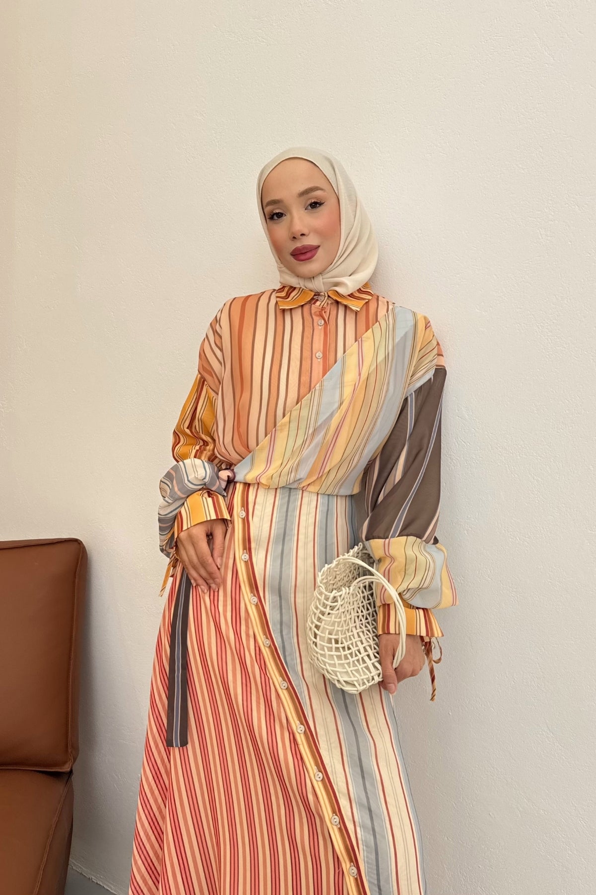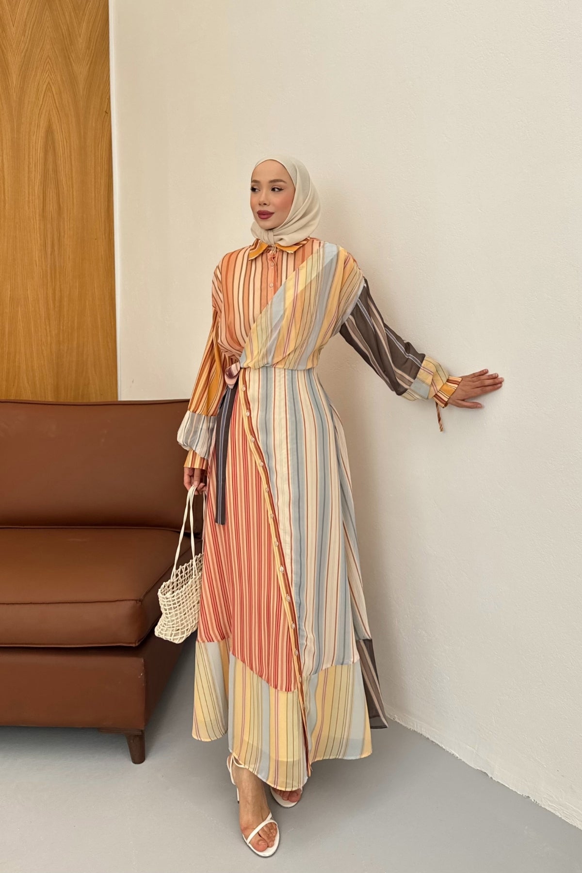 Çizgili Şifon Kruvaze Kapama Tasarım Elbise Oranj