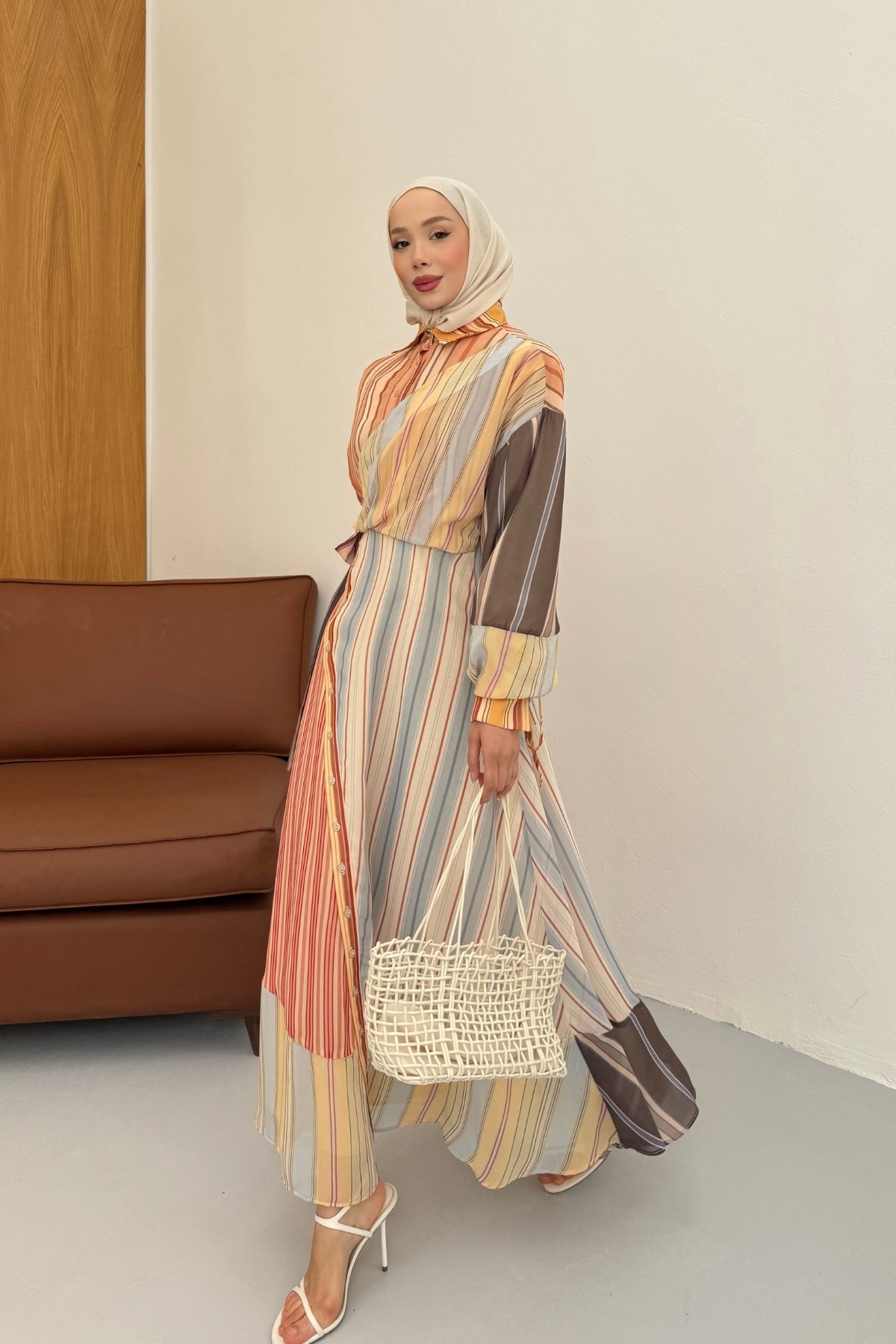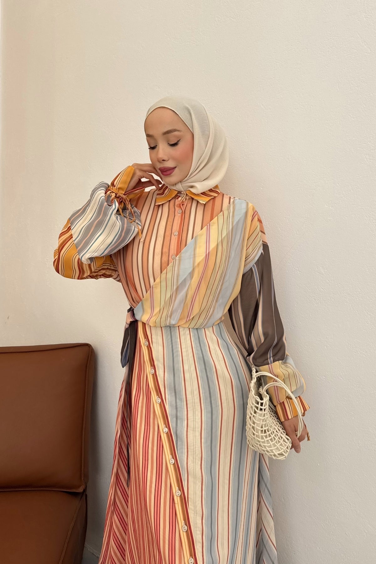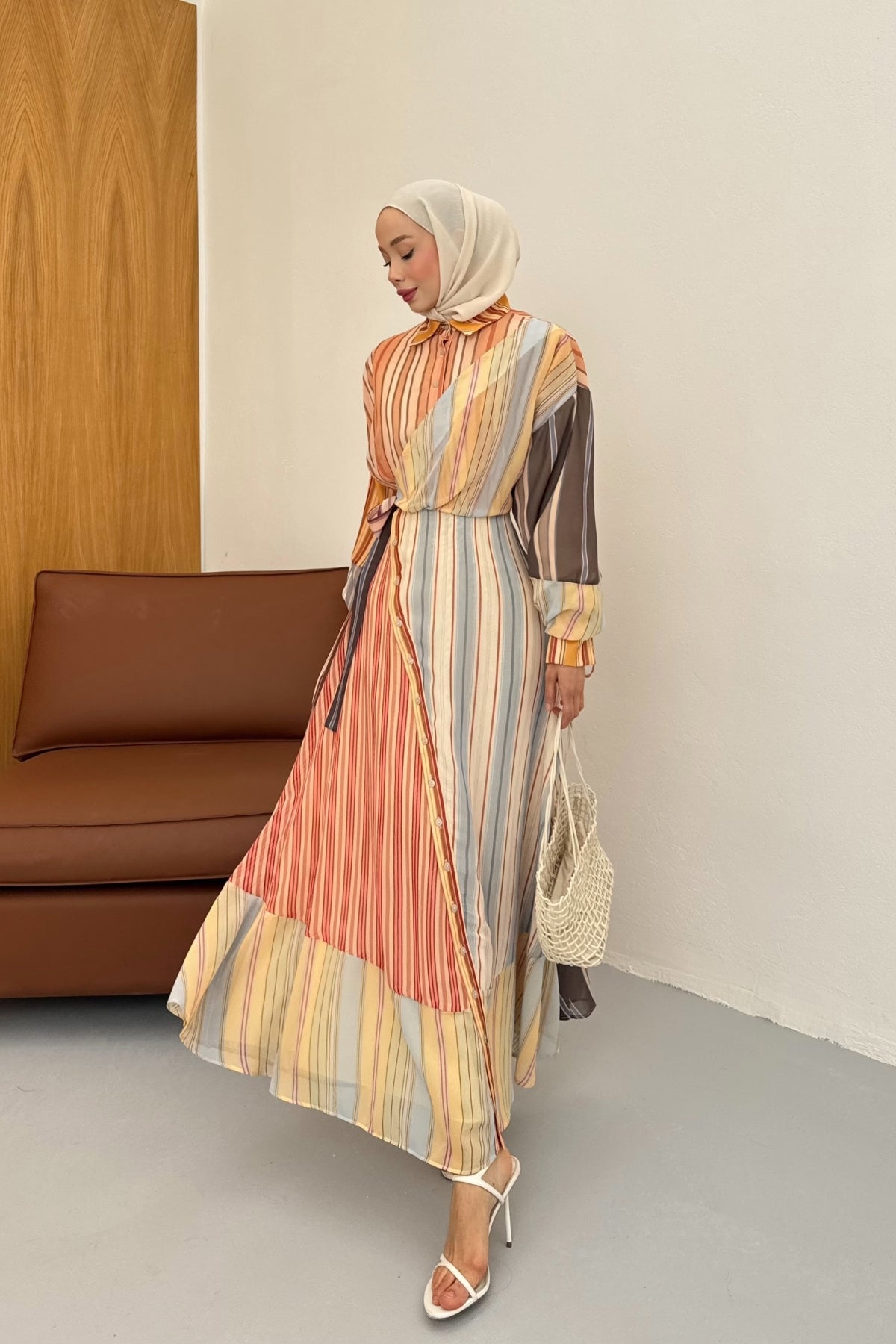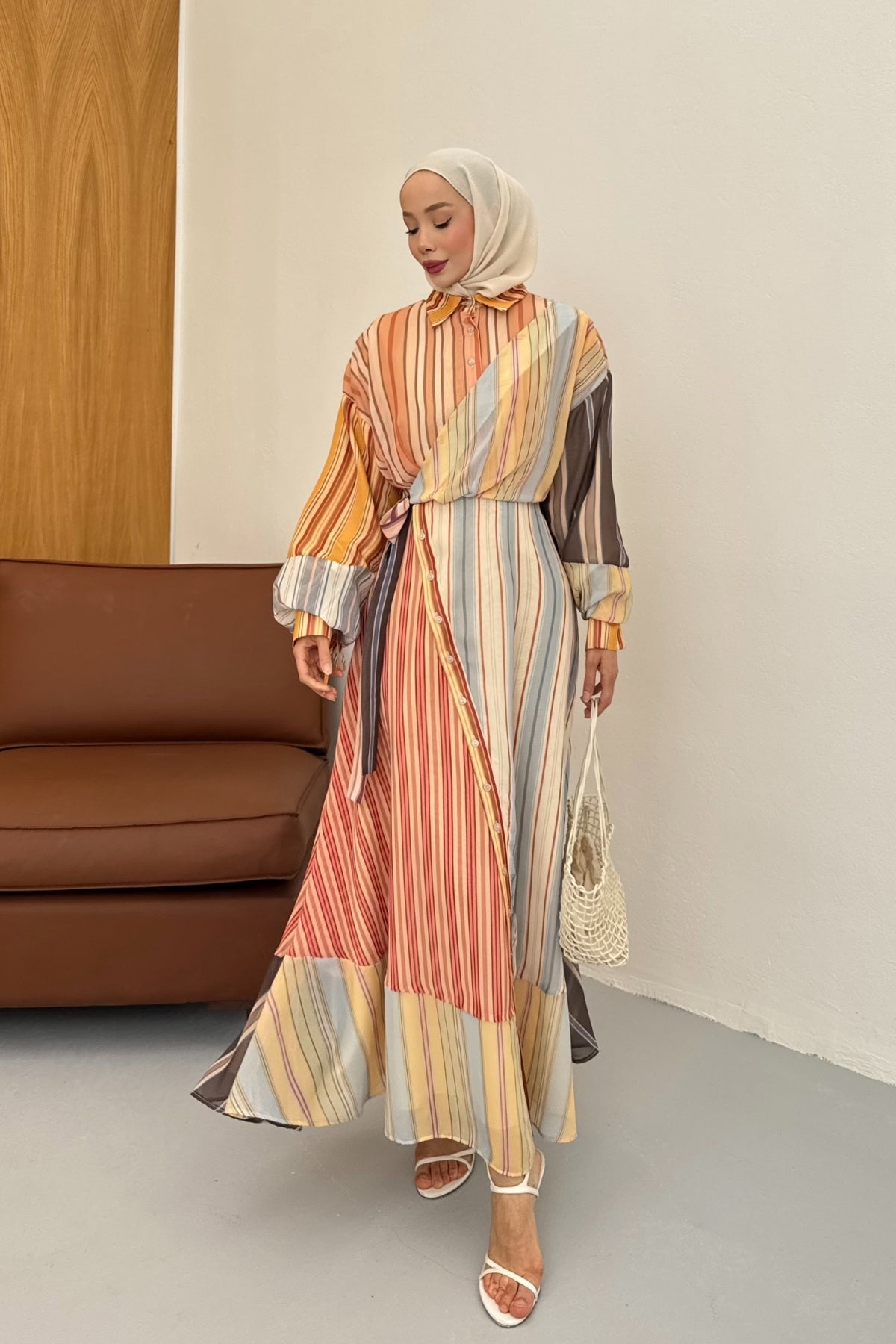 Çizgili Şifon Kruvaze Kapama Tasarım Elbise Oranj