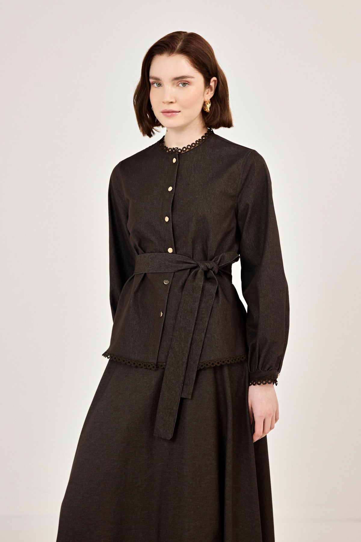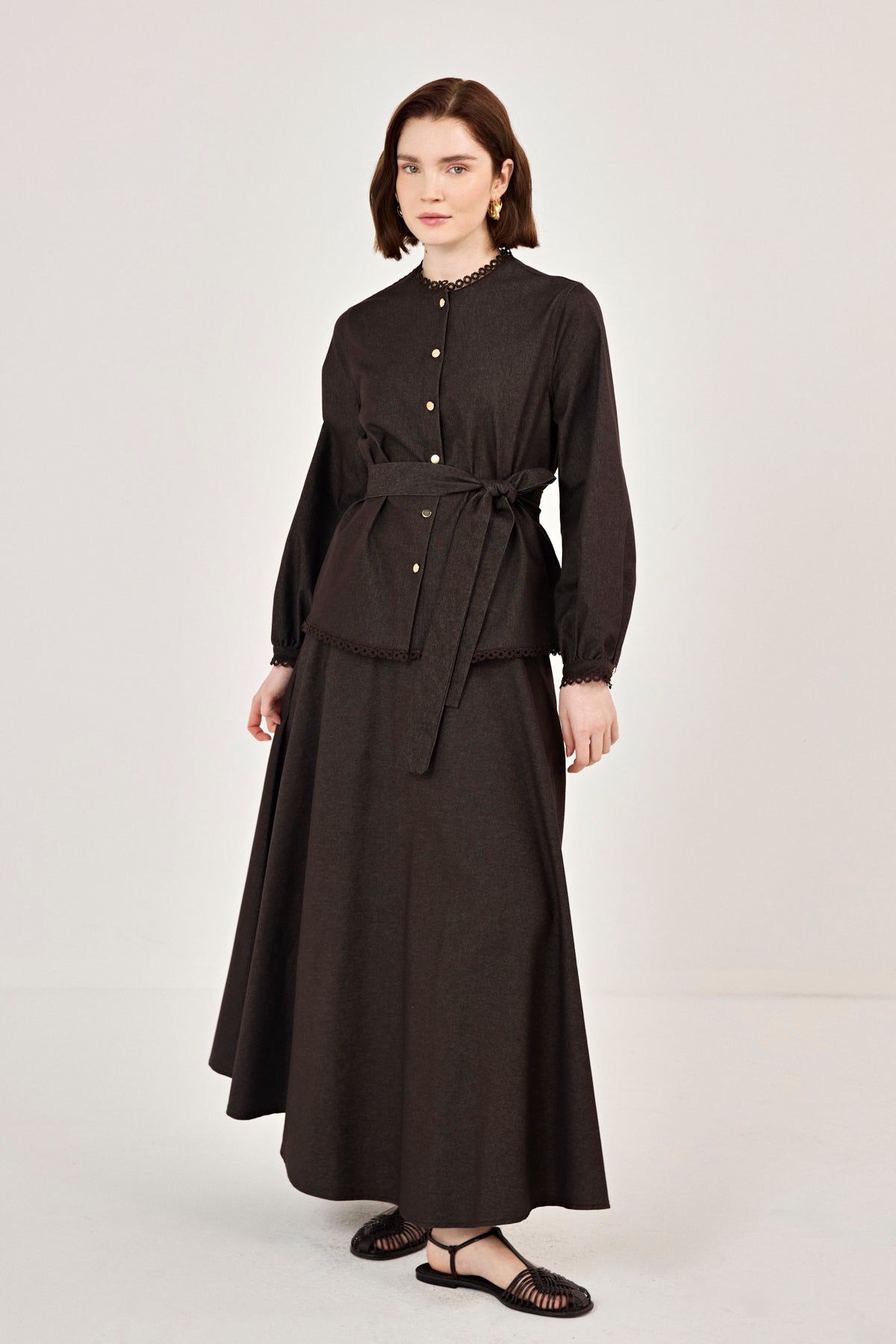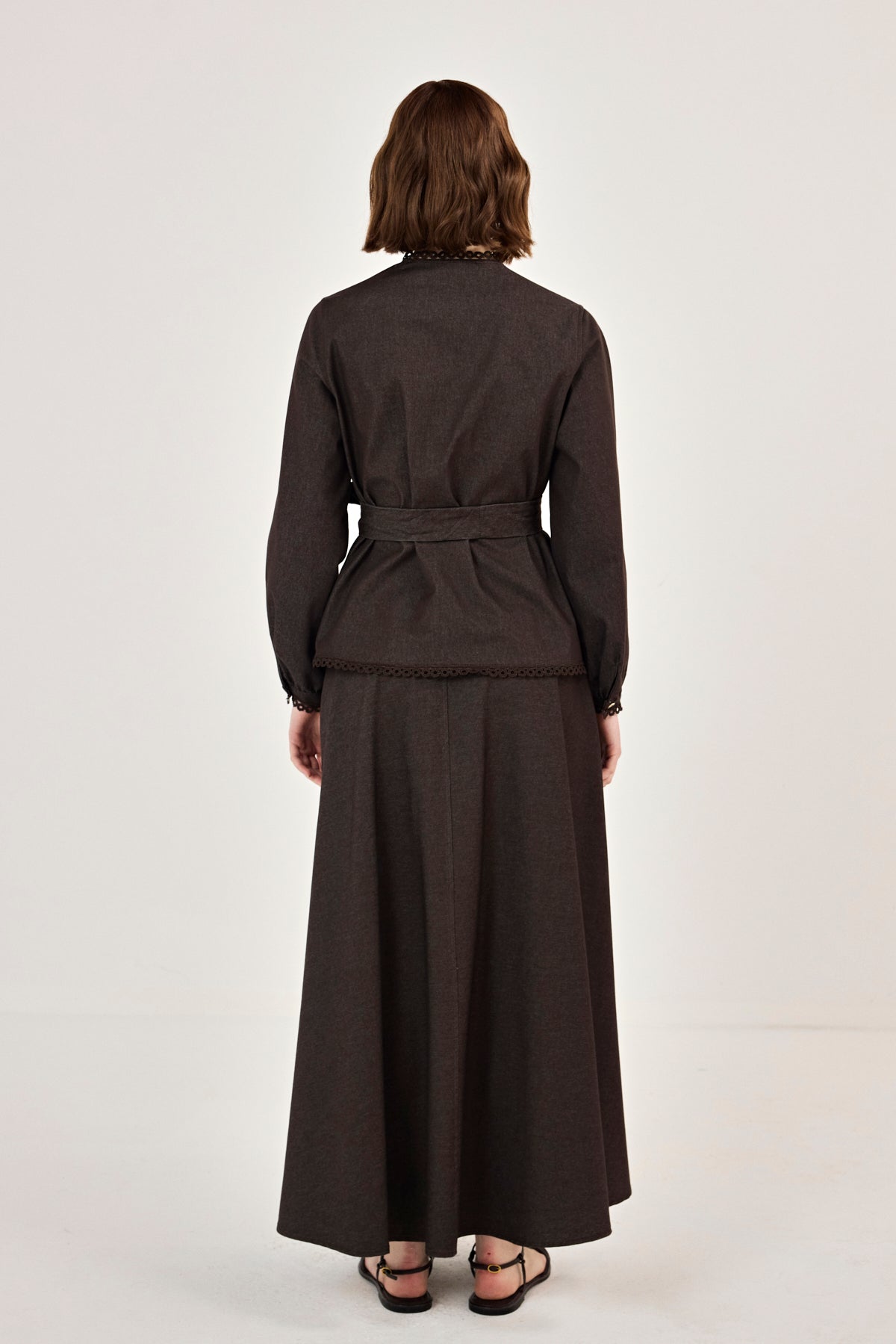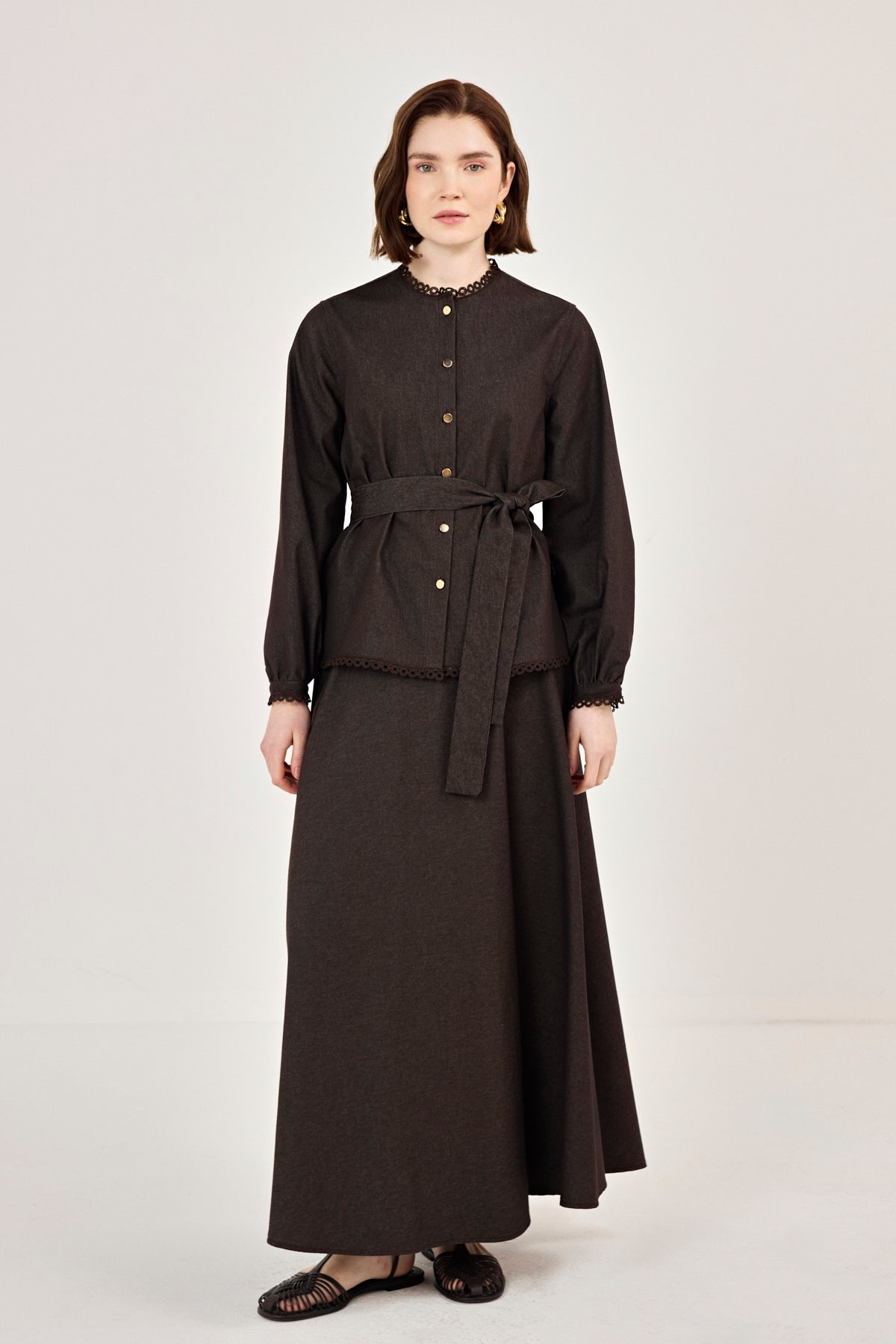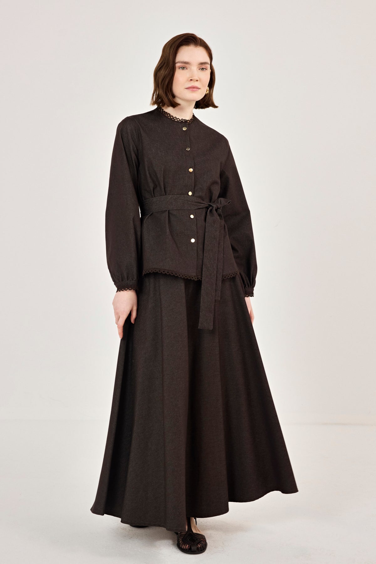 Dantel Detaylı Etekli Kot Takım Kahverengi