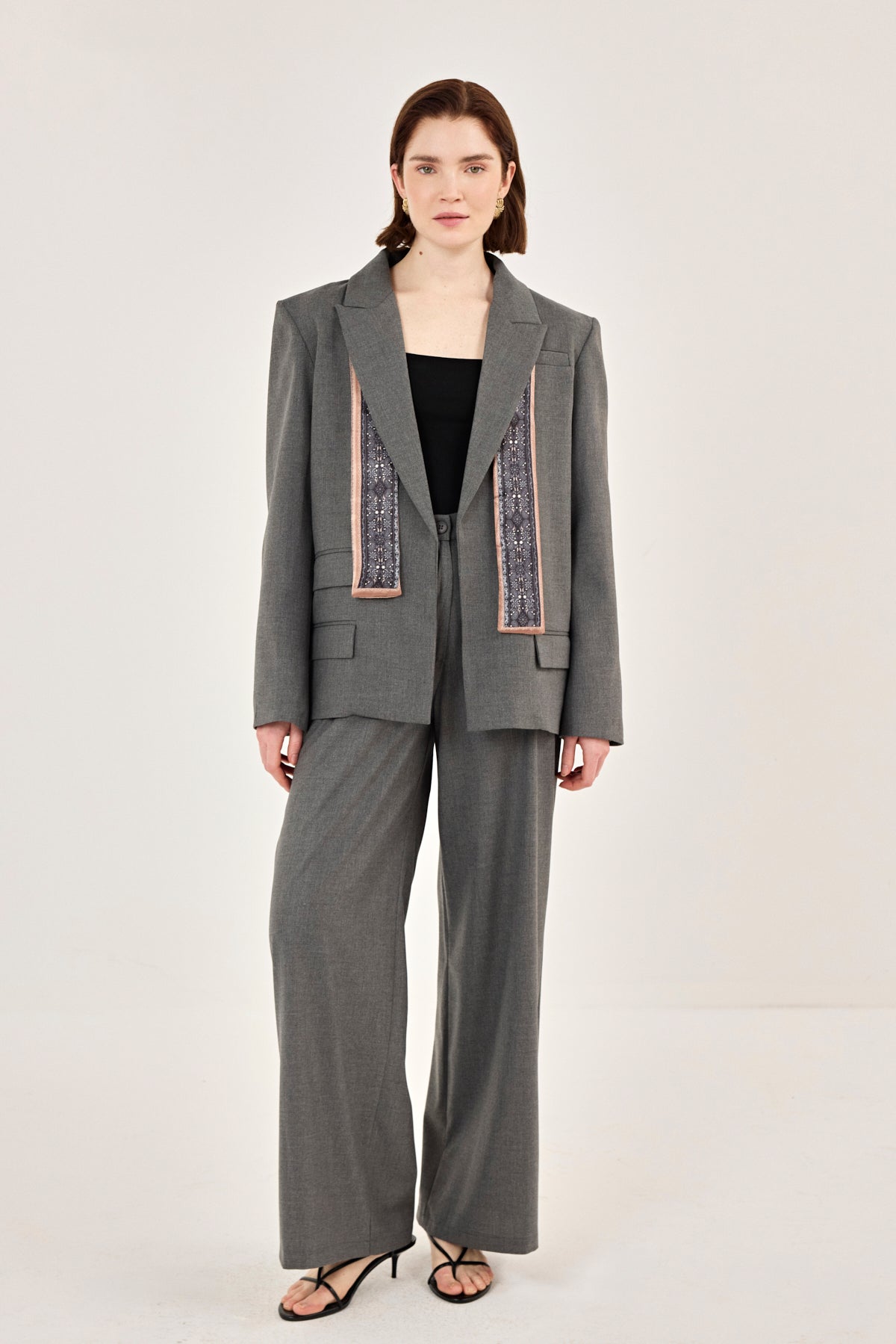 Fular Detaylı Ceket Pantolon Takım, klasik takım şıklığını modern ve feminen dokunuşlarla yeniden yorumlayan özel bir tasarımdır. Ceket üzerinde yer alan fular detayı, tasarıma özgün ve sofistike bir hava katarken stilinizi güçlü bir şekilde tamamlar. Akıcı ve rahat kesimli pantolonu ise gün boyu konforlu bir kullanım sunar.