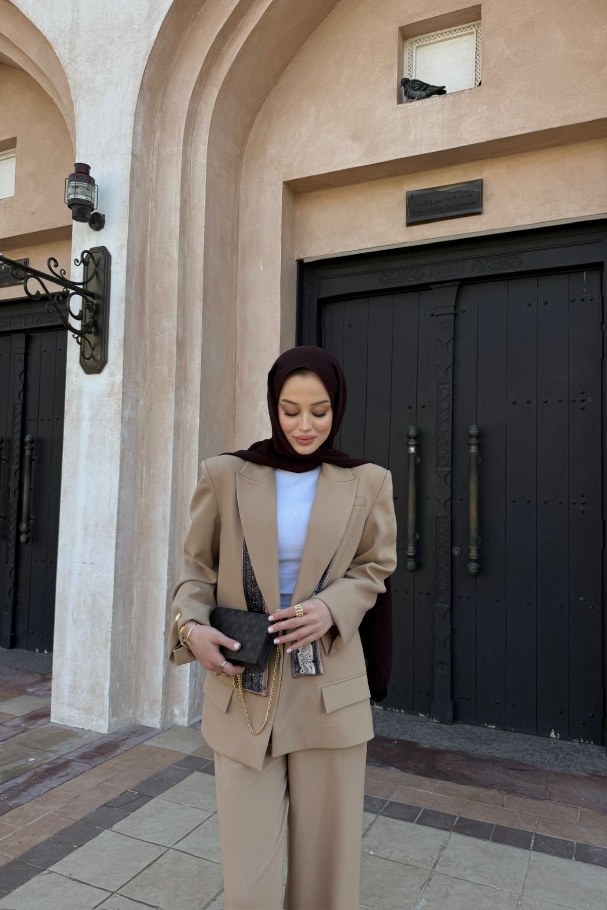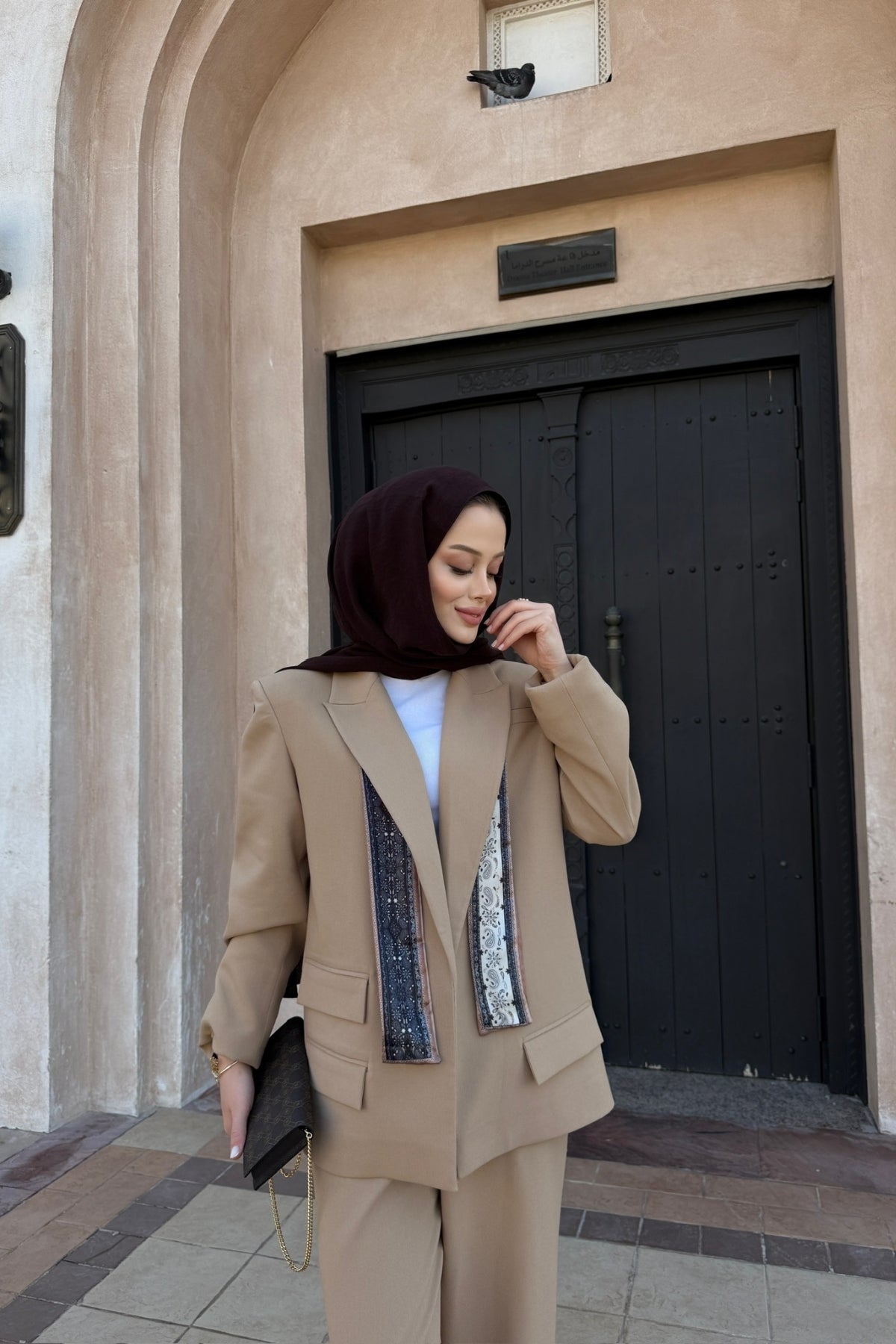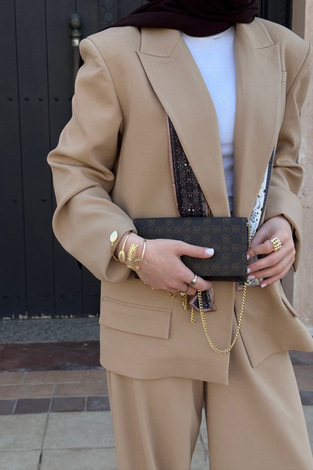Fular Detaylı Ceket Pantolon Takım, klasik takım şıklığını modern ve feminen dokunuşlarla yeniden yorumlayan özel bir tasarımdır. Ceket üzerinde yer alan fular detayı, tasarıma özgün ve sofistike bir hava katarken stilinizi güçlü bir şekilde tamamlar. Akıcı ve rahat kesimli pantolonu ise gün boyu konforlu bir kullanım sunar.