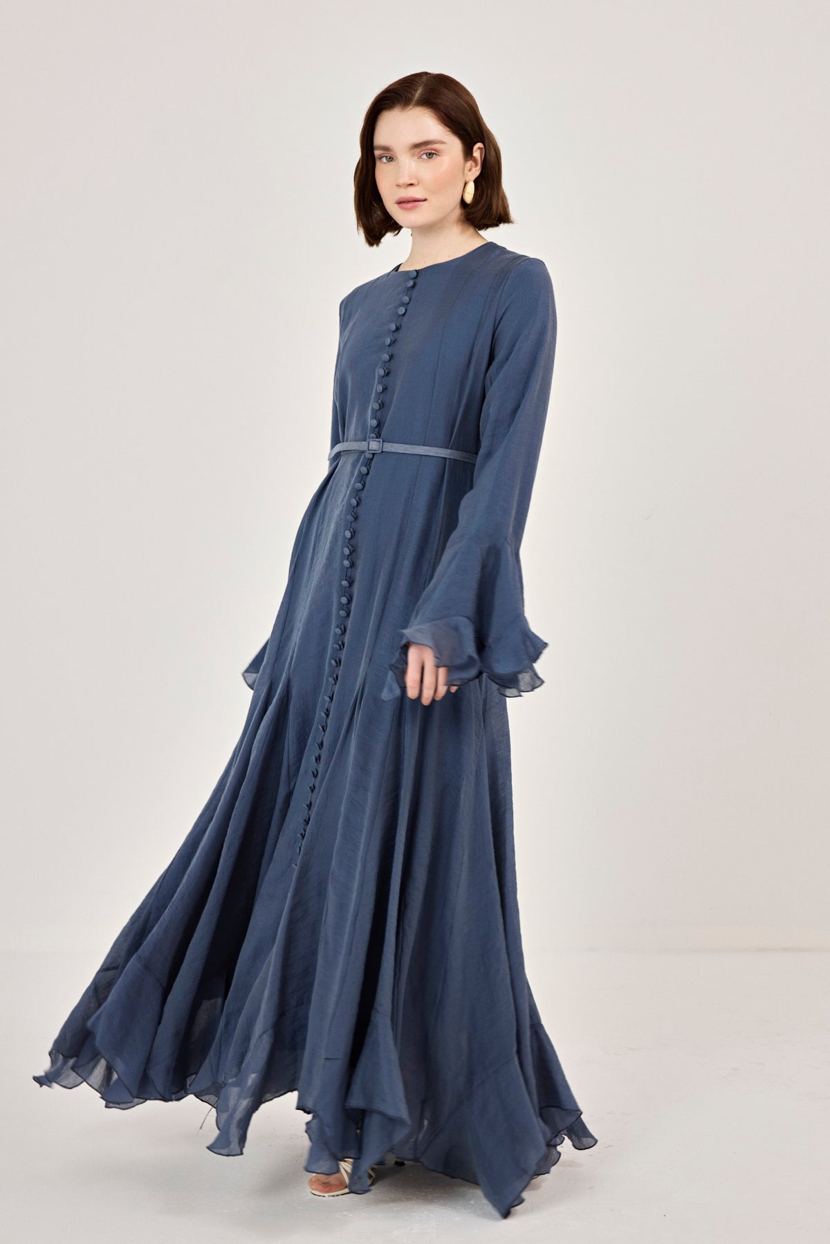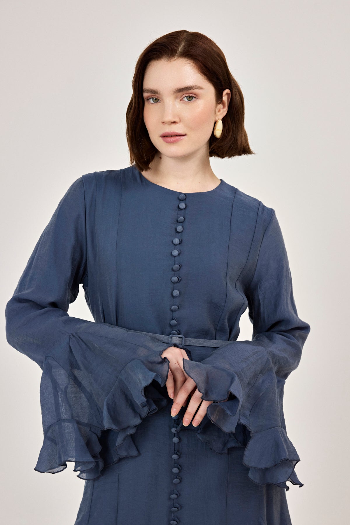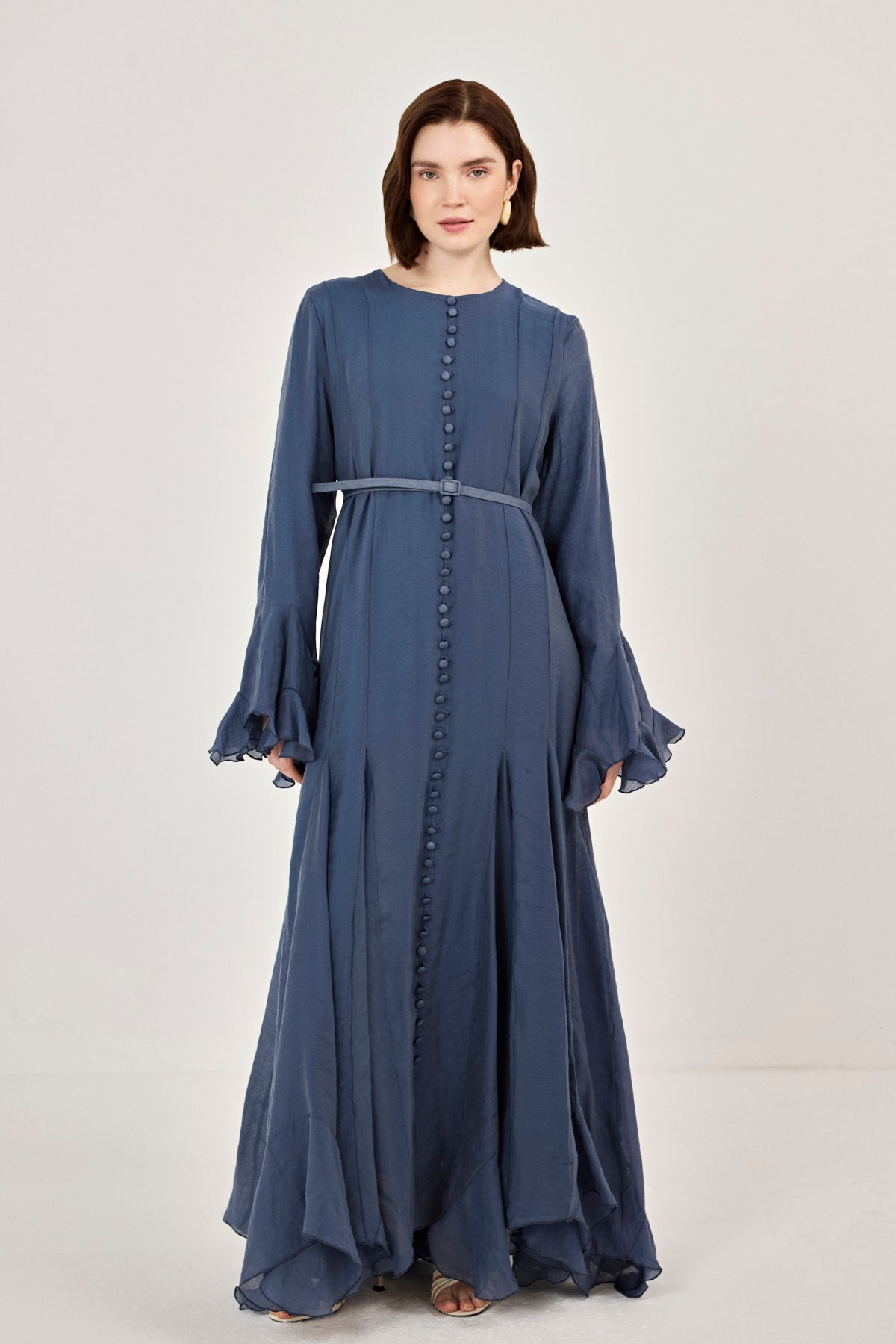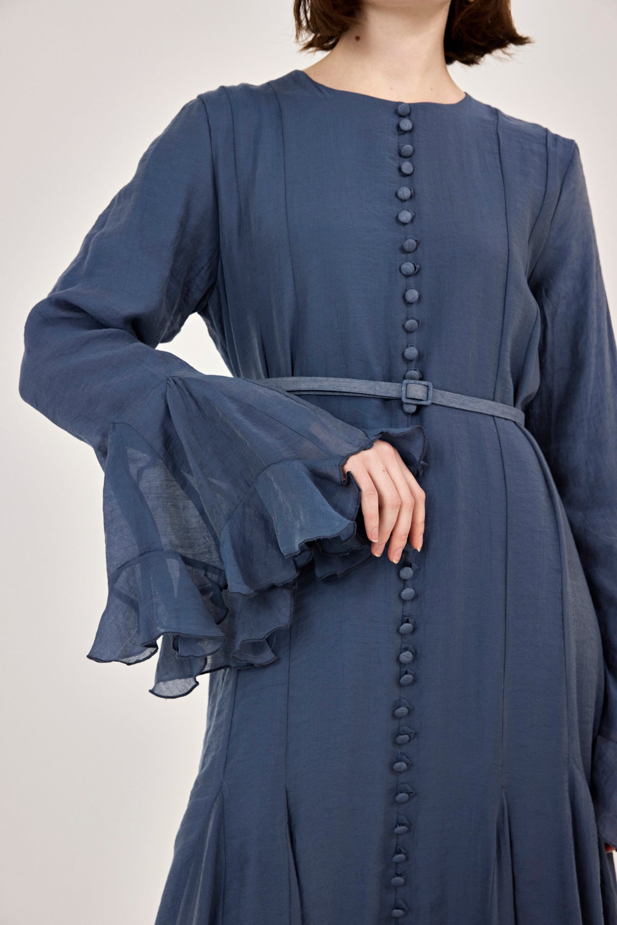 İnce Tensel Volan Detaylı Boydan Düğmeli Elbise Lacivert