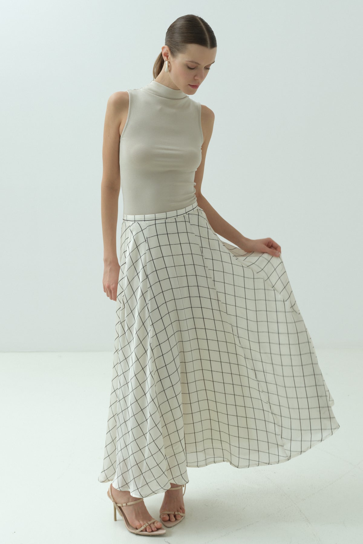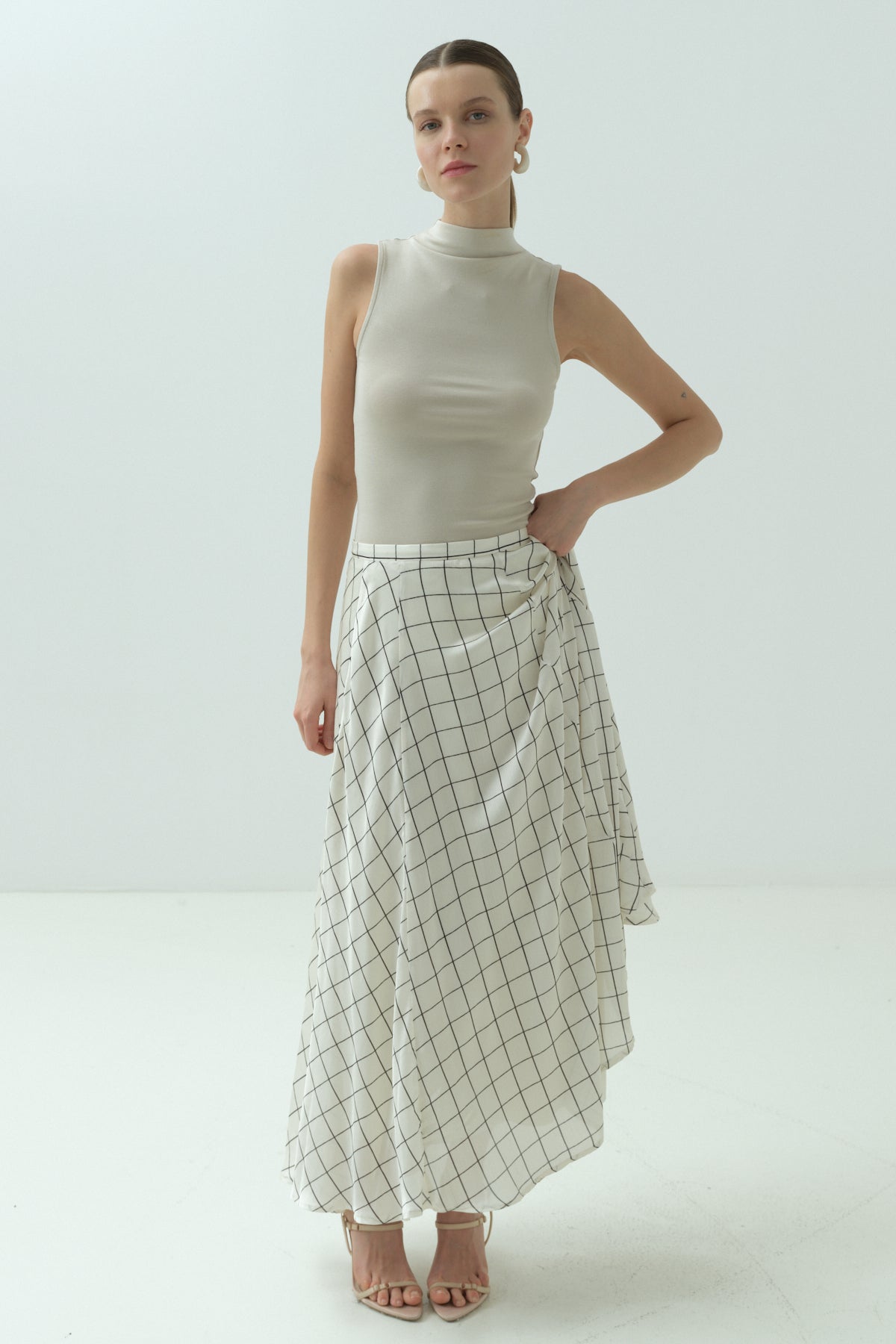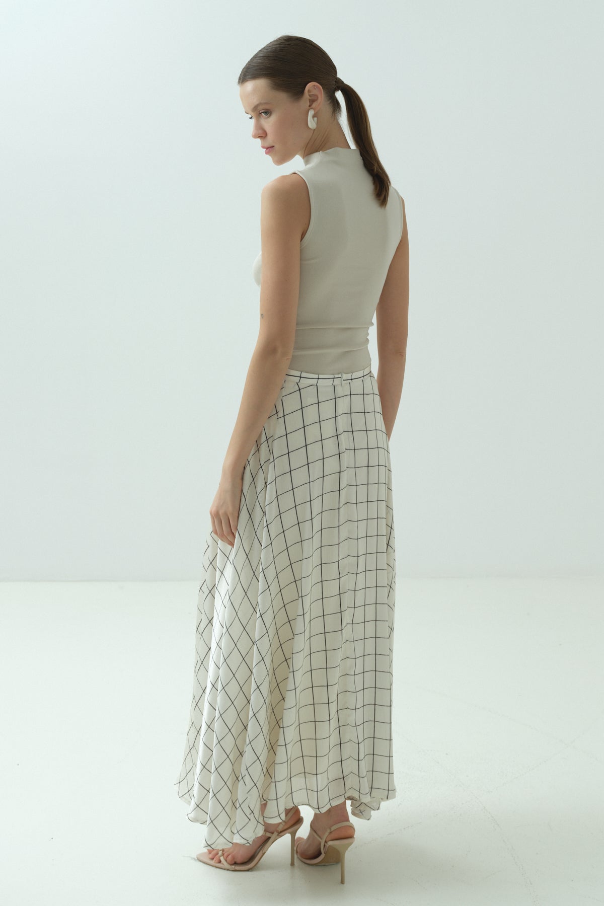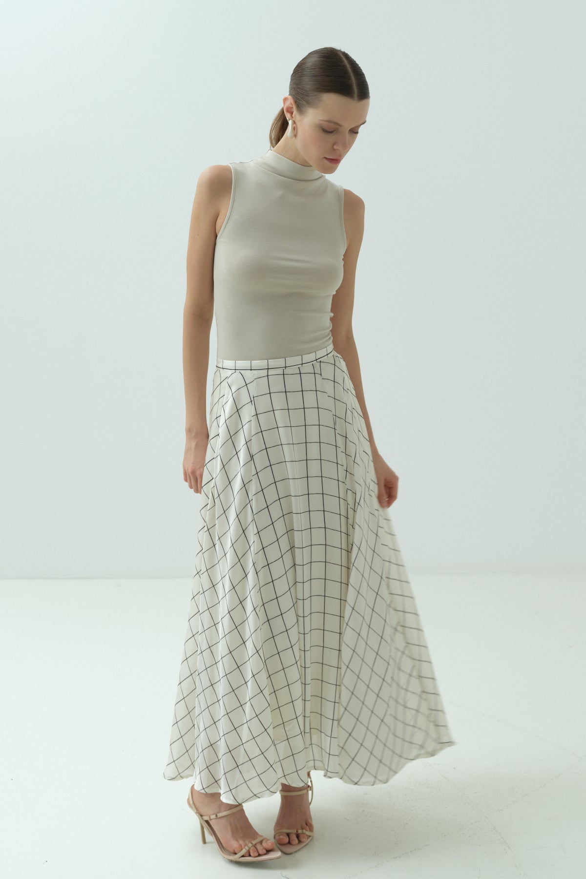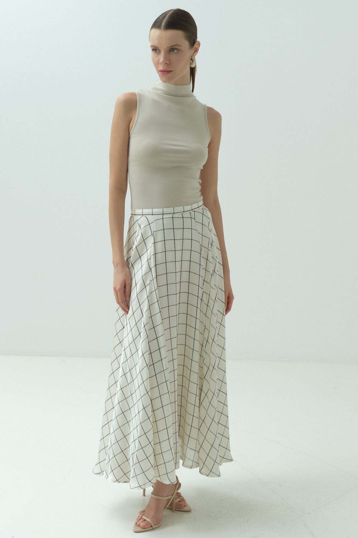 Kareli Şifon Saten Etek, zarif dokusu ve hareketli yapısıyla şık kombinlerin tamamlayıcı parçasıdır. Şifon saten kumaşın hafif ve akıcı yapısı eteğe feminen bir duruş kazandırırken, kareli deseni zamansız ve modern bir görünüm sunar.
