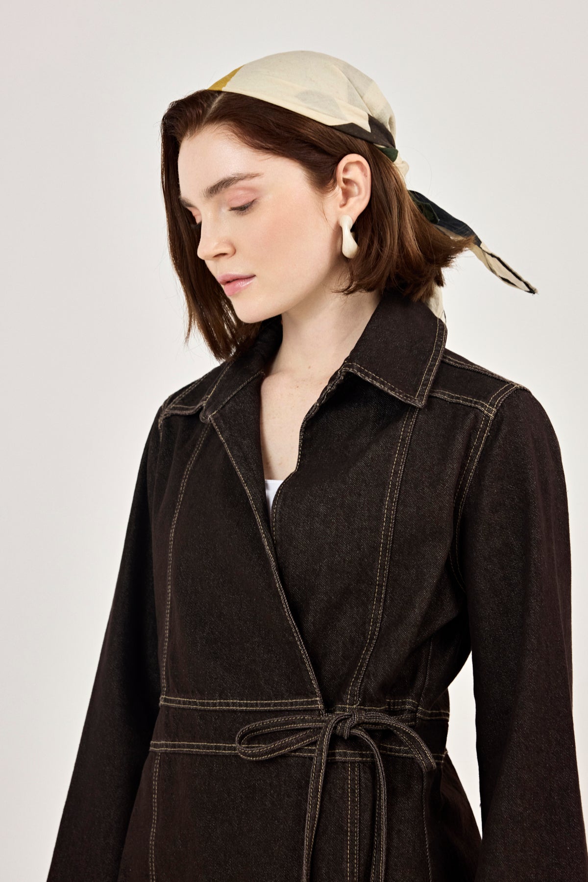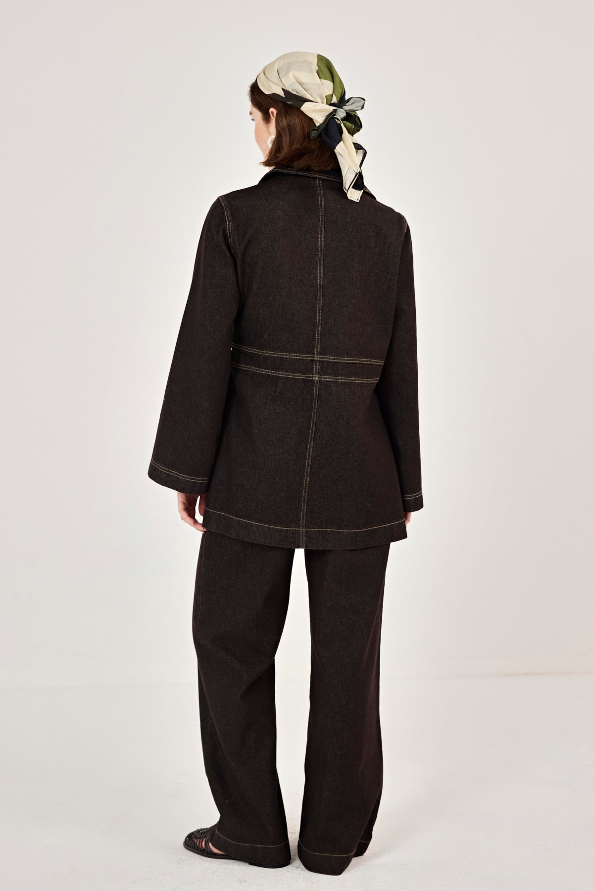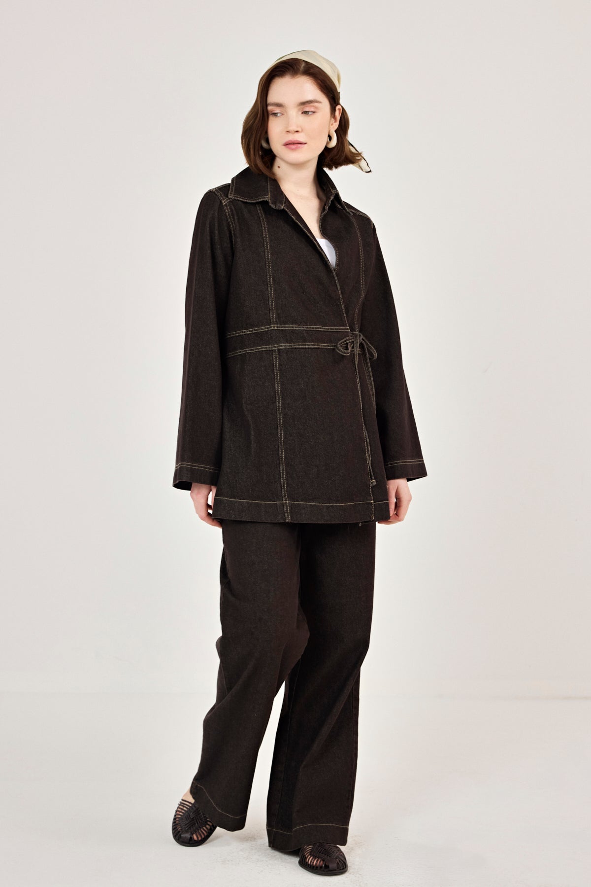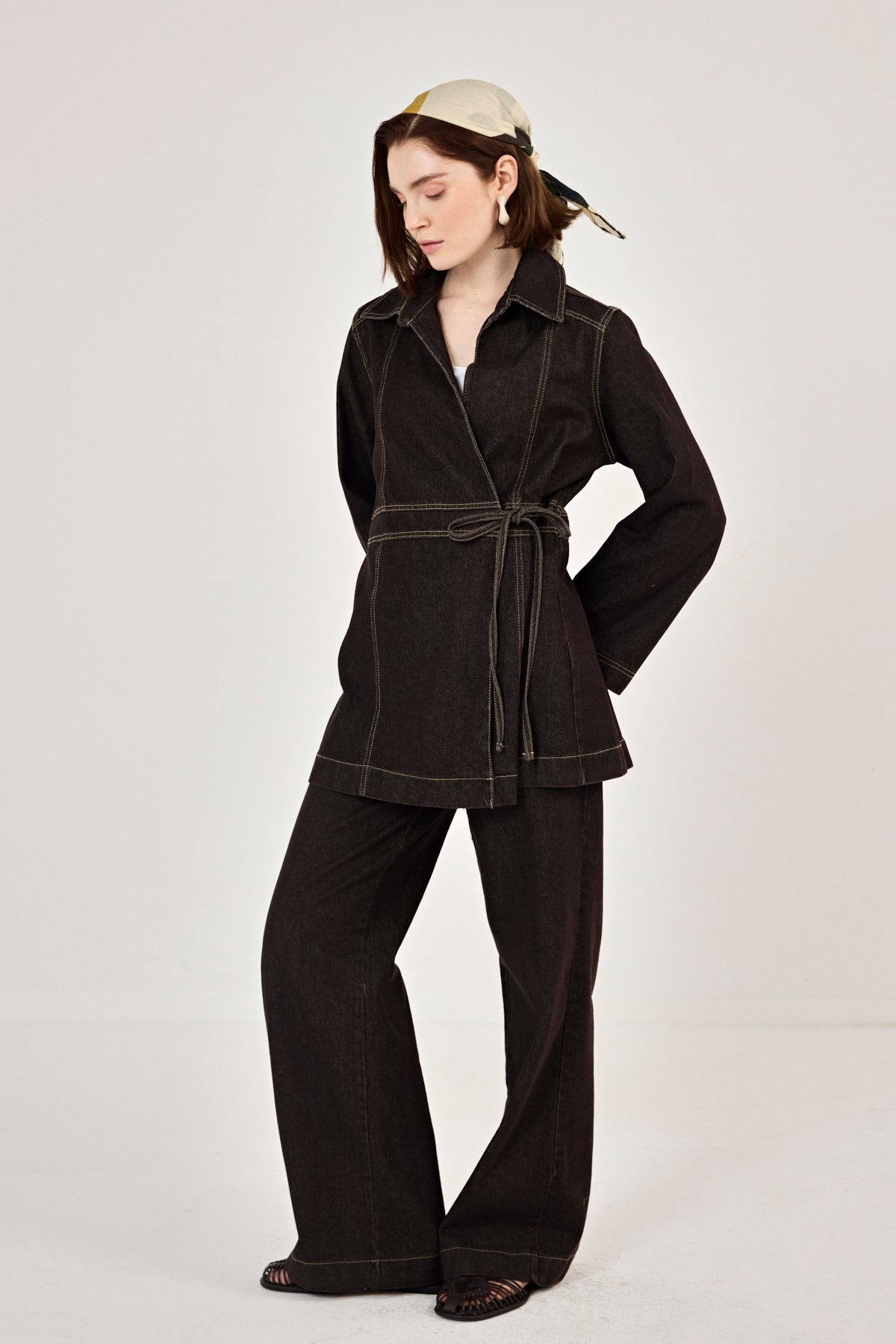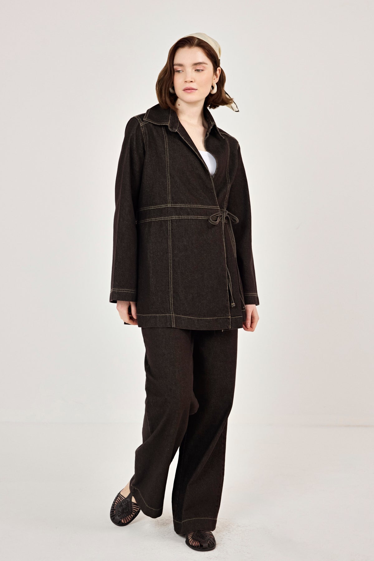 Kuruvaze Bağlamalı Ceket Pantolunlu Kot Takım Kahverengi