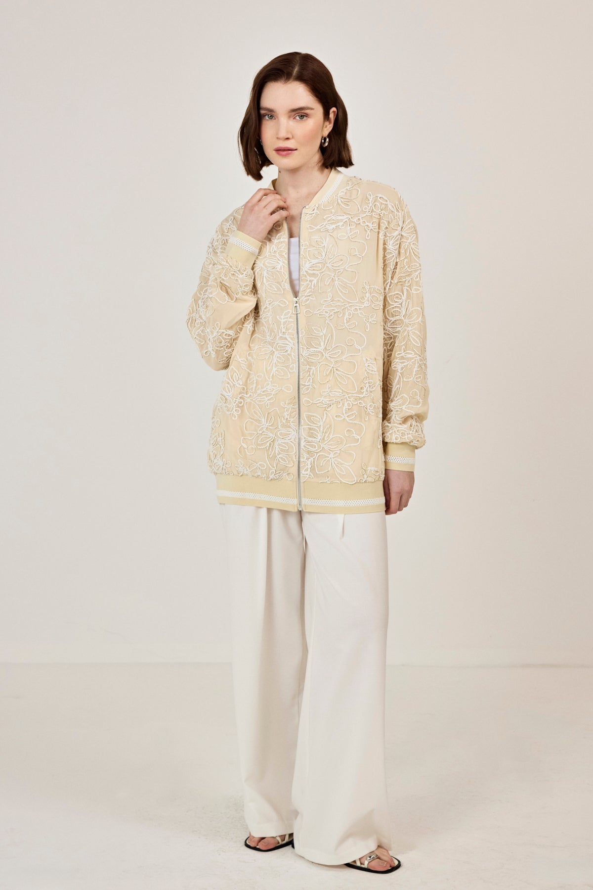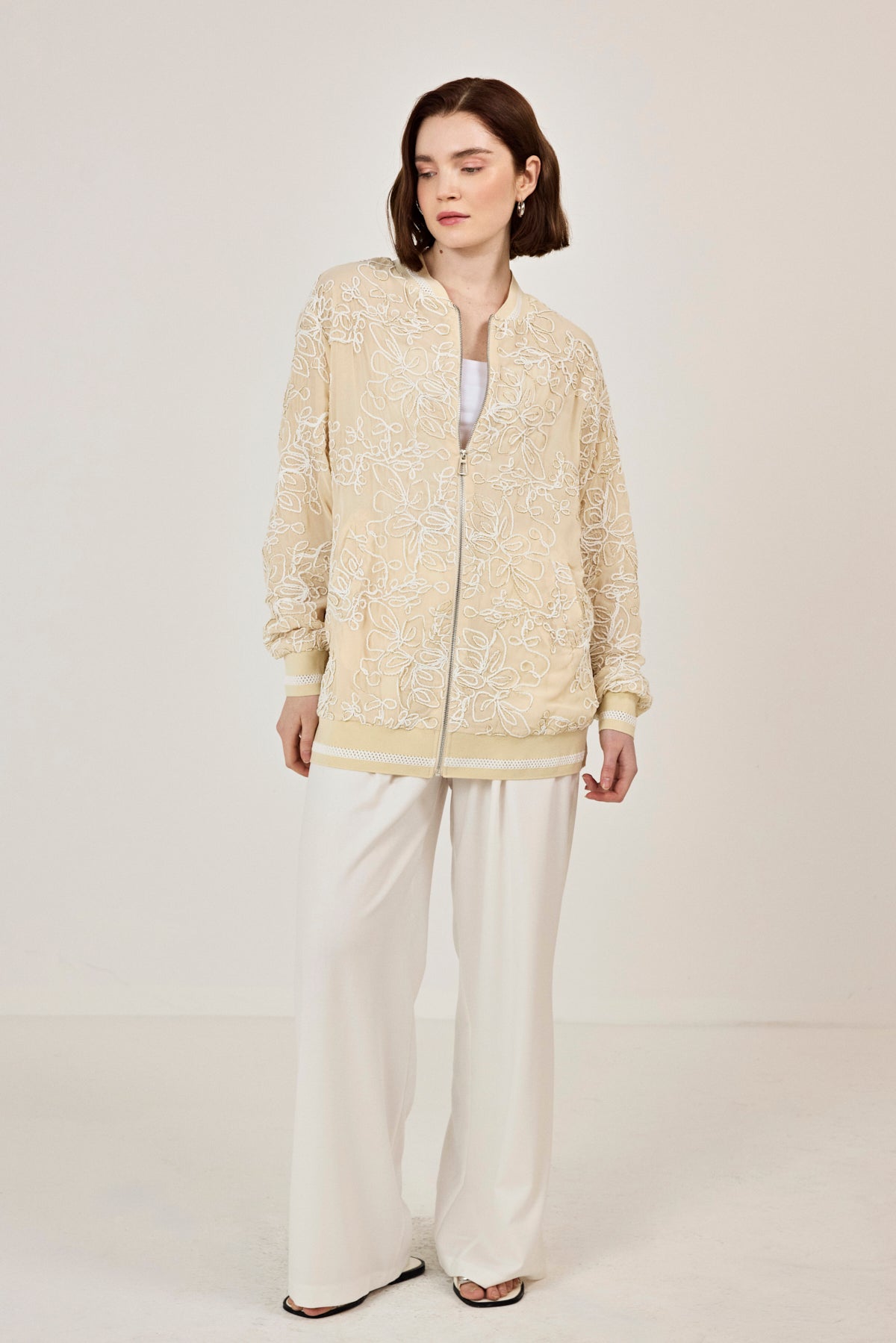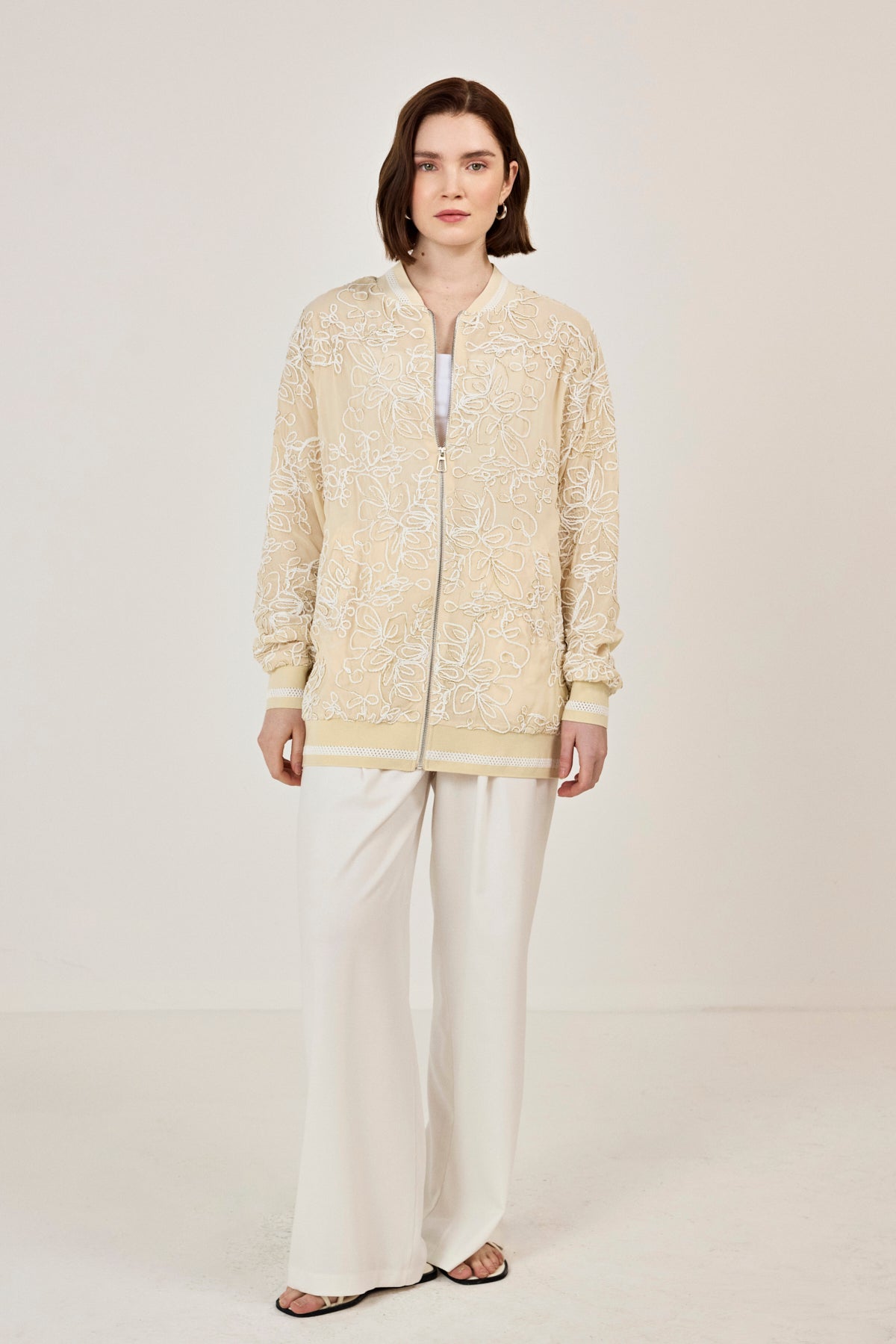 Nakışlı şifon Fermuar Detaylı Ceket Bej