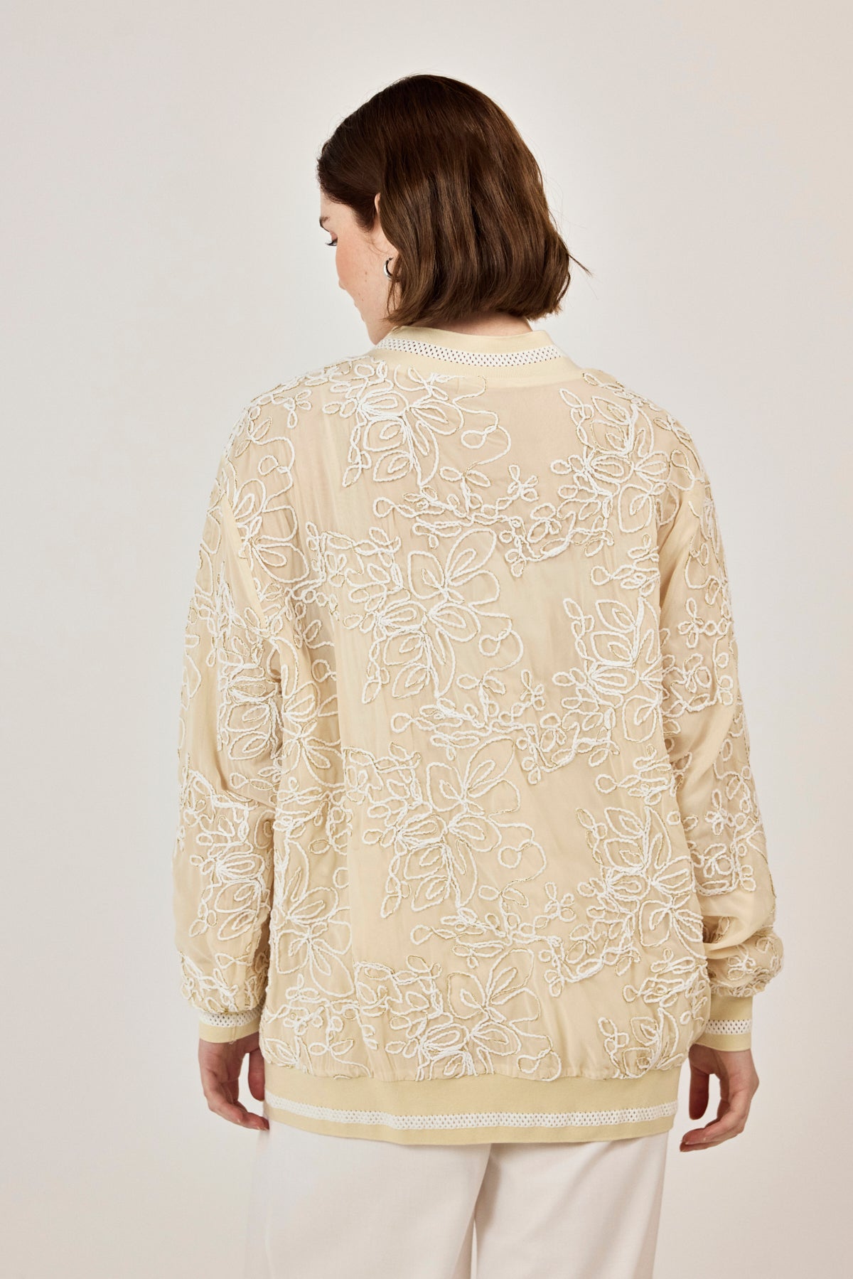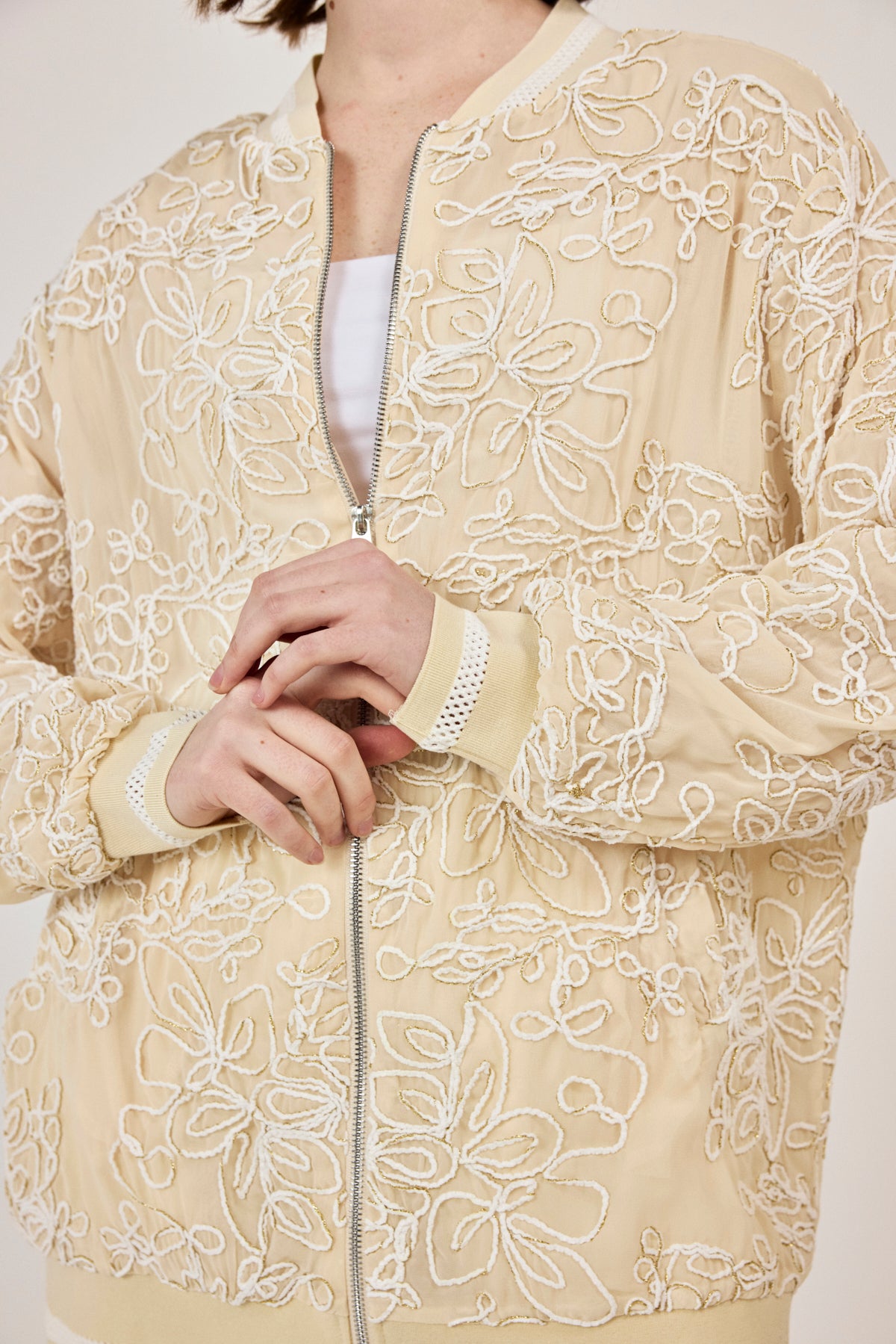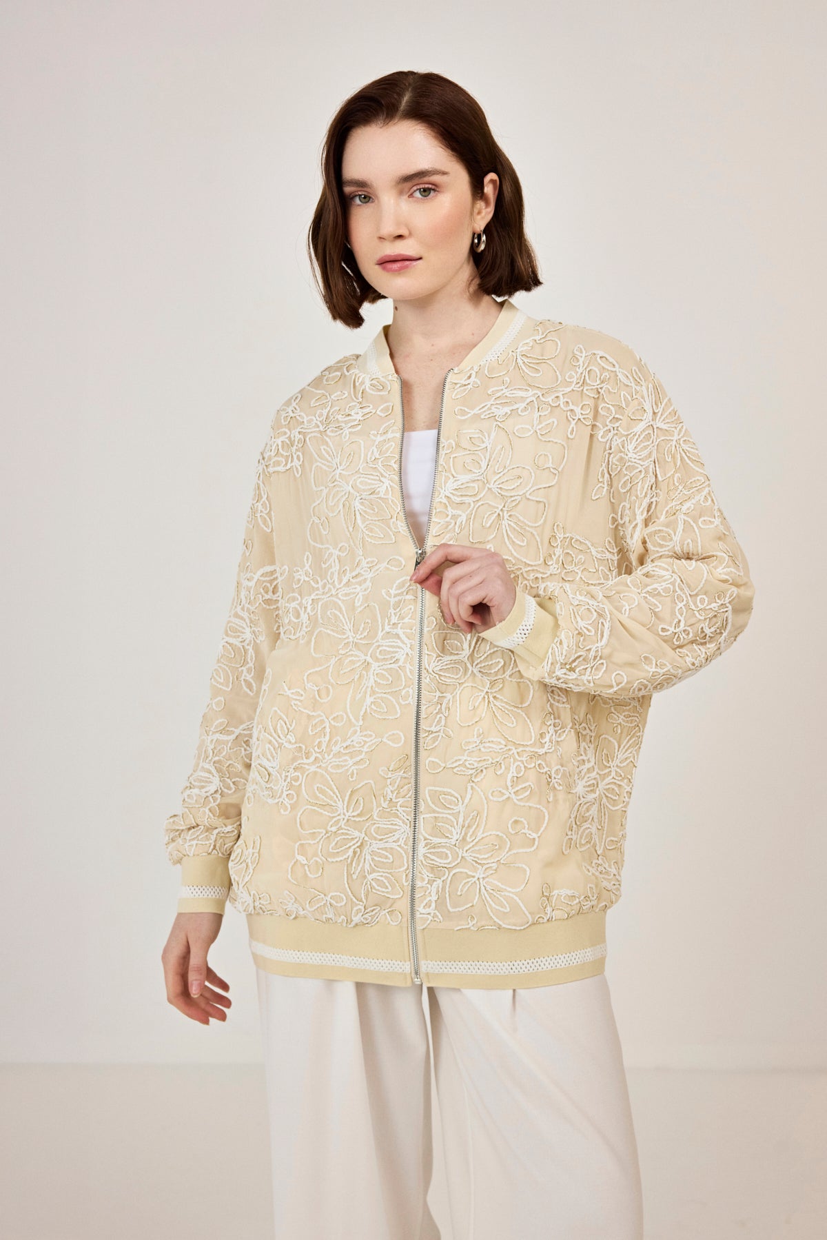 Nakışlı şifon Fermuar Detaylı Ceket Bej