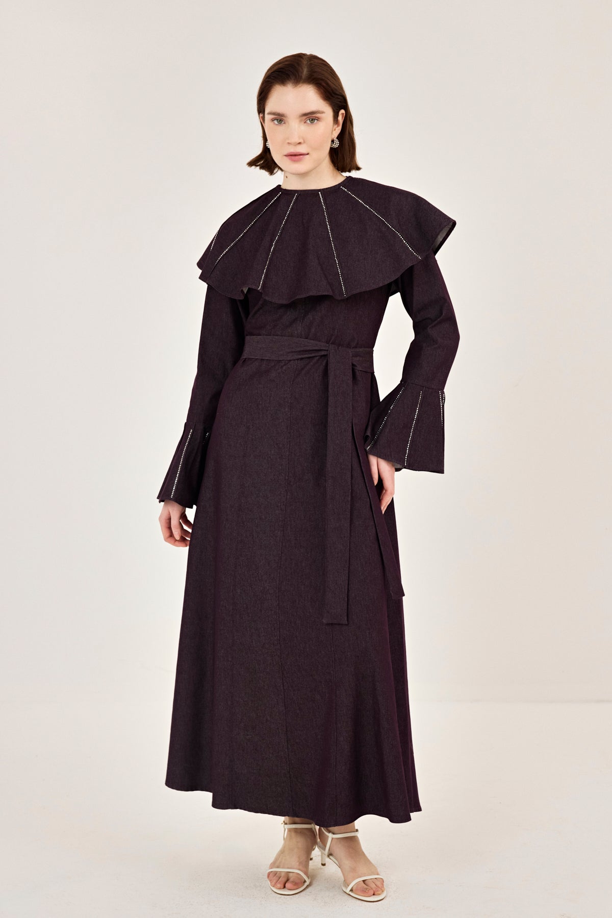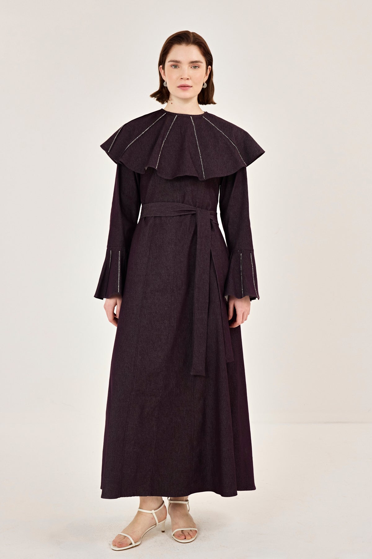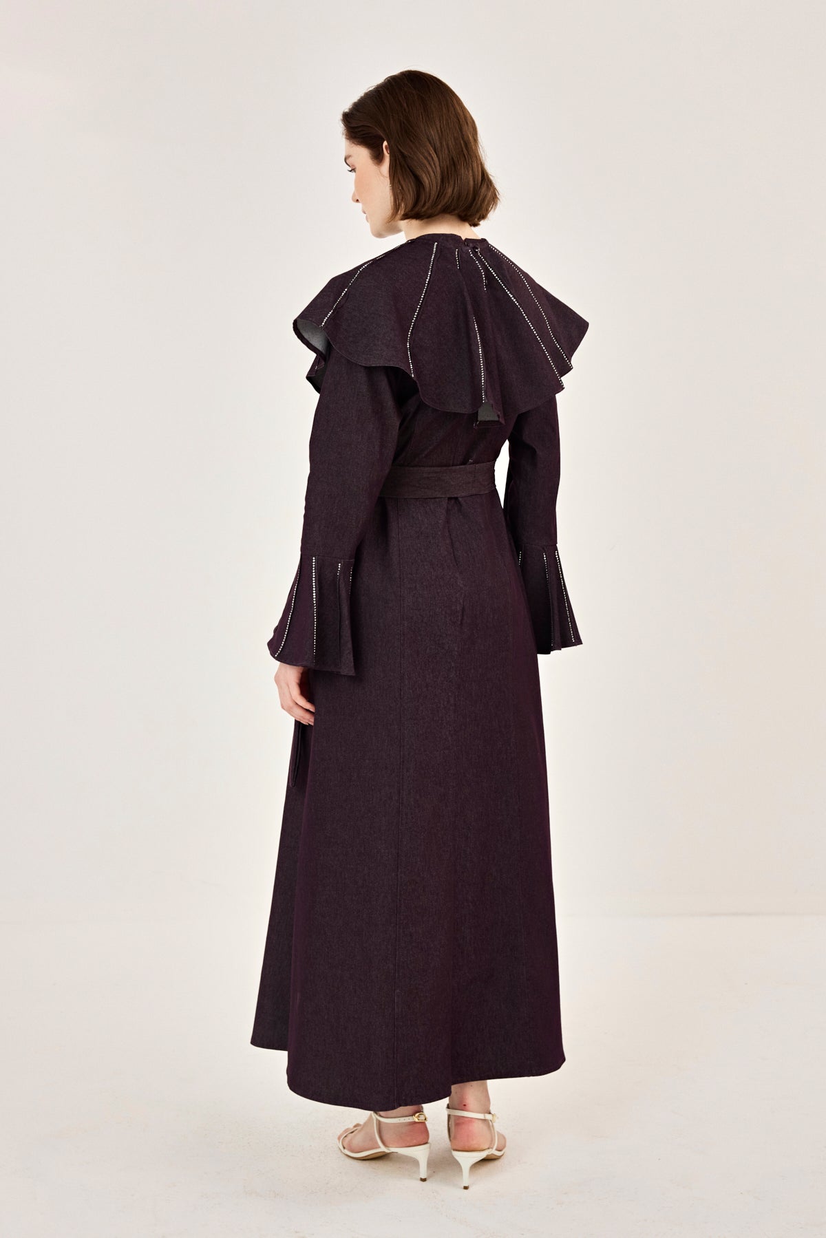 Pelerin Detaylı Taşlı Gabardin Elbise Burgonya