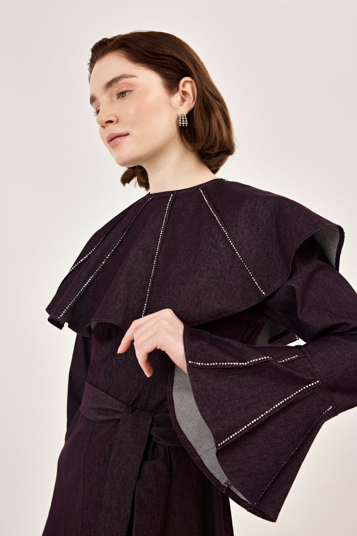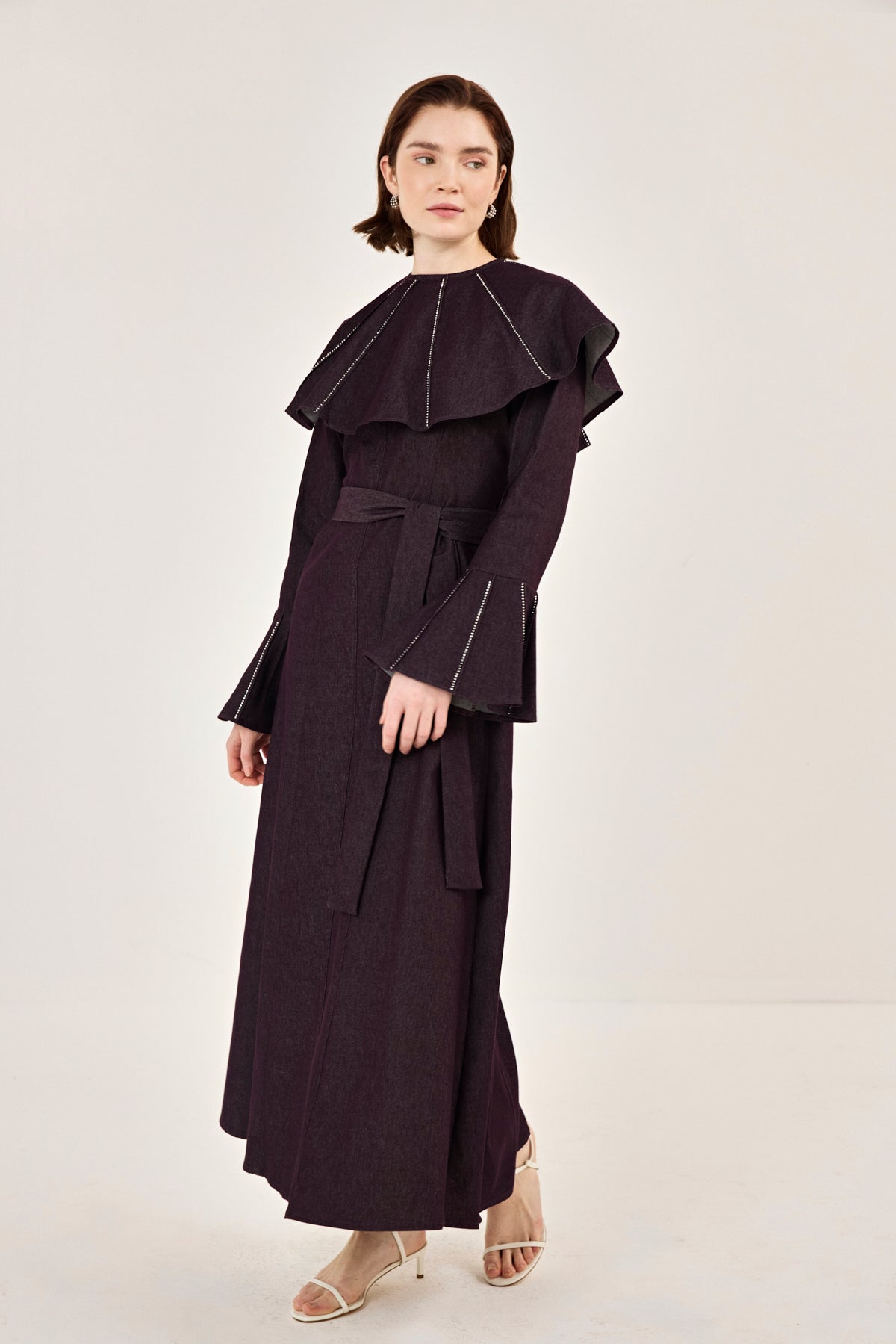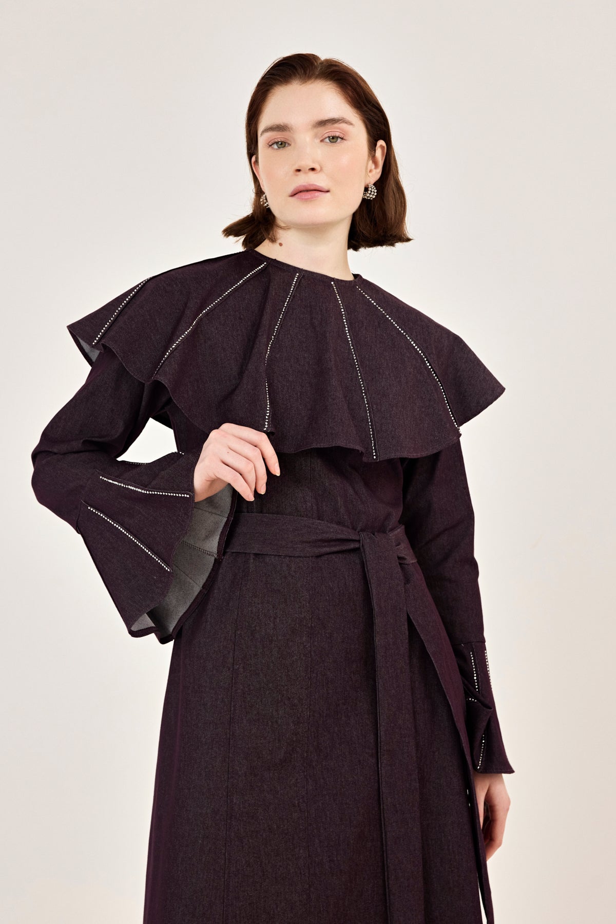 Pelerin Detaylı Taşlı Gabardin Elbise Burgonya
