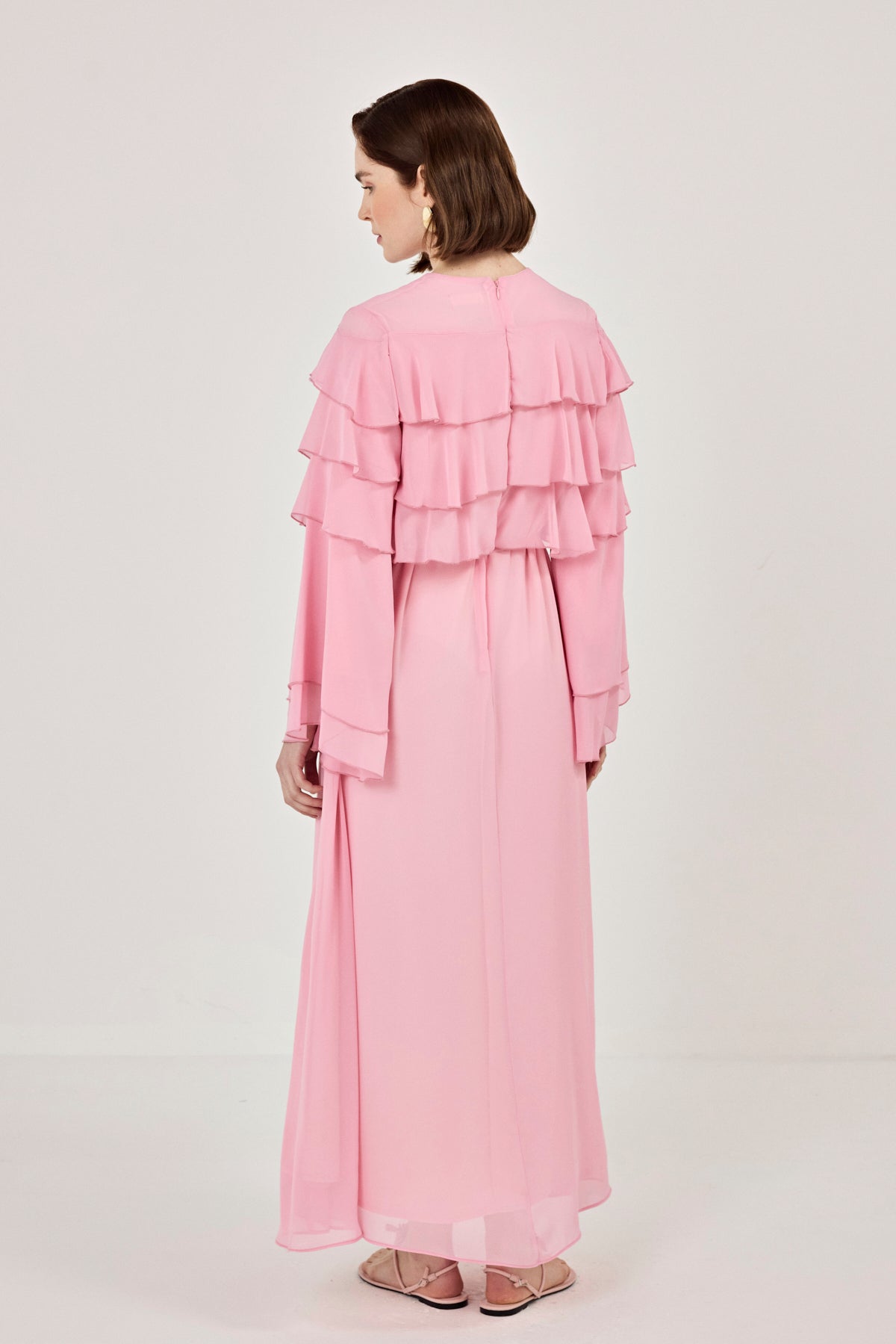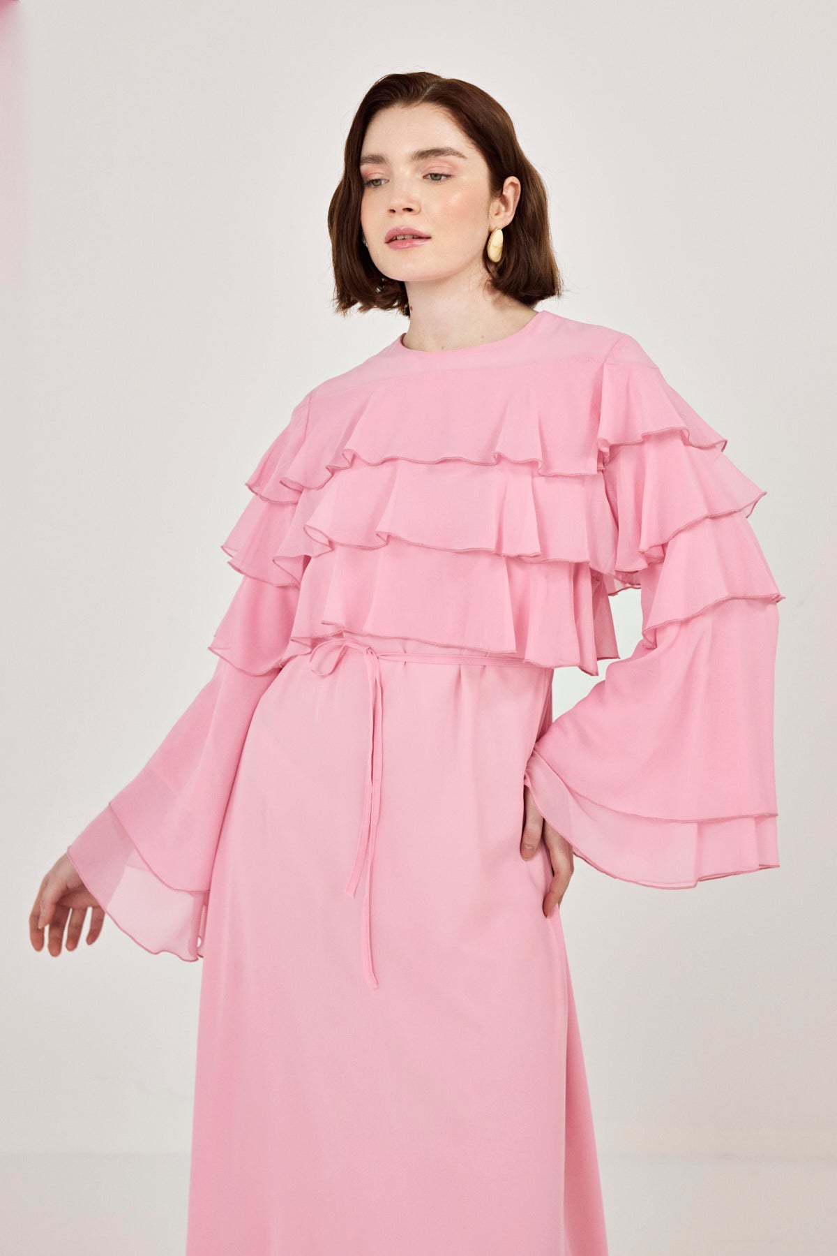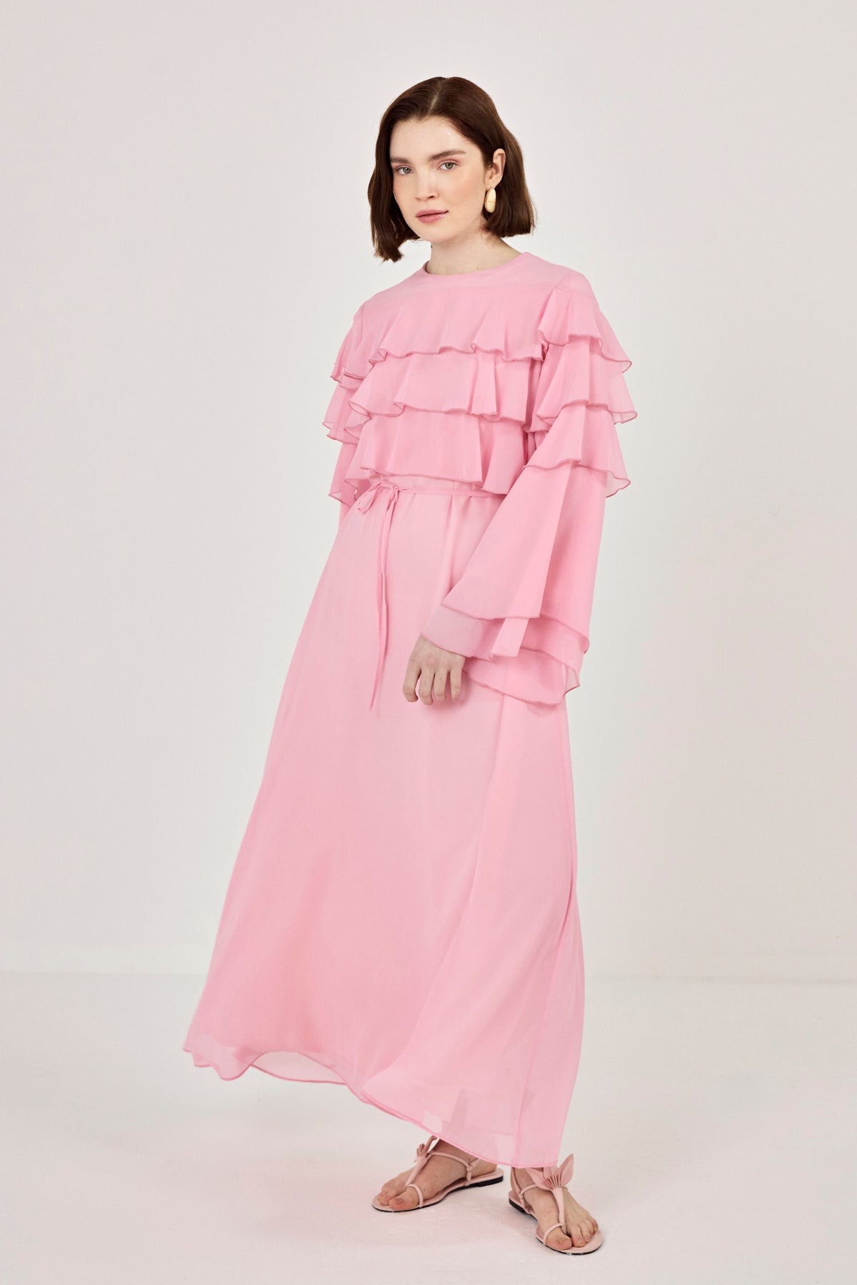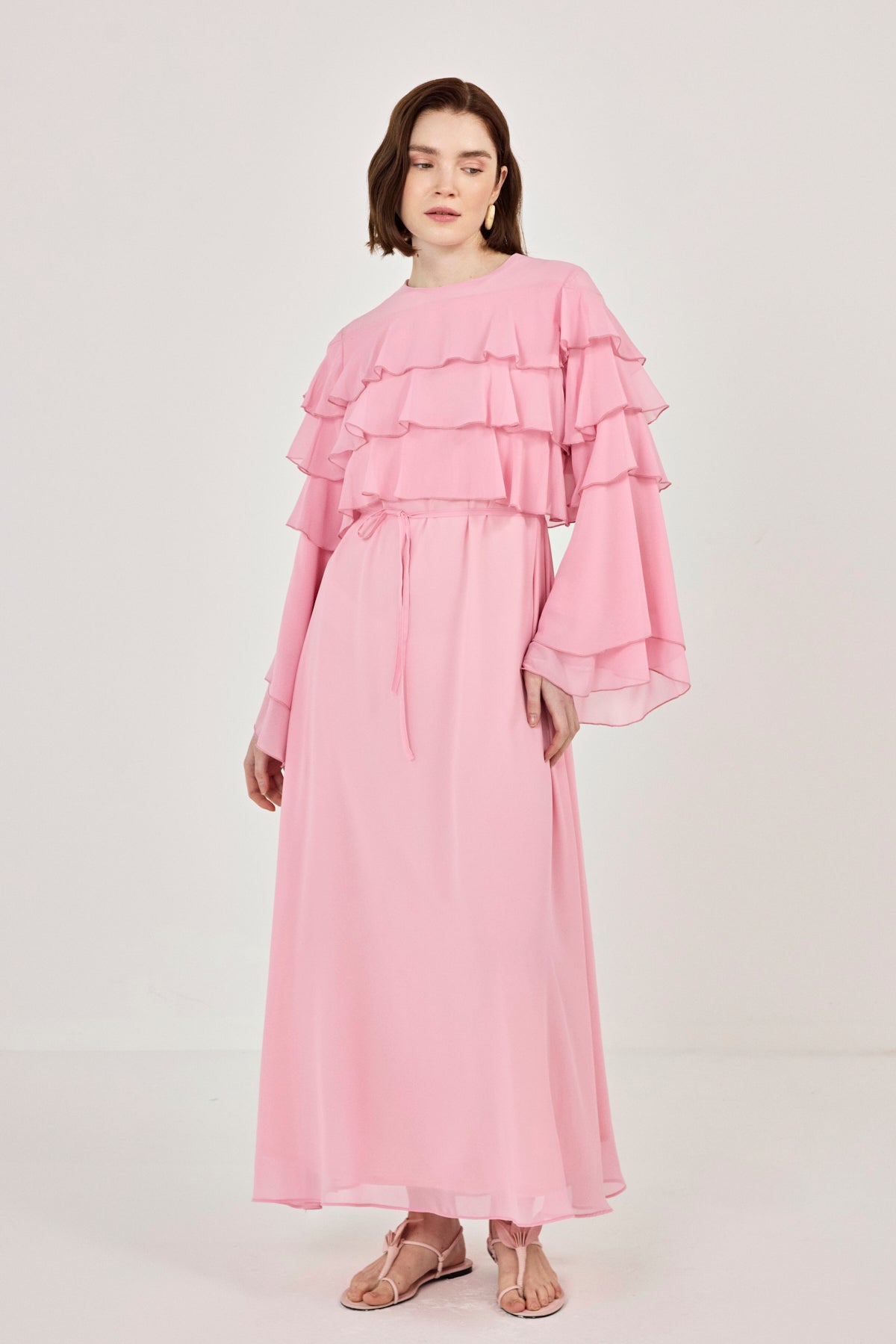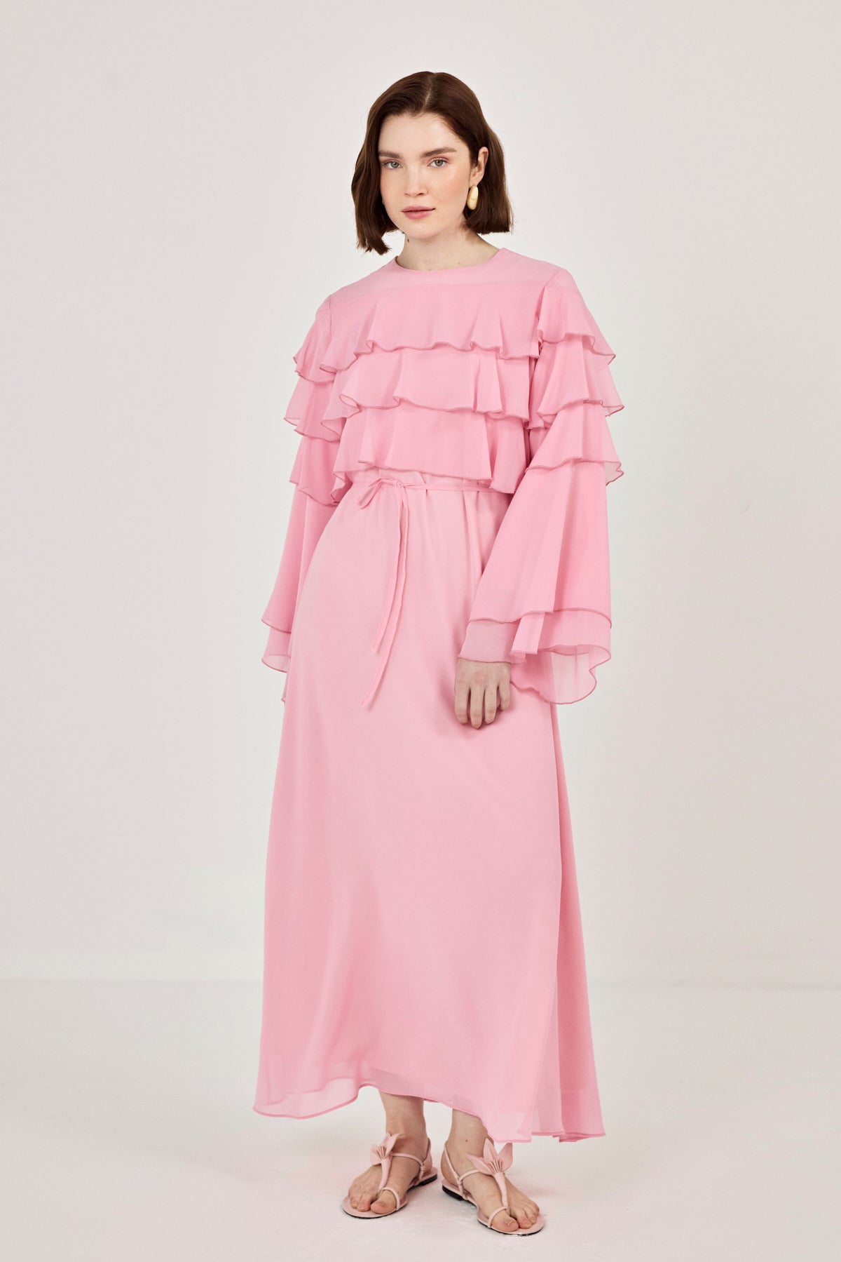 Robadan Fırfır Detaylı Biye Kemerli Şifon Elbise, zarif ve feminen tasarımıyla özel günlerden günlük şıklığa kadar geniş bir kullanım alanı sunar. Hafif ve akışkan şifon kumaşı sayesinde gün boyu konfor sağlarken, robadan başlayan fırfır detayları elbiseye romantik bir hava katar.
