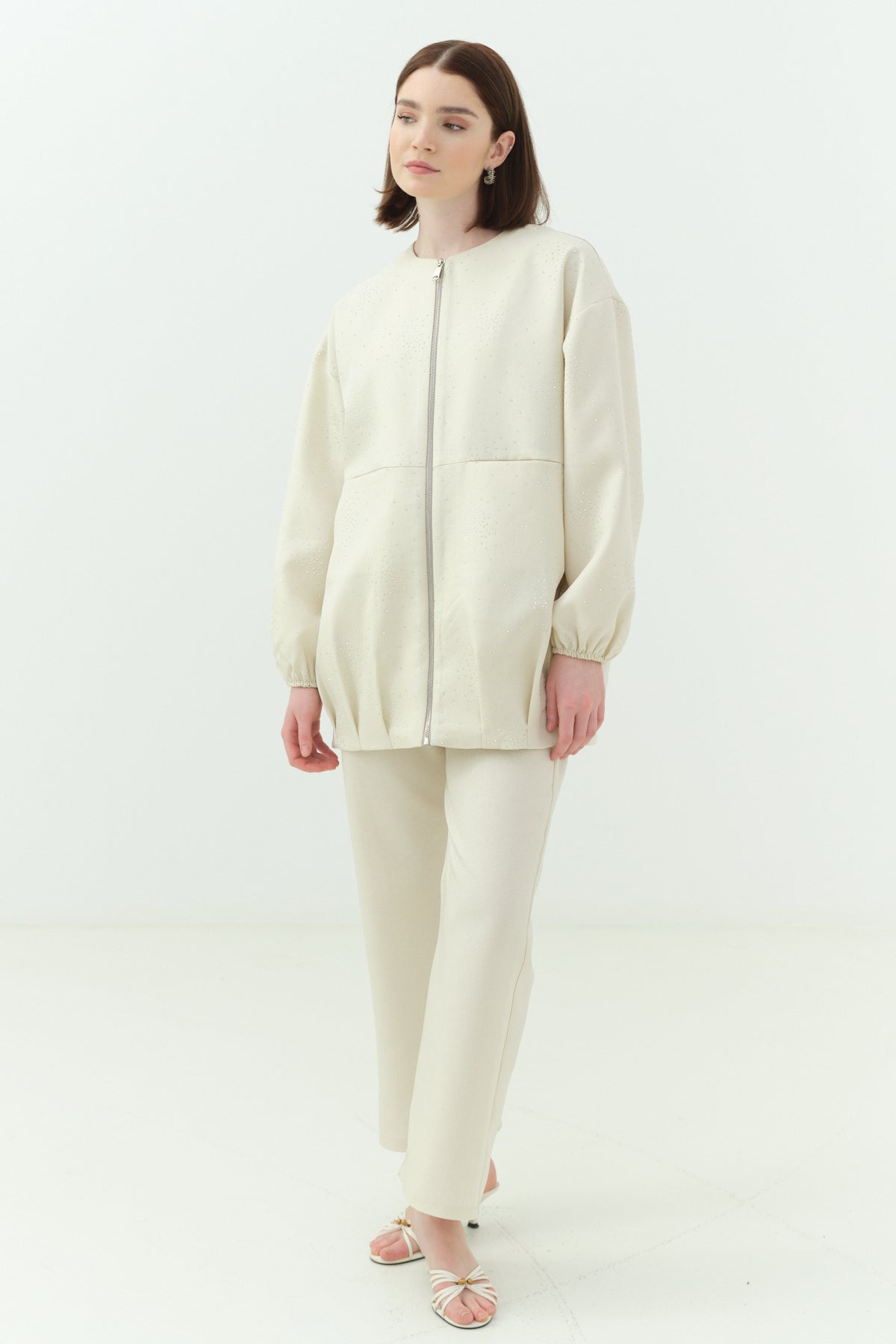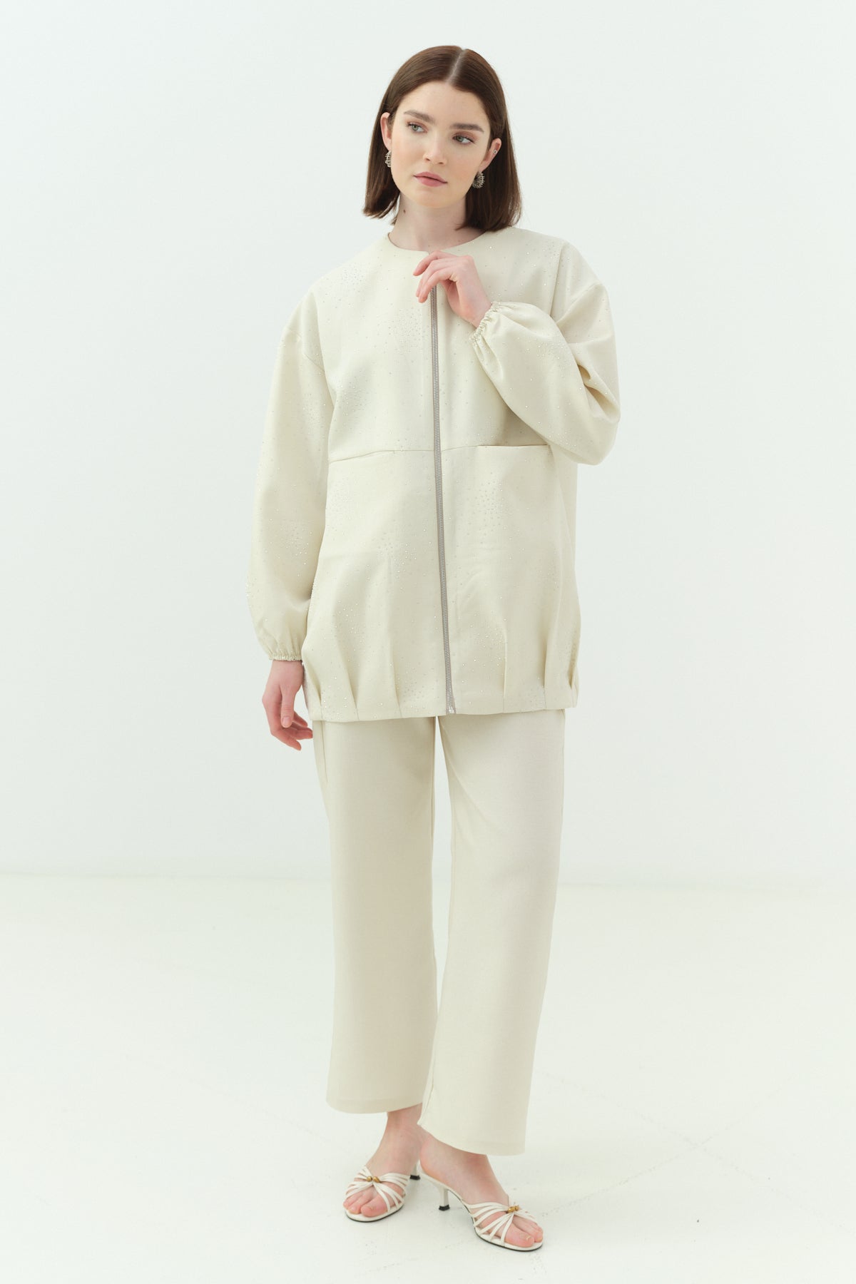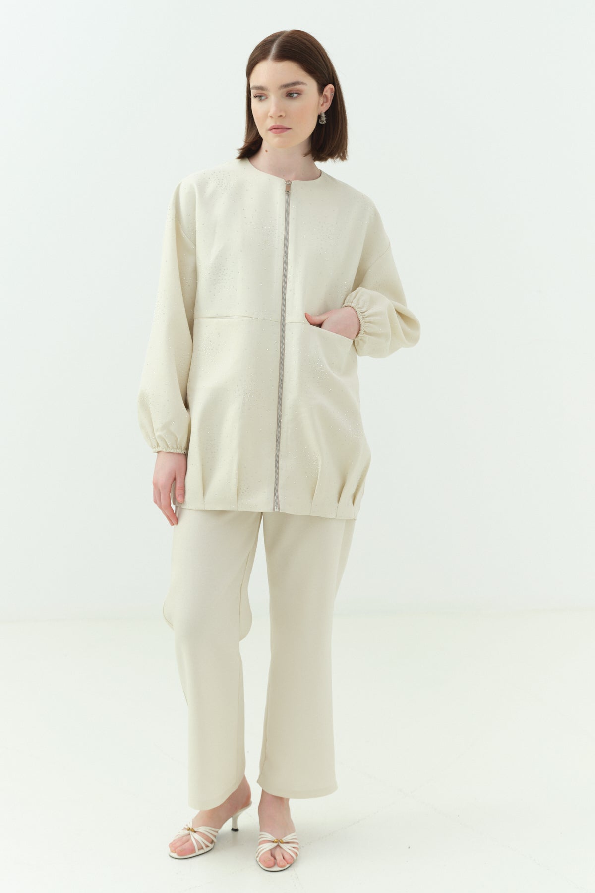 Taşlı Krep Ceket Pantonlu Takım Krem