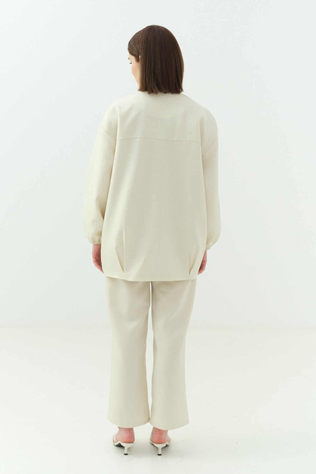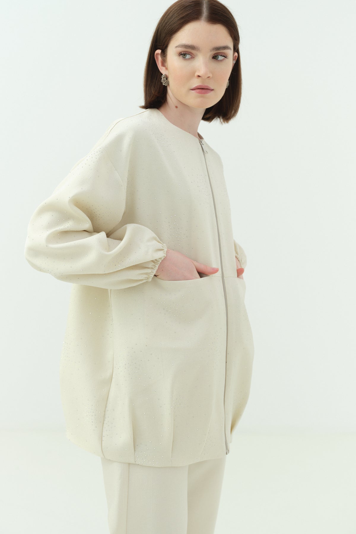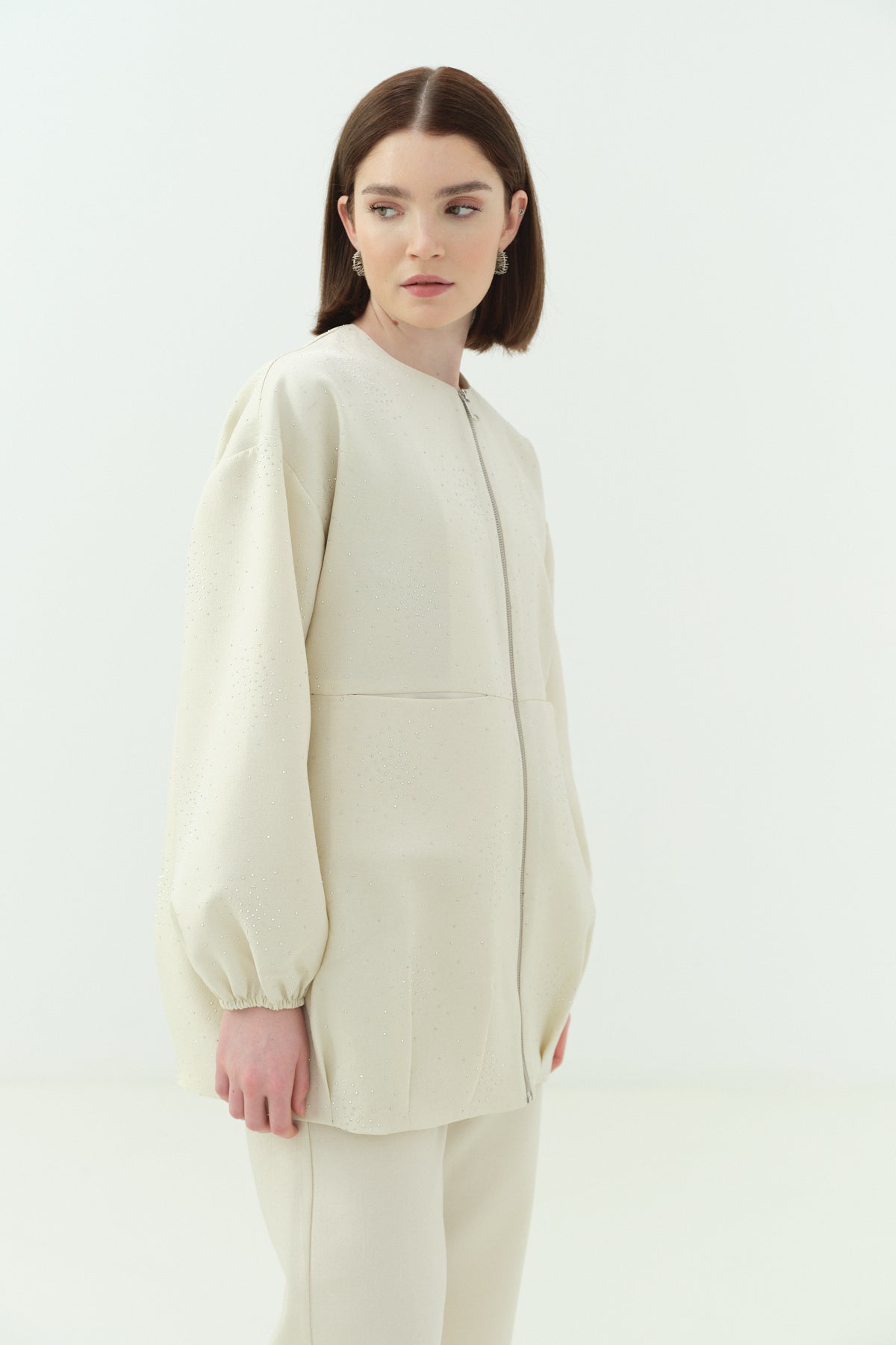 Taşlı Krep Ceket Pantonlu Takım Krem