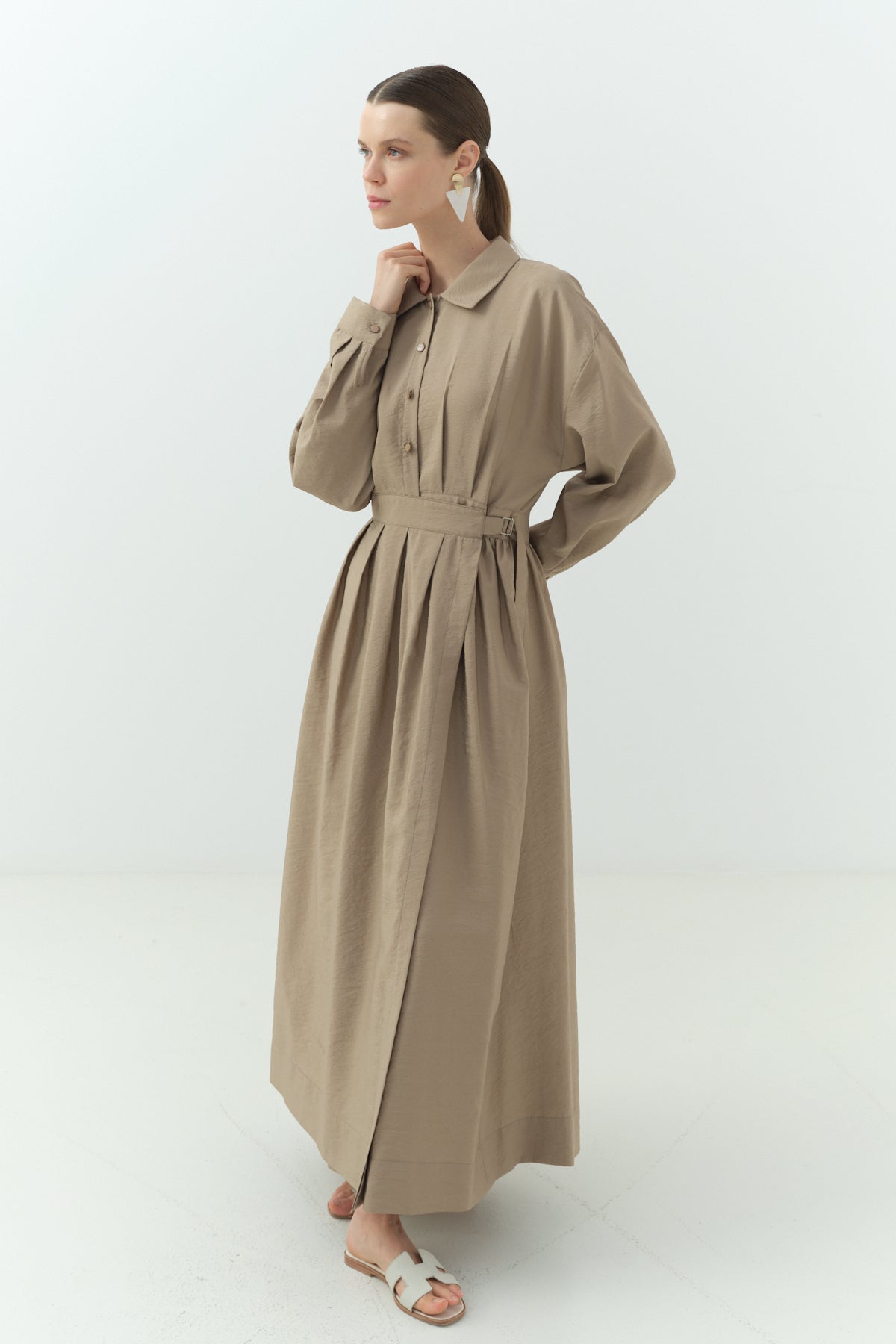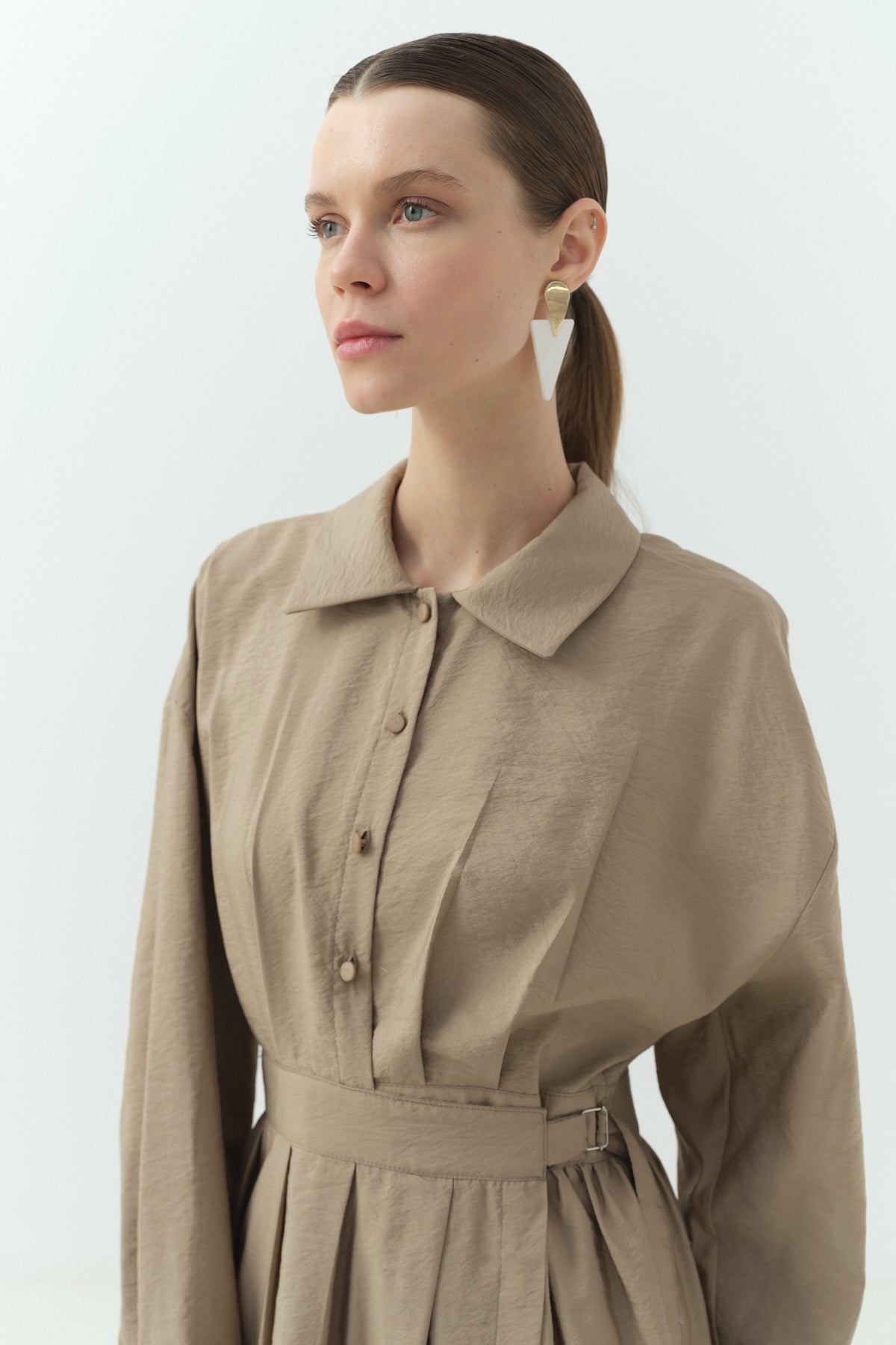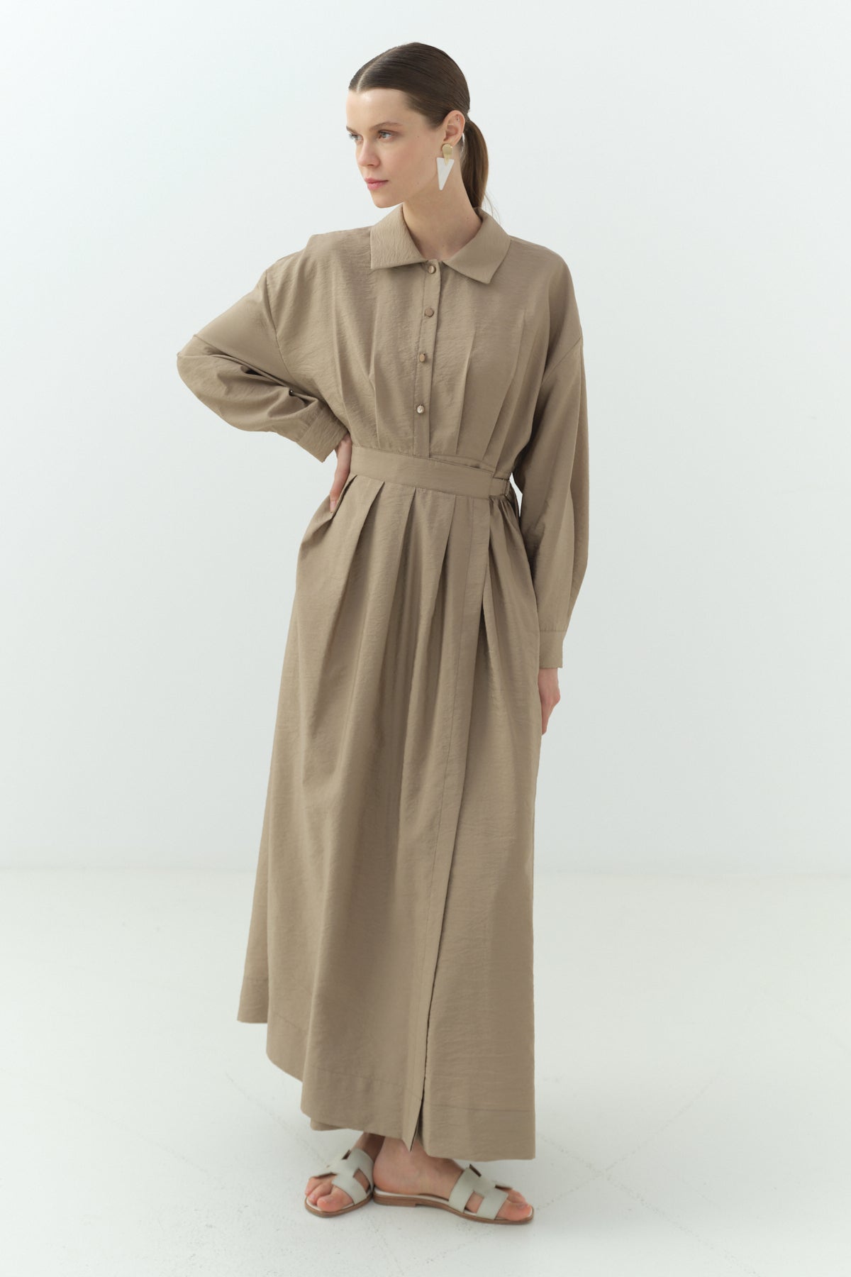 Yandan Bağlamalı Cupra Gömlek Yaka Elbise Camel