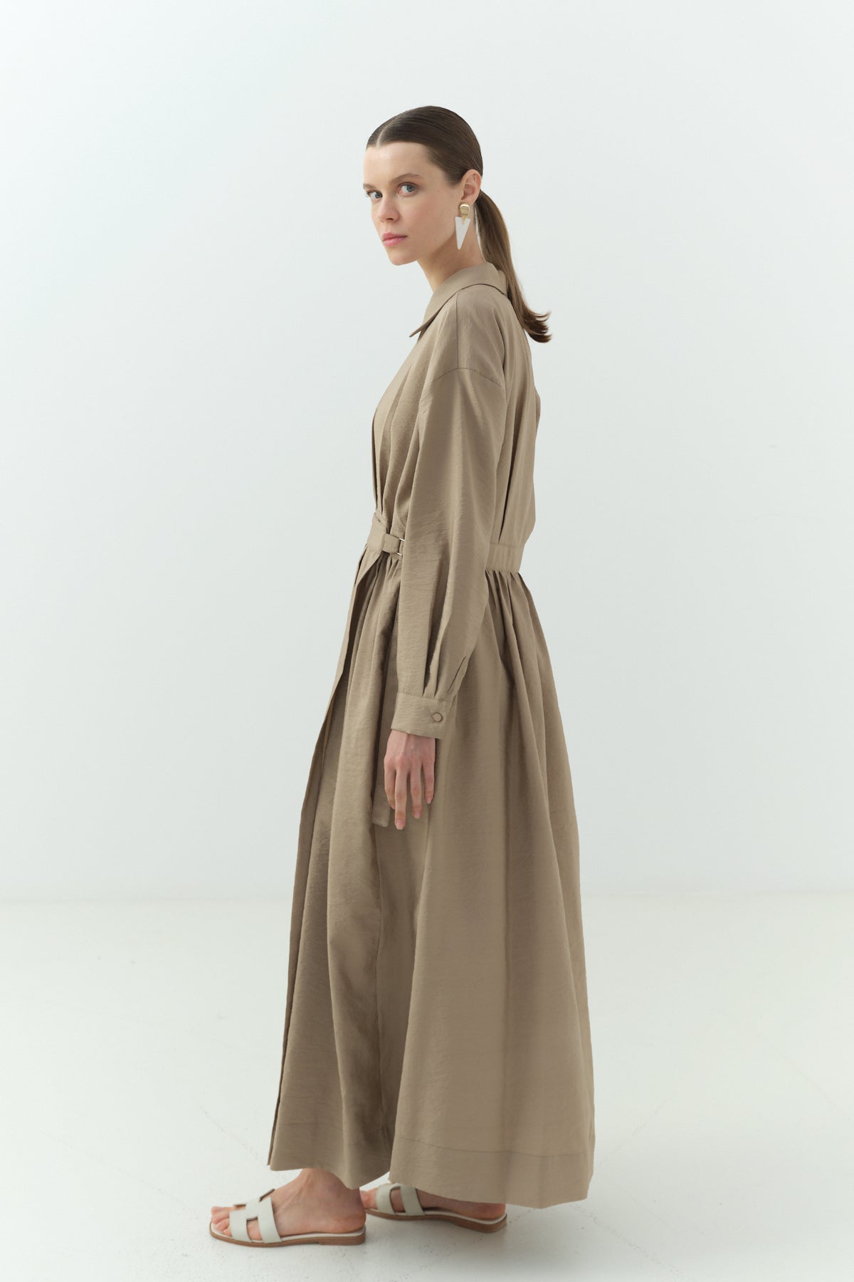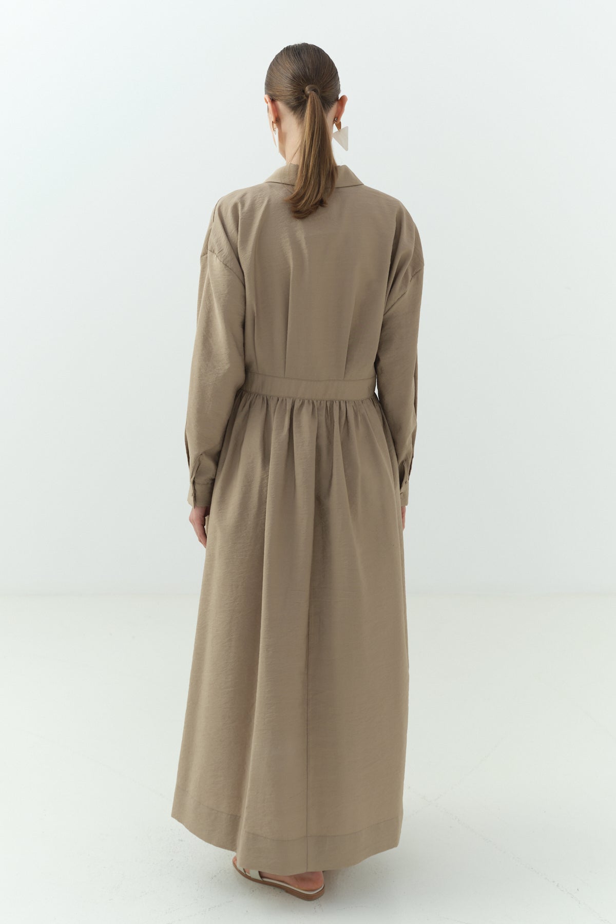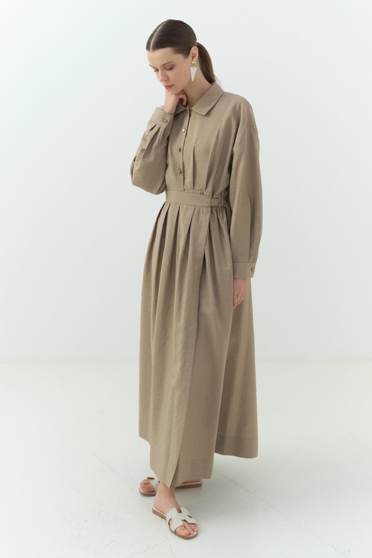 Yandan Bağlamalı Cupra Gömlek Yaka Elbise Camel