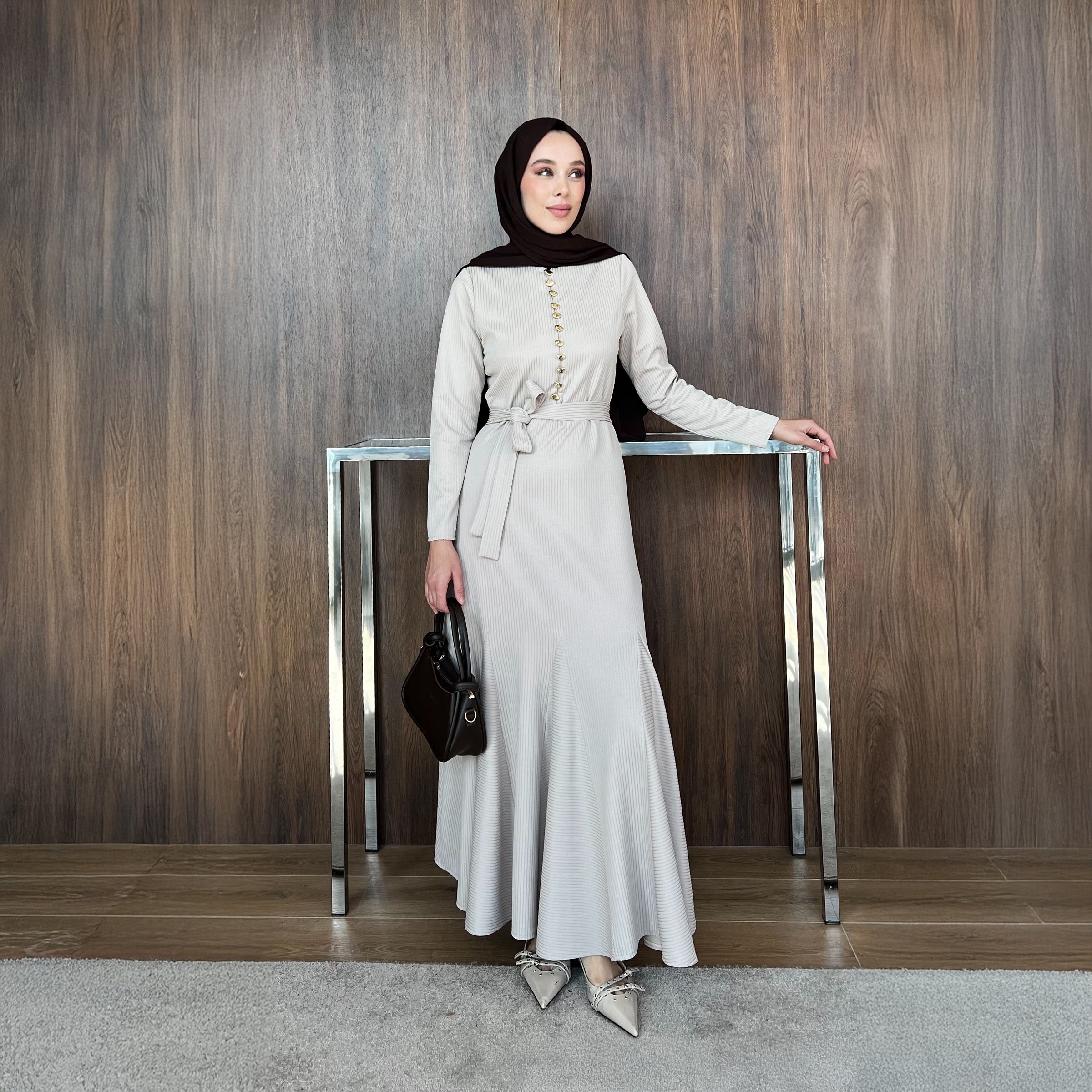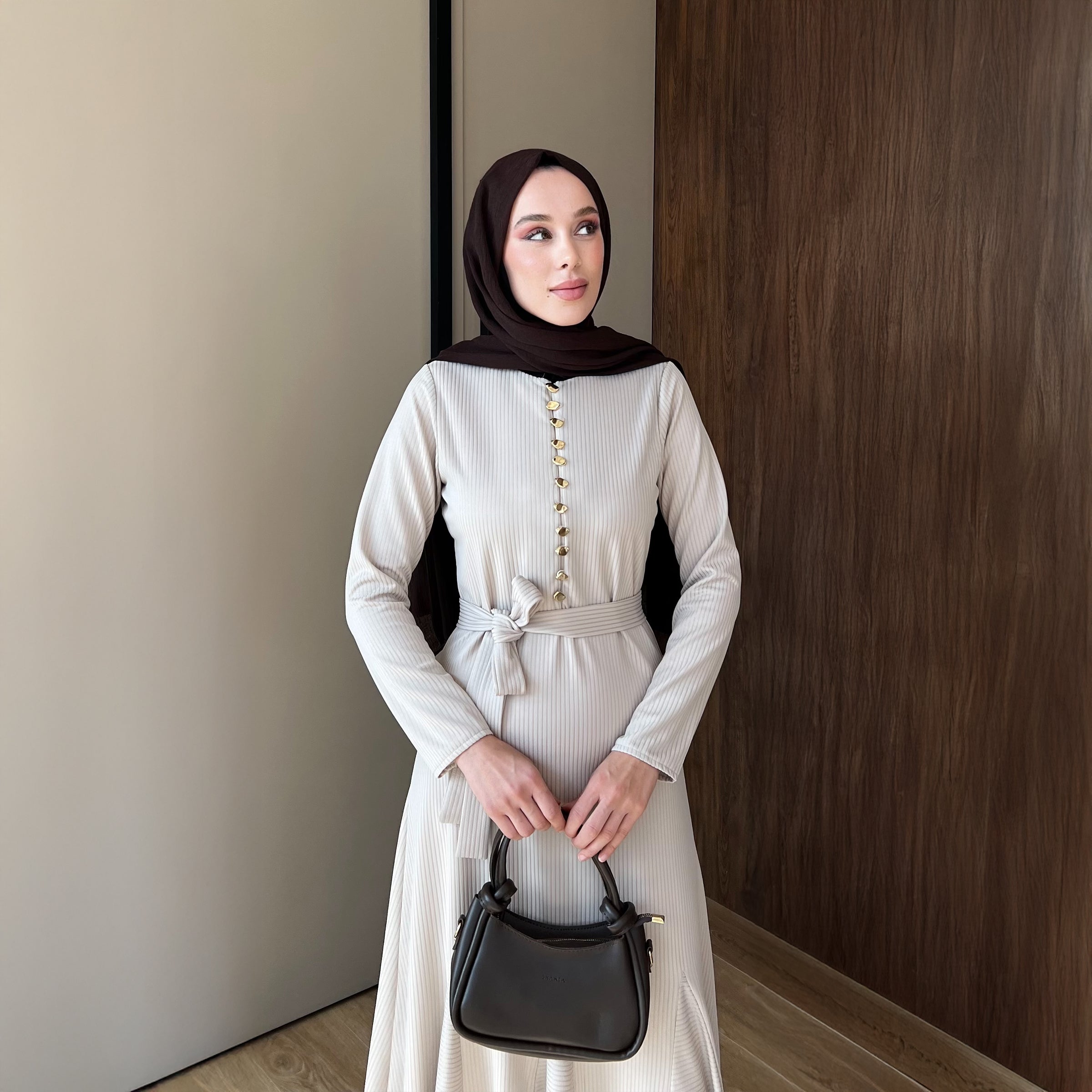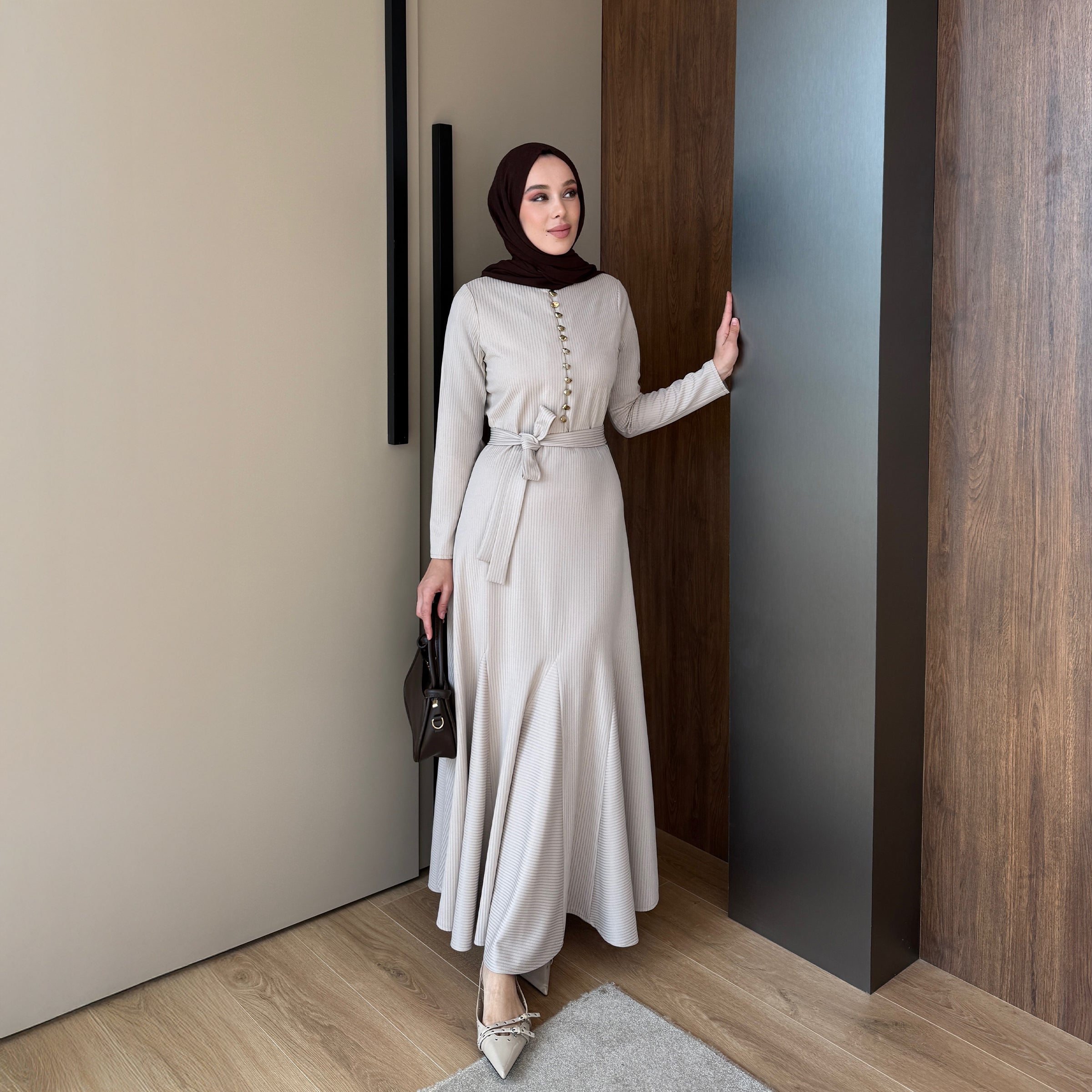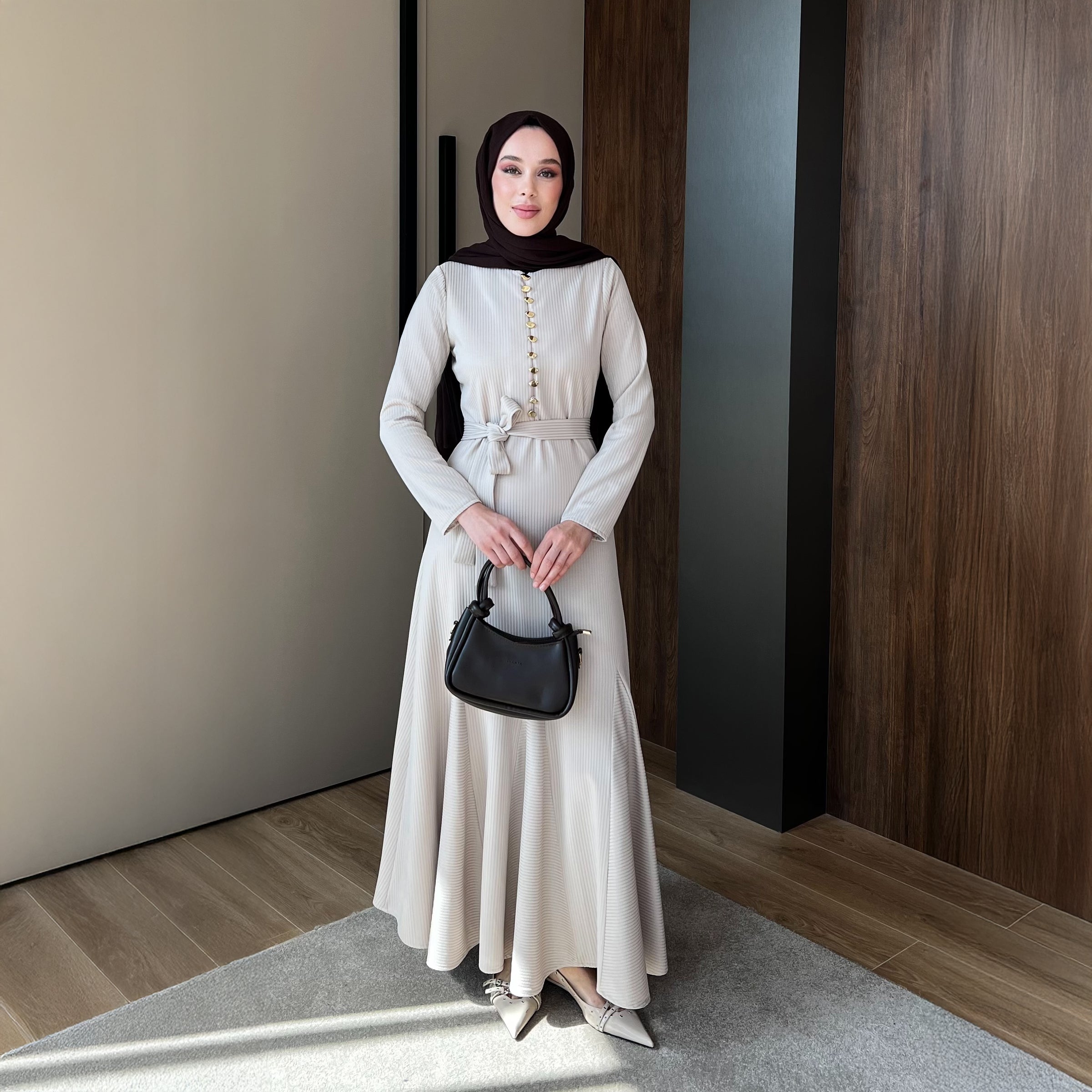 Sonbahar davetlerinde zarafetinizle bir adım öne çıkın. Bu özel tasarım elbise, modern ve minimalist bir silüeti, lüks detaylar ve vücudu saran feminen bir formla birleştiriyor. Akışkan ve dokulu kumaşı, her adımınızda size eşlik ederek hem konforlu hem de unutulmaz bir şıklık vadediyor.